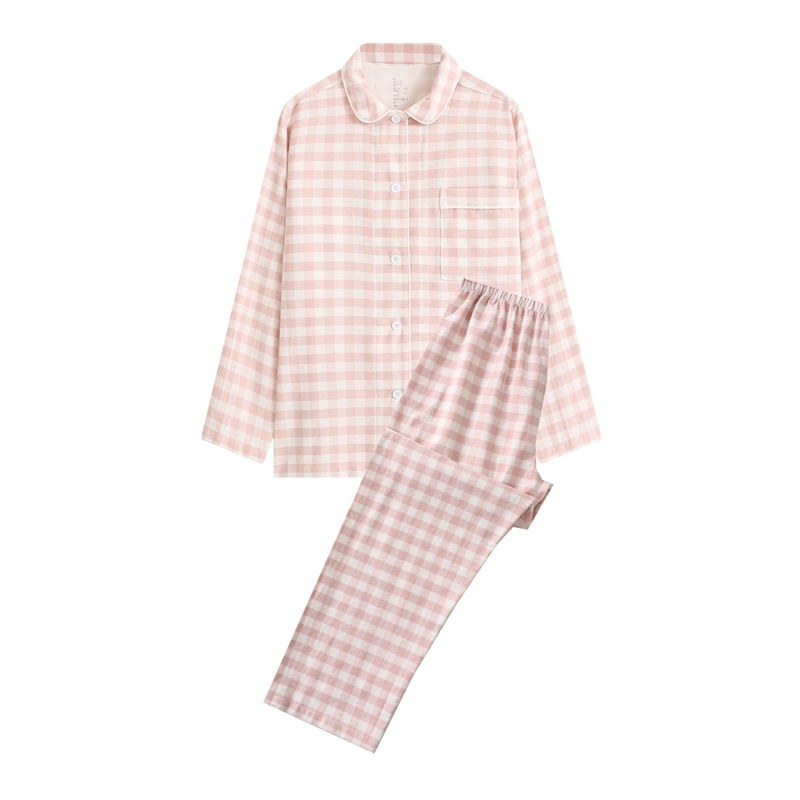 商品名称:伊嫚家居 2025新款无印日式双股全棉法兰绒家居服良品睡衣女纯棉直播秋冬款情侣睡衣 粉色小格