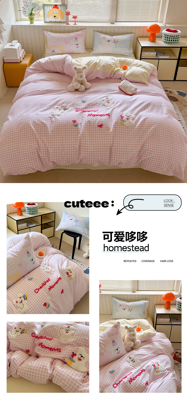 (总)美乐迪家纺 2026新款云感双层纱贴布绣四件套,睡货小狗,兔头小猫
