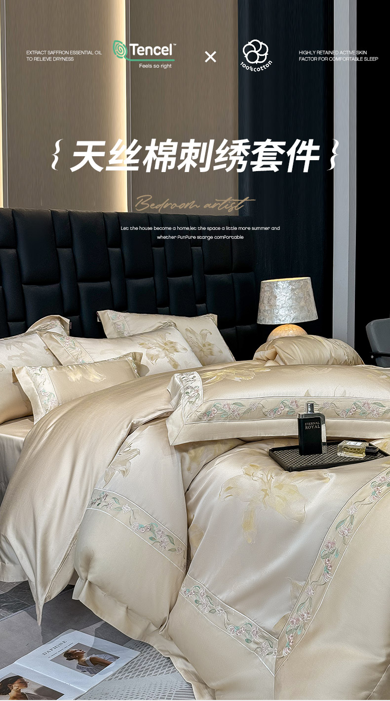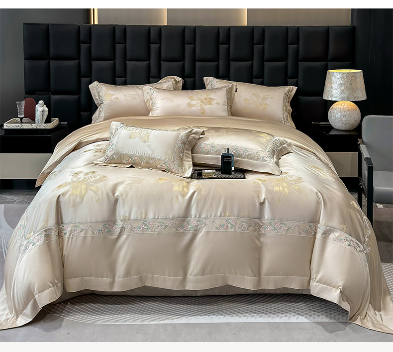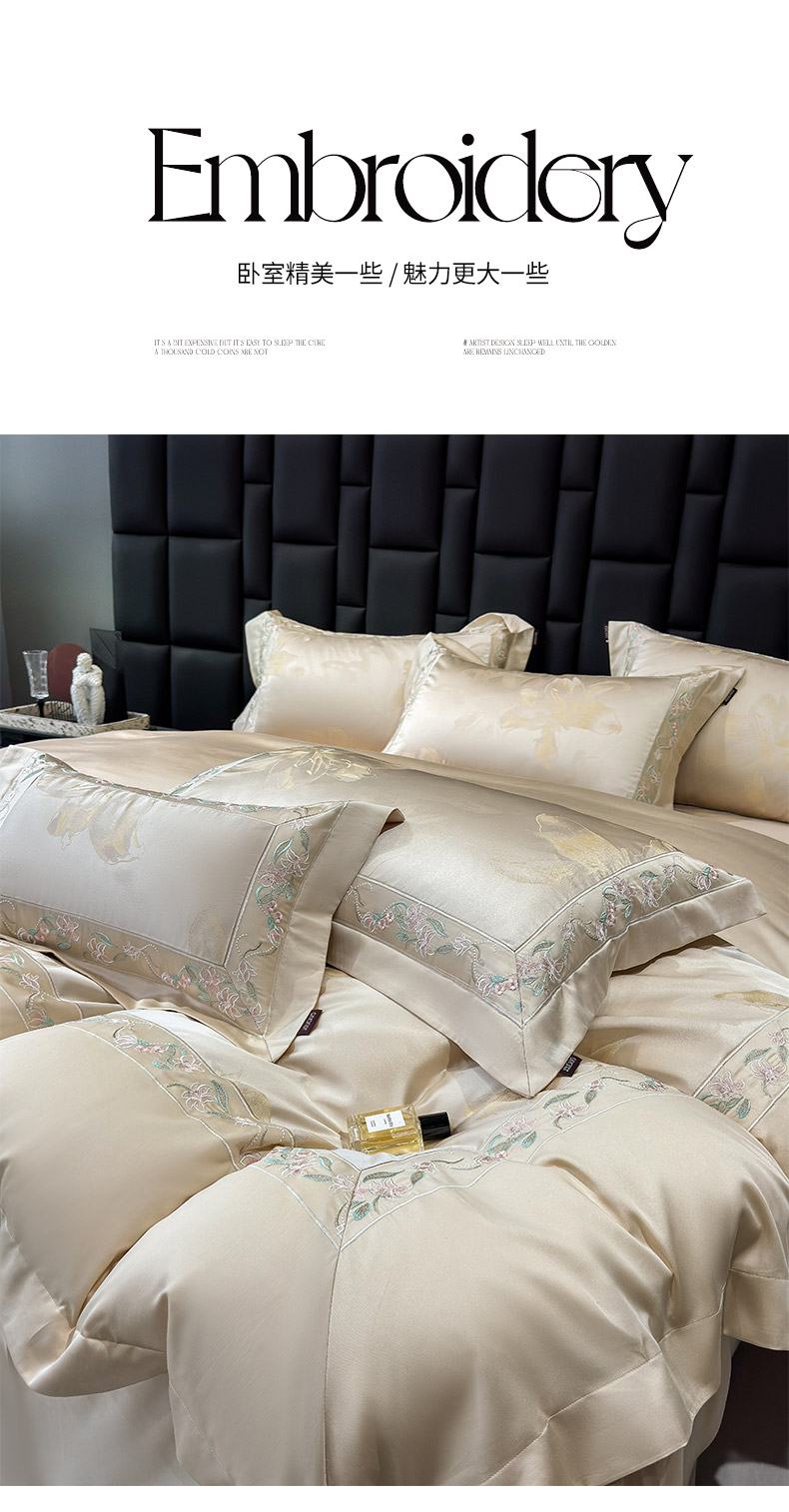 商品名称: 2025新款高端A类天丝棉提花四件套真丝轻奢刺绣丝滑裸睡长绒棉爆款床上用品-薇澜 薇澜-太妃金