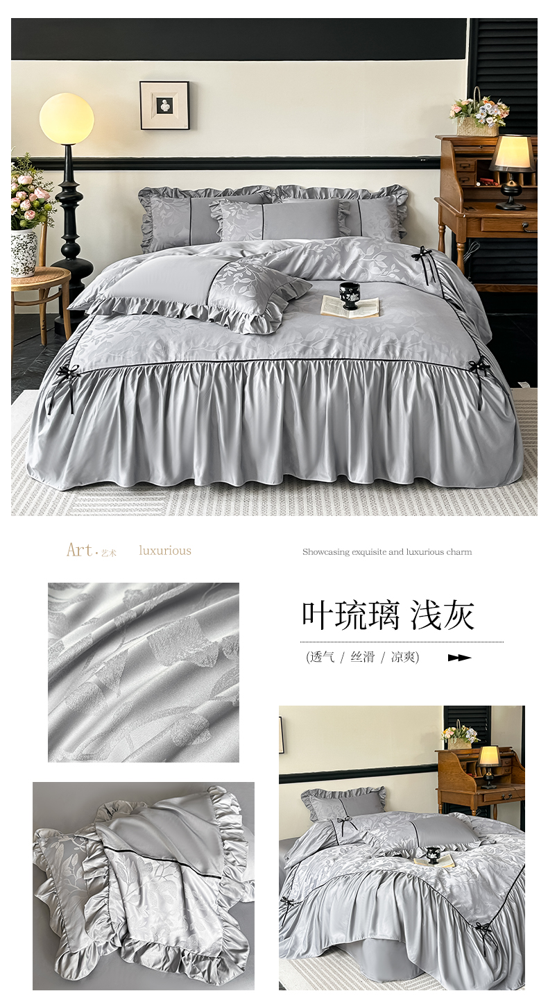商品名称:凯美家居 2025新款法式风水洗真丝提花工艺四件套 叶琉璃 浅灰