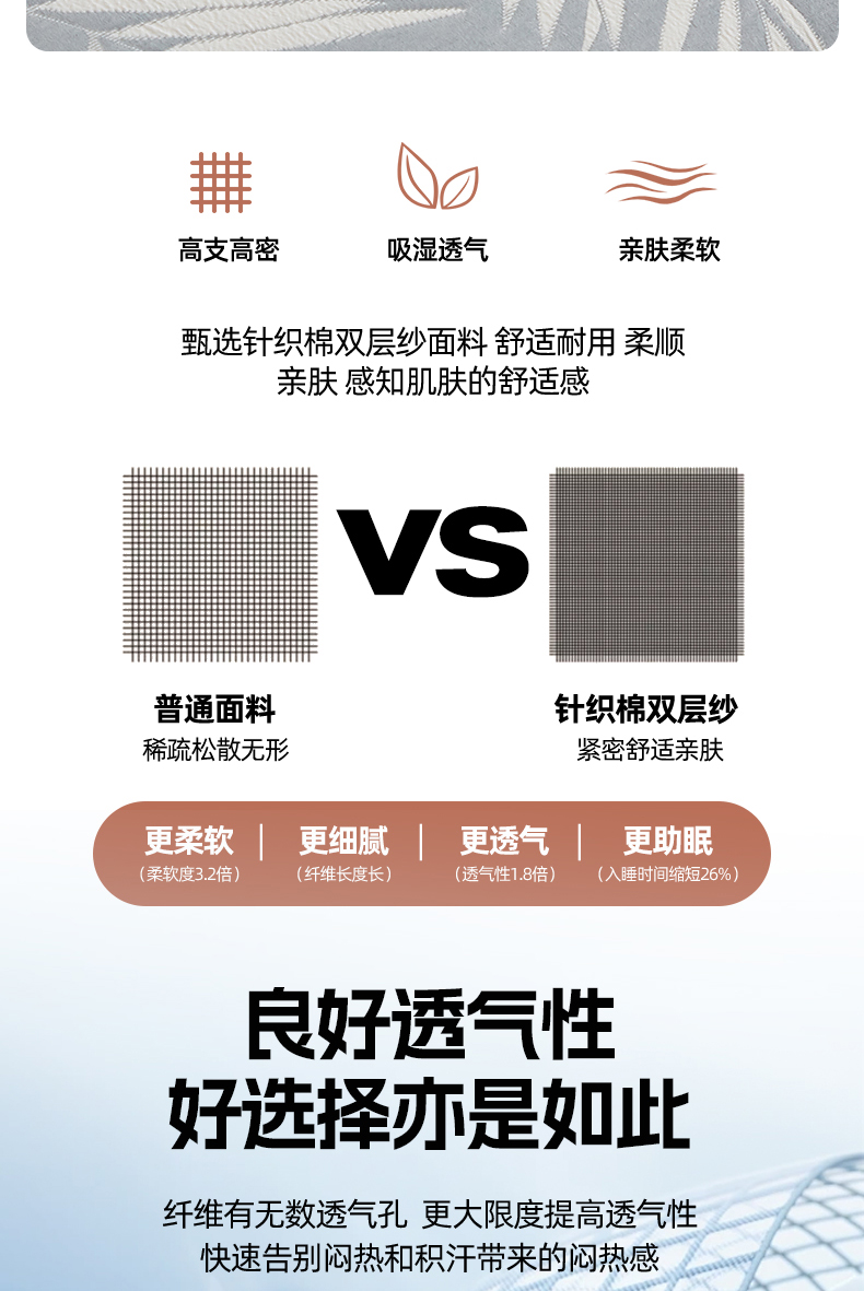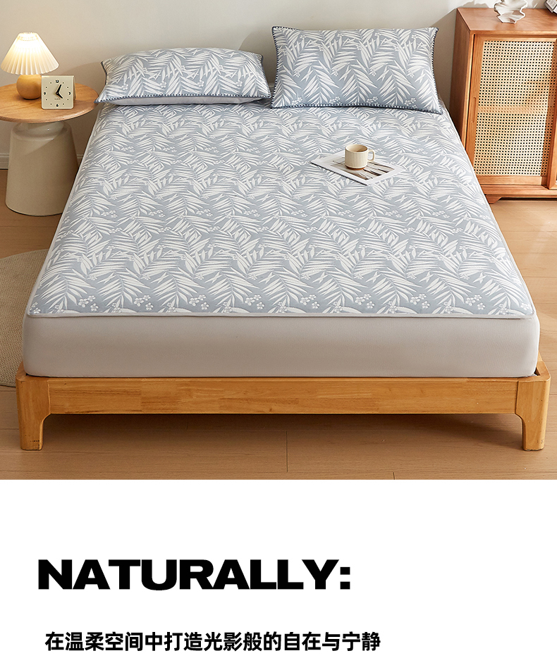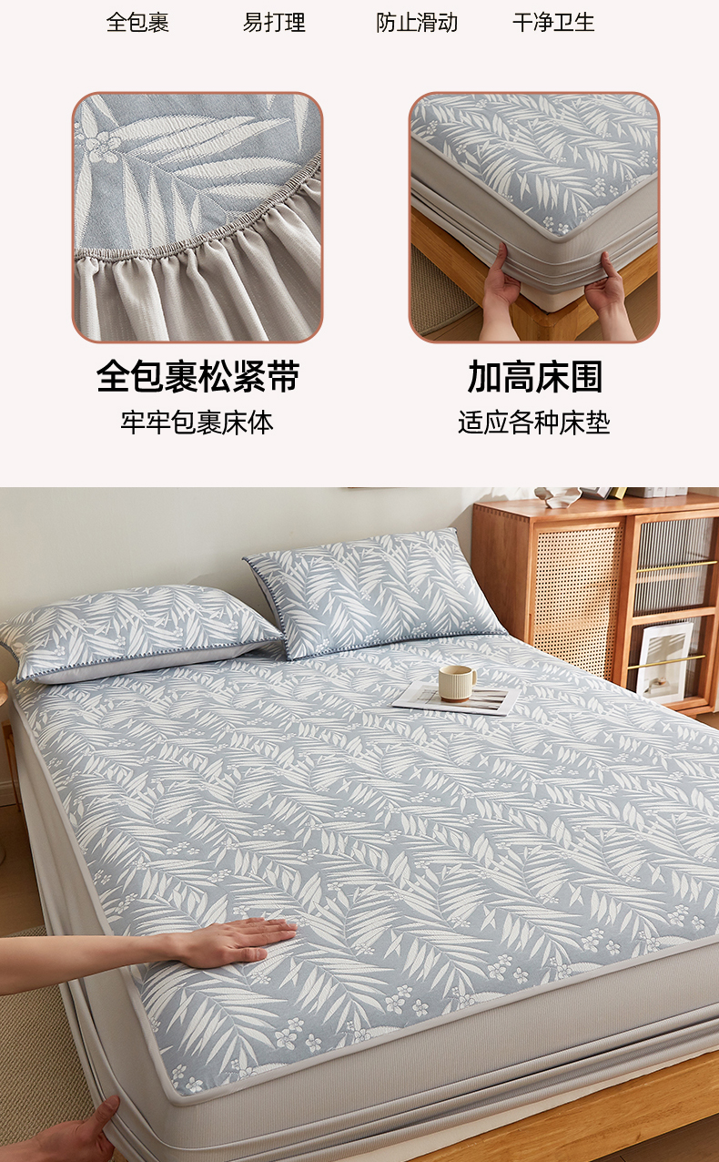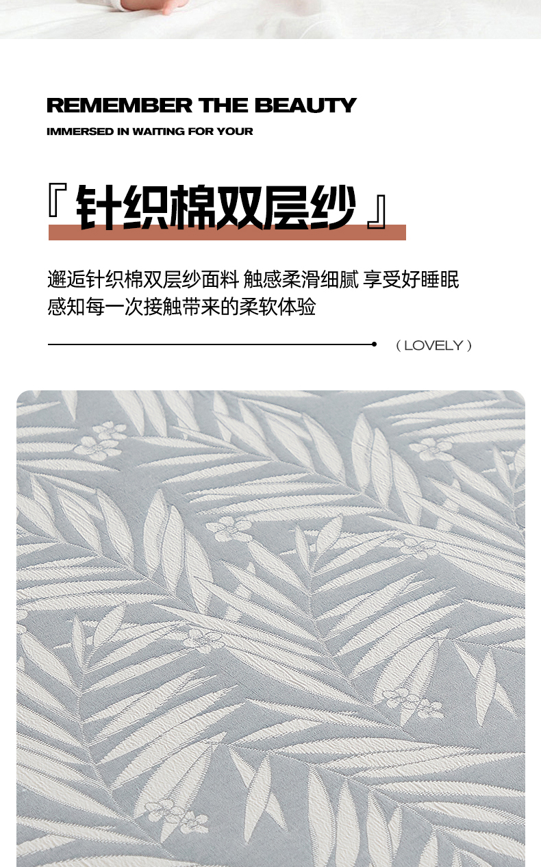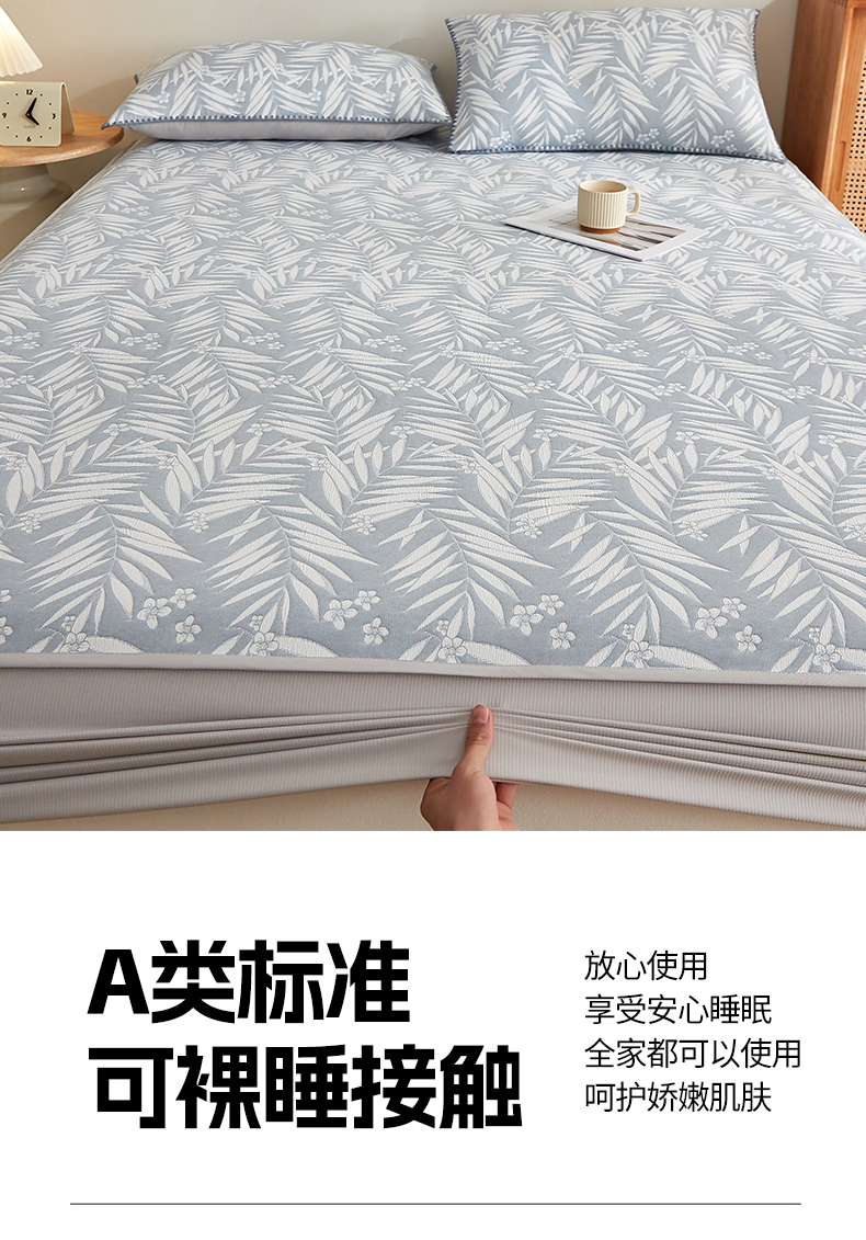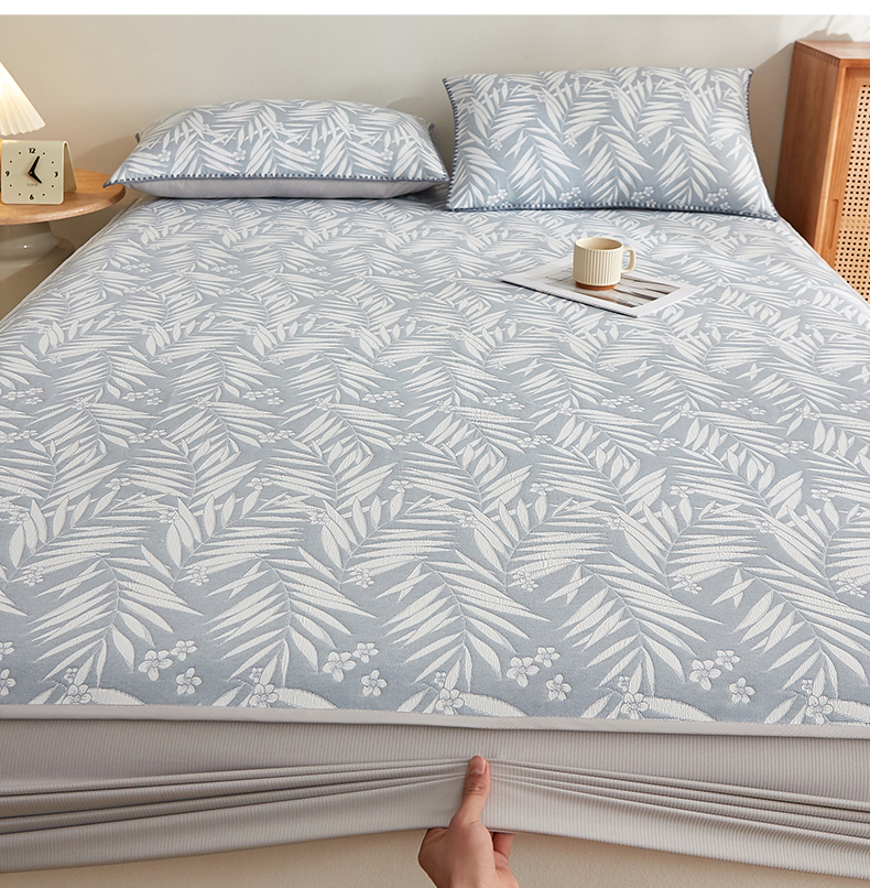 商品名称:梦镜家纺 2025新款A类针织双层纱床笠 细叶-浅蓝灰