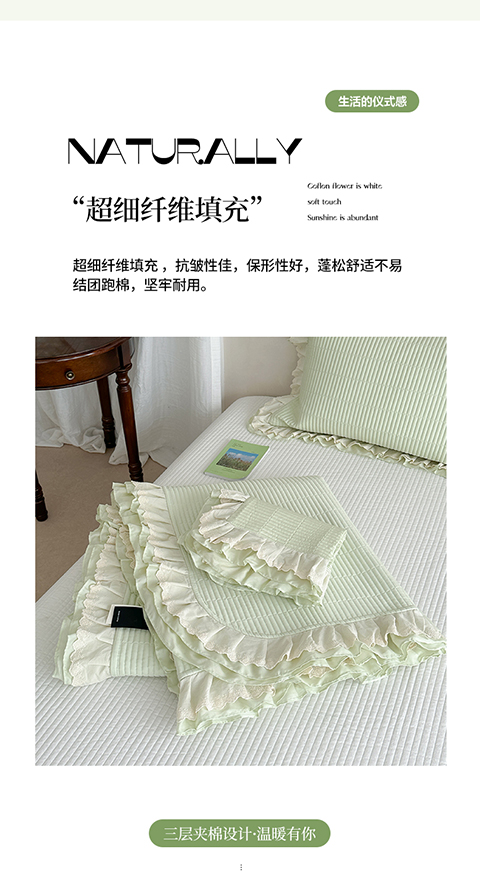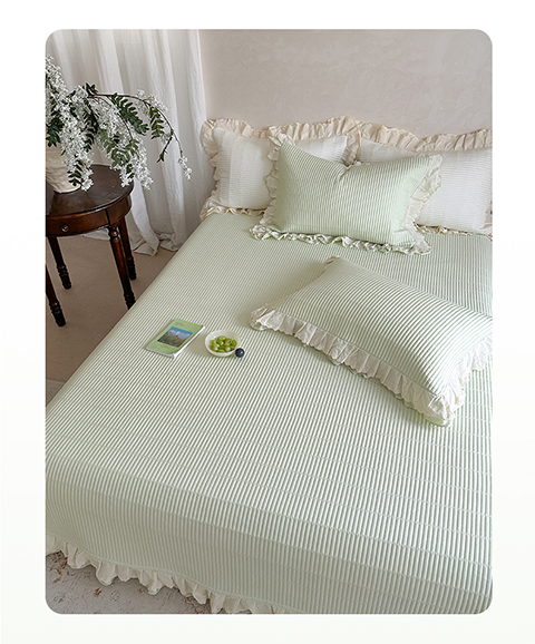 2022新款40S纯棉水洗棉全棉荷叶边夹棉床盖三件套青草绿,青草绿