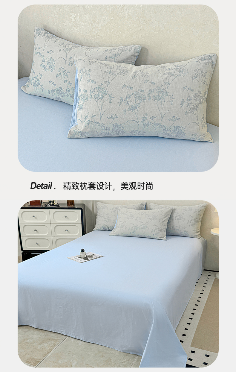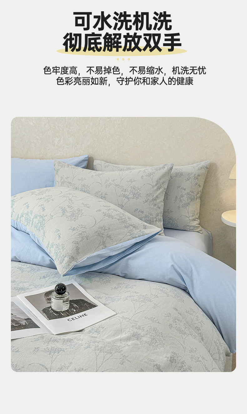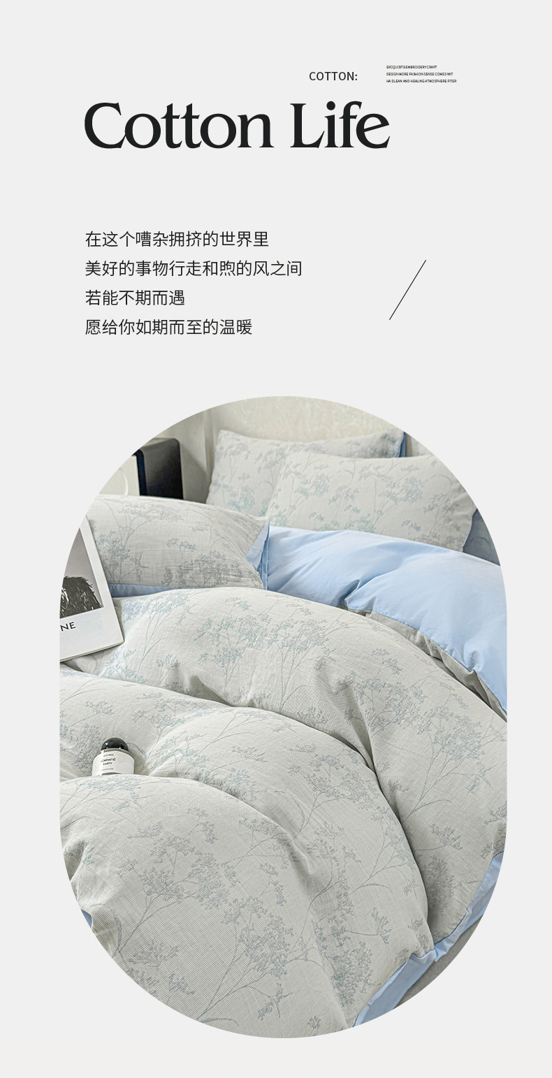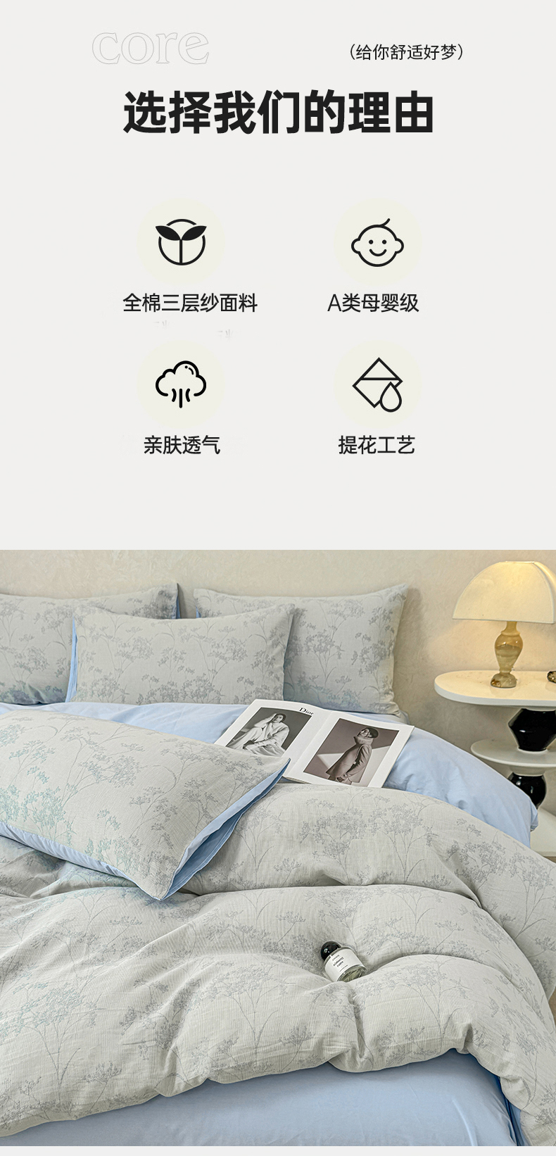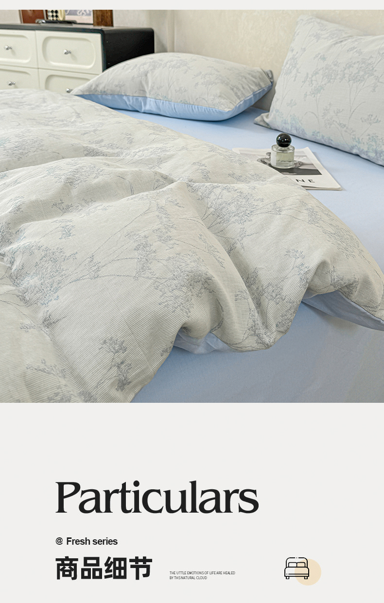 当前位置: 91家纺网 > 商品网购 > 床品套件 > 四件套 > 色织四件套 > 灰鲸2025新款A类全棉三层纱色织提花系列四件套 初春-蓝