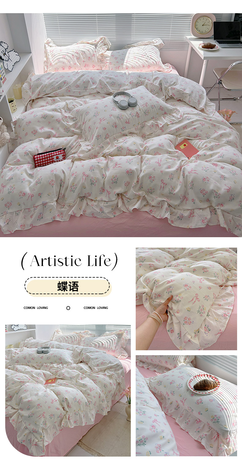 当前位置: 91家纺网 > 商品网购 > 床品套件 > 四件套 > 水洗棉四件套 > 芷凡家纺2025新款A类加厚超柔水洗棉花边款韩式四件套-风格二 蝶语