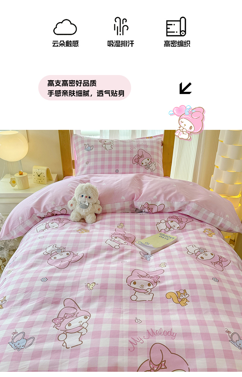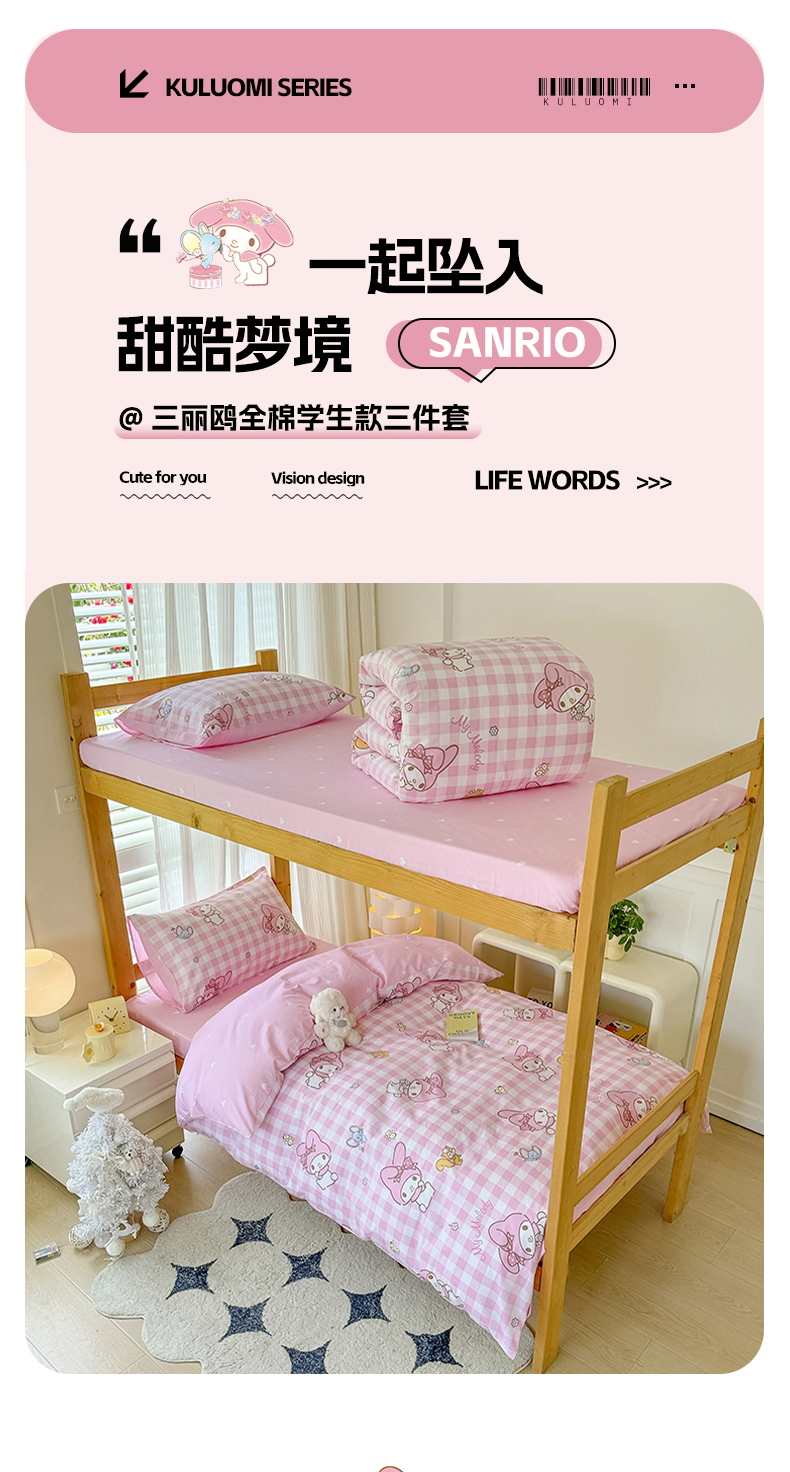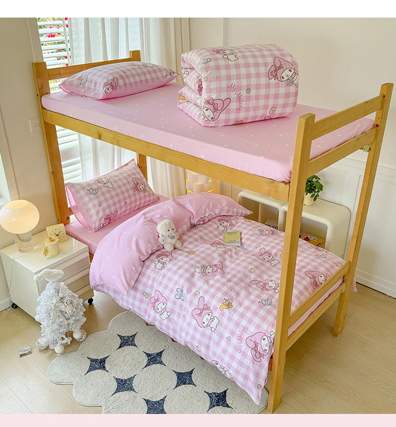 商品名称:玉元坊 2025新款三丽鸥全棉纯棉学生款学生宿舍上下铺三件套 粉格美乐蒂