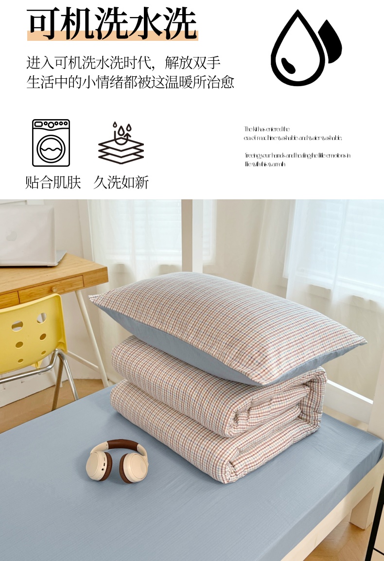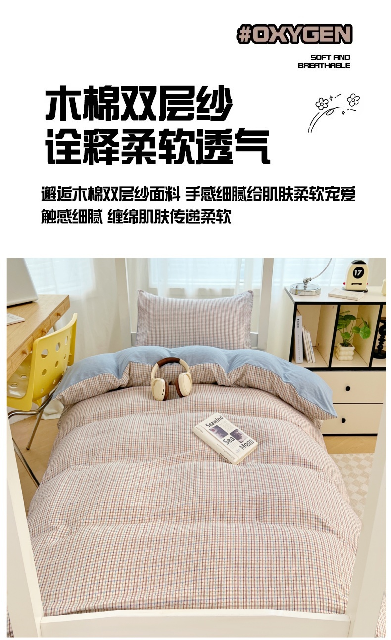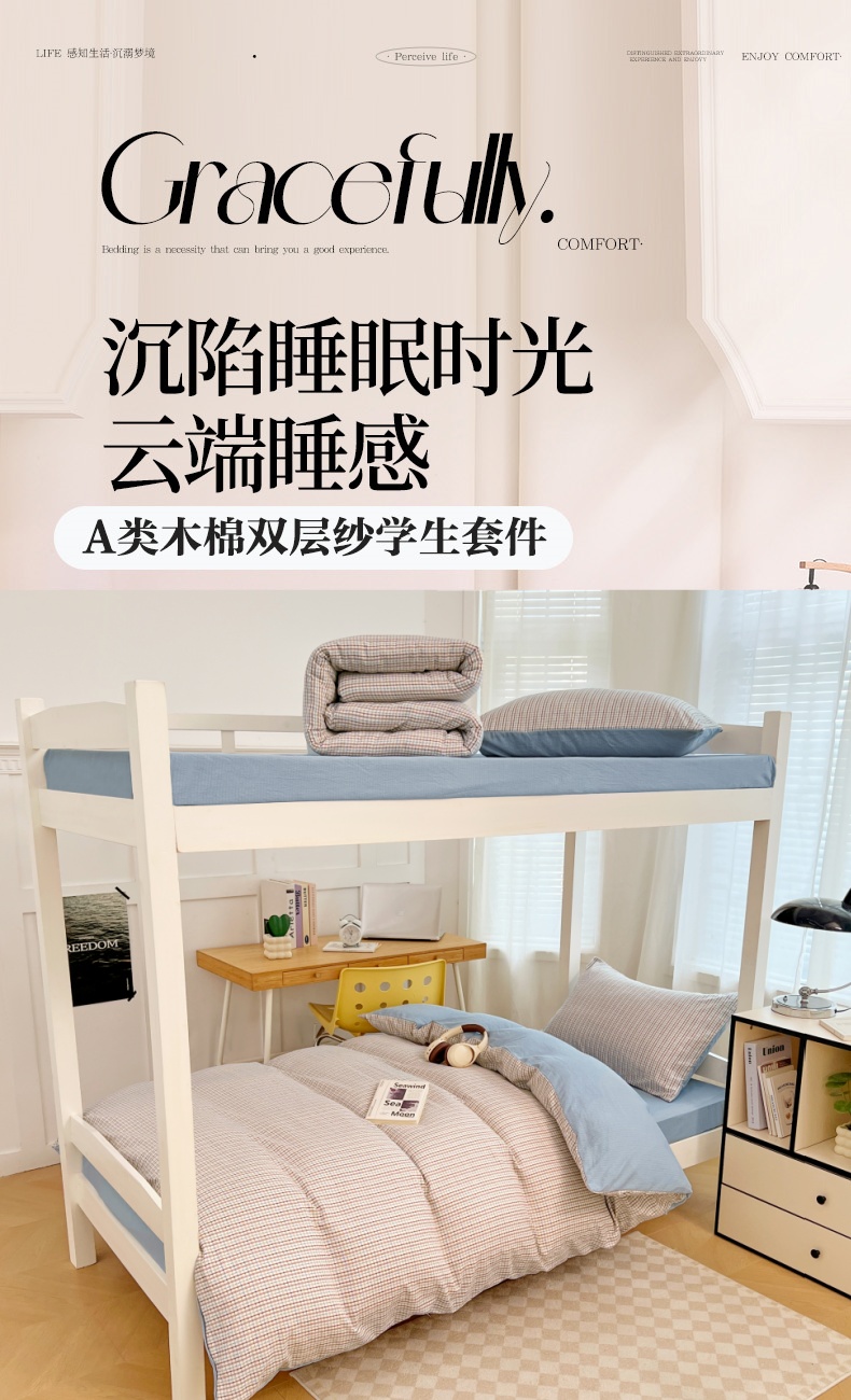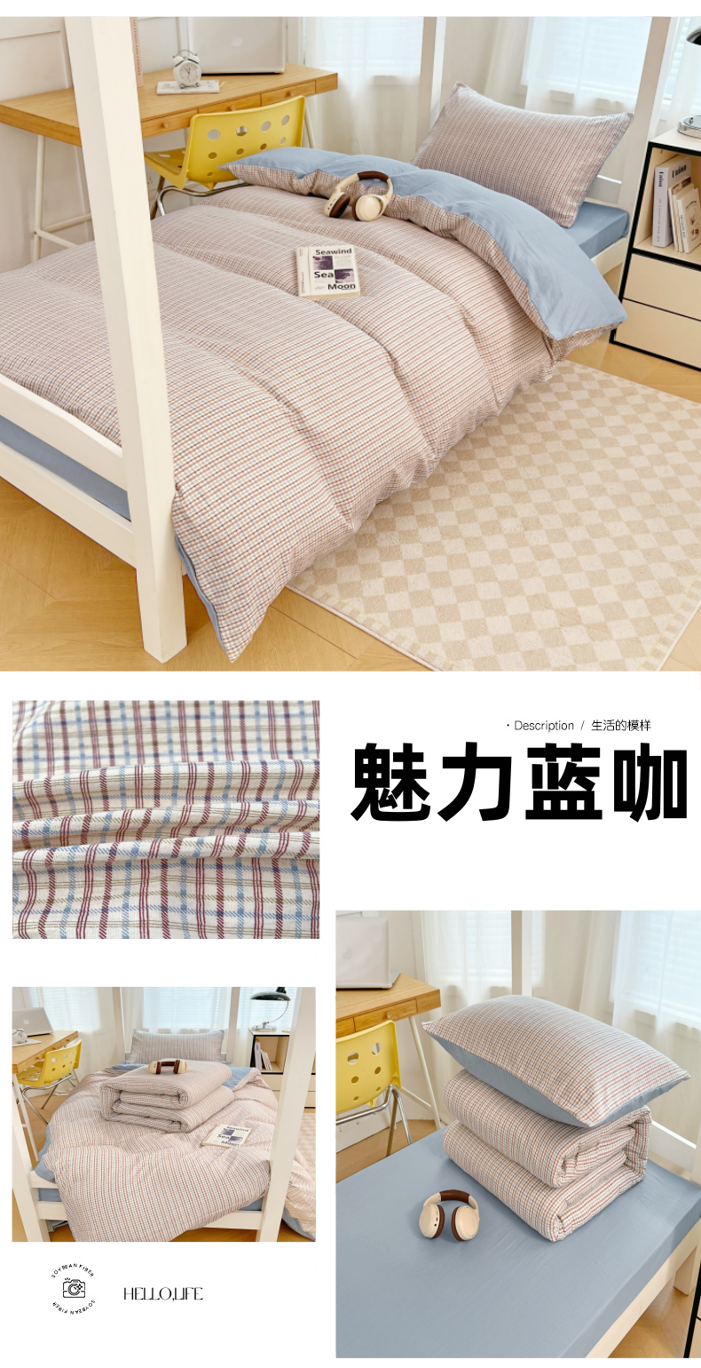 商品名称:梦舒羽 2025新款双层纱格子学生宿舍上下铺套件 常规款-魅力蓝咖