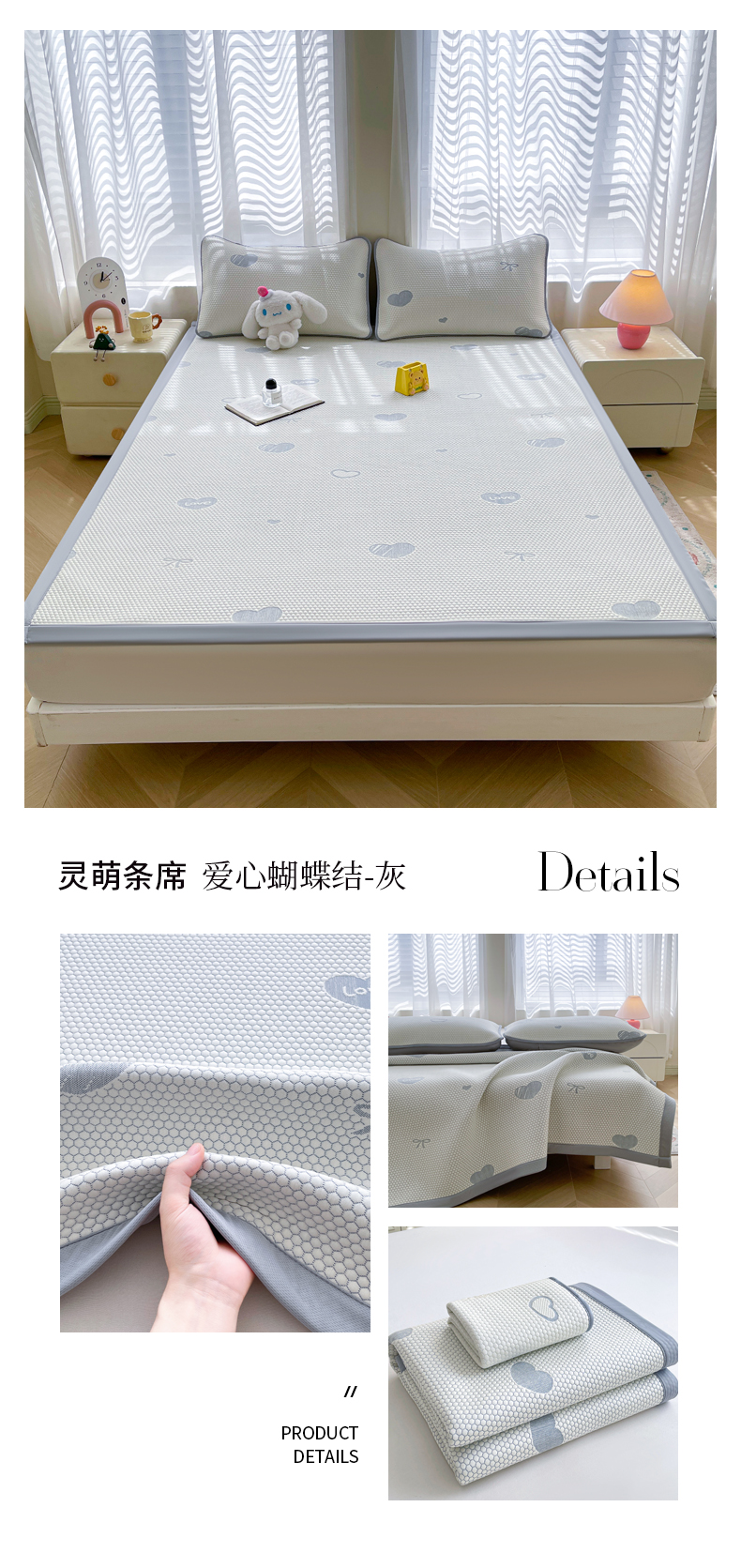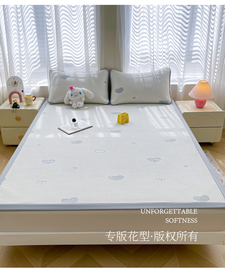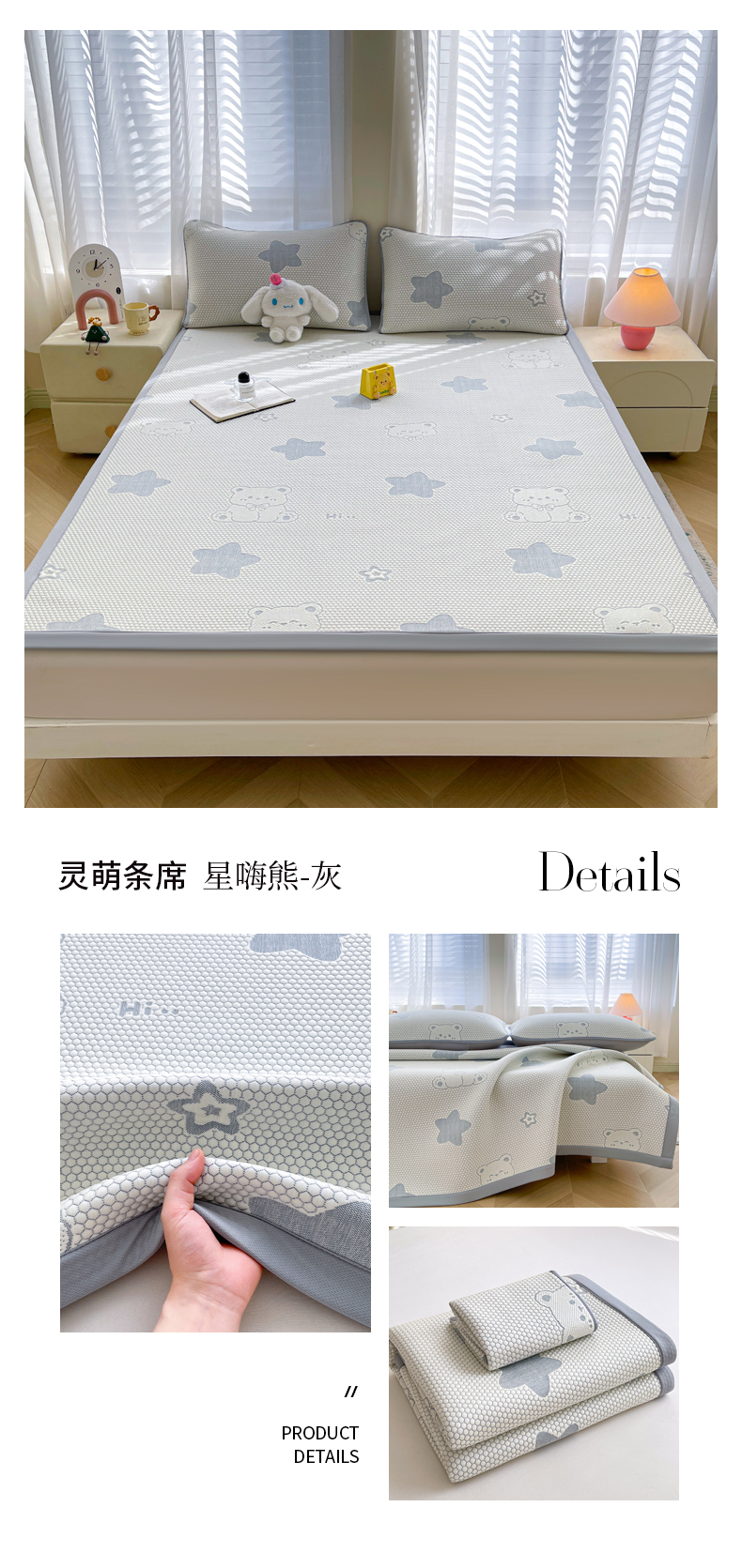 • 91家纺网 家纺一手货源 找家纺 小叮当家纺仓储工厂店 2025新款冰豆豆凉席冰丝席凉豆豆凉席-灵萌系列-床席款 灵萌条席-云朵星星-灰
