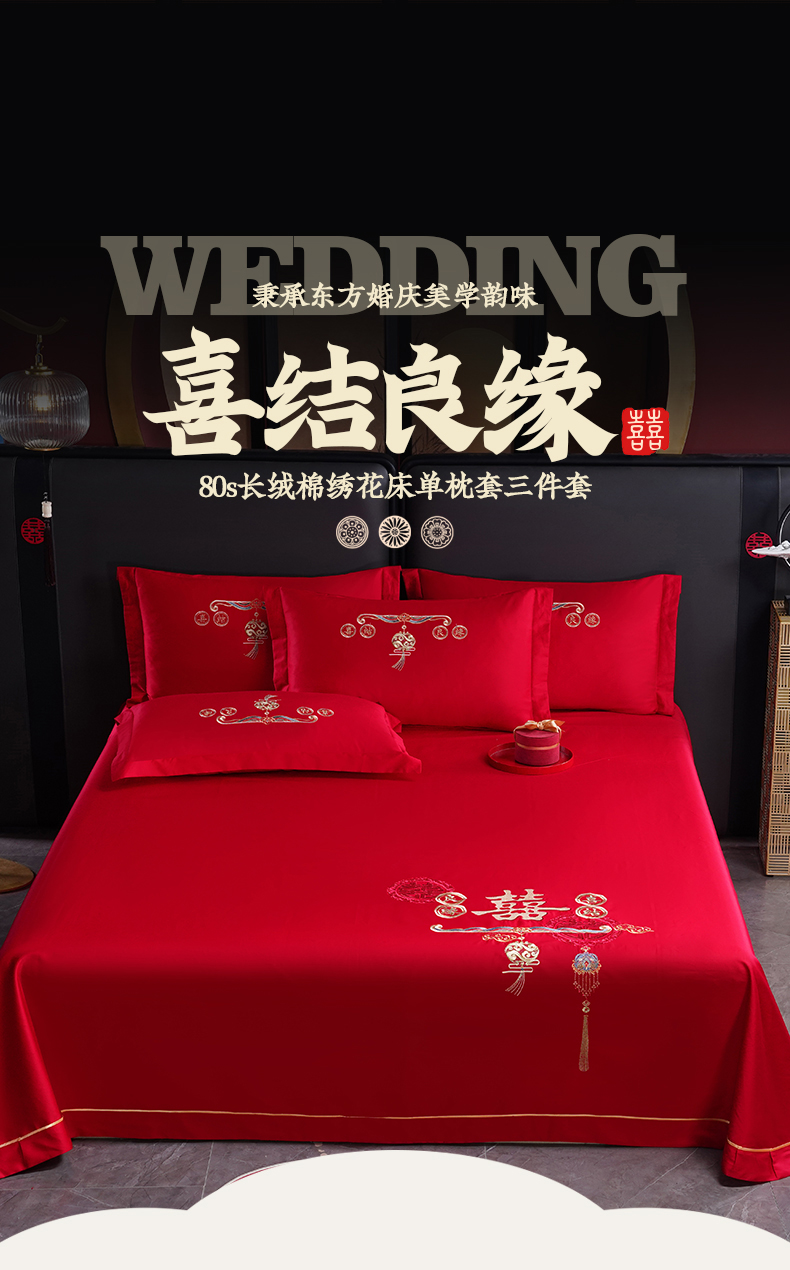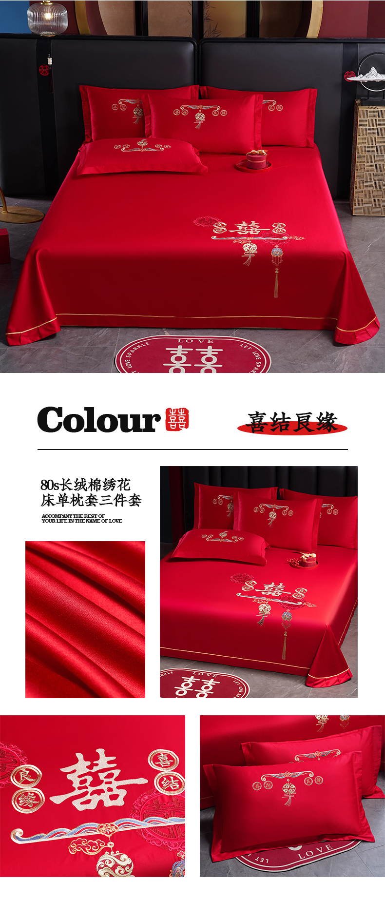 商品名称:千禧家纺 2024新款长绒棉绣花婚庆三件套 喜结良缘