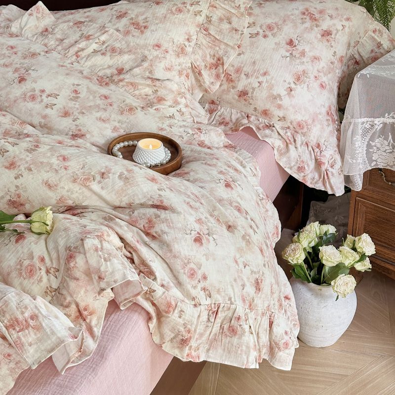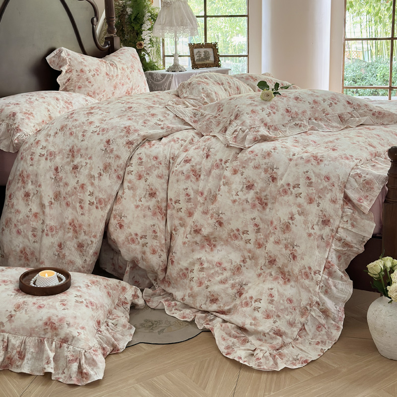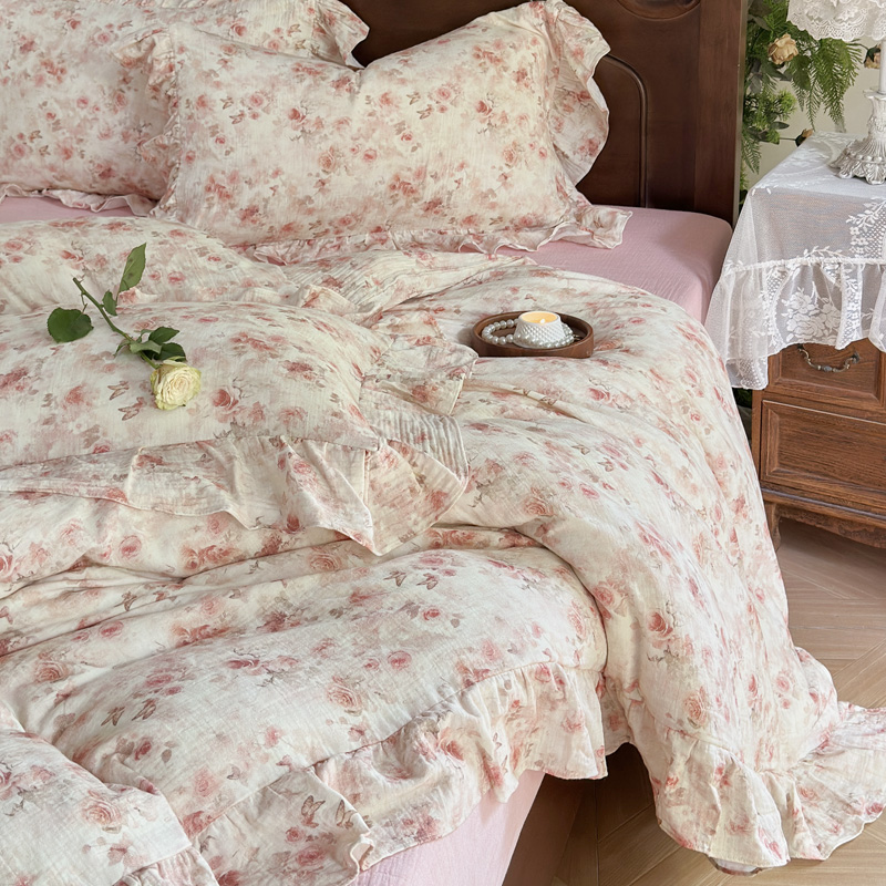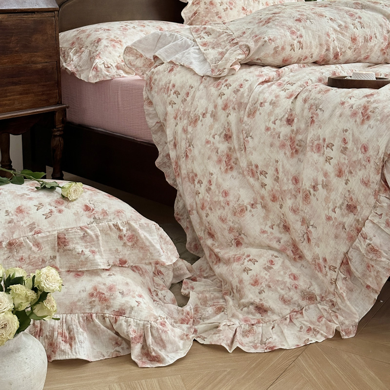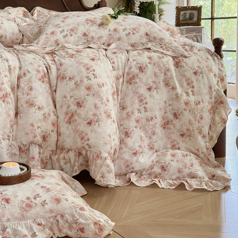 木楌家居2025新款法式油画风全棉双层皱皱纱四件套 香蜜桃桃
