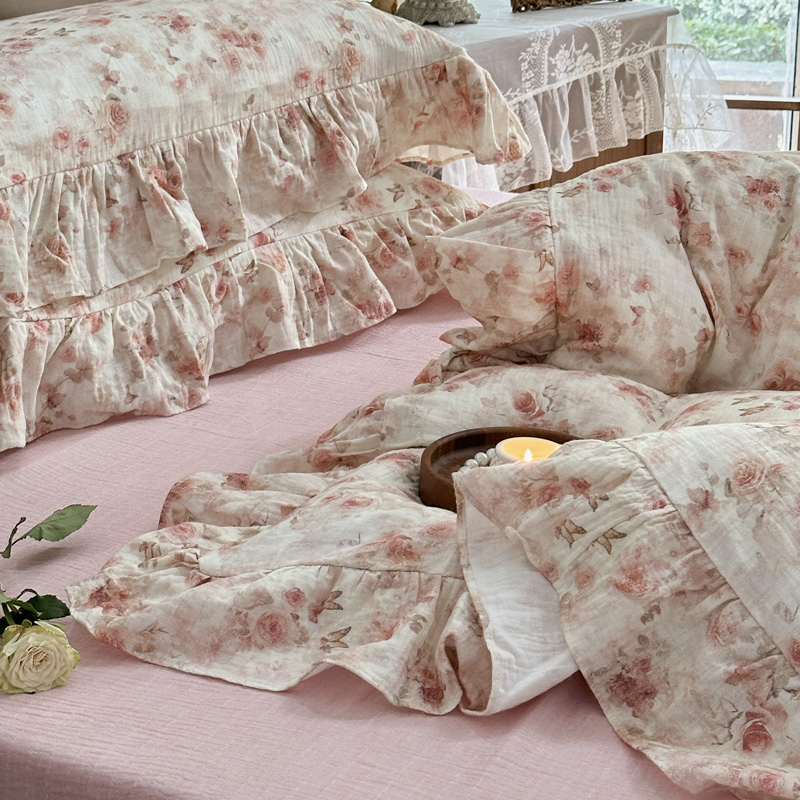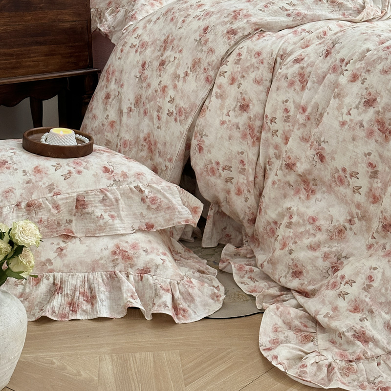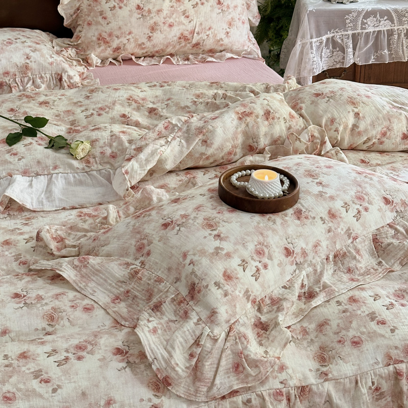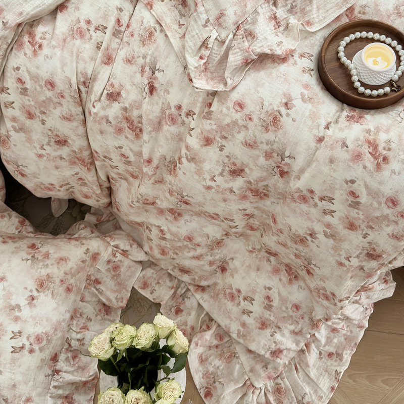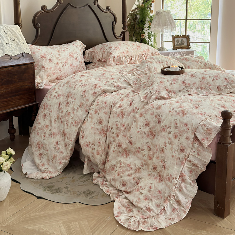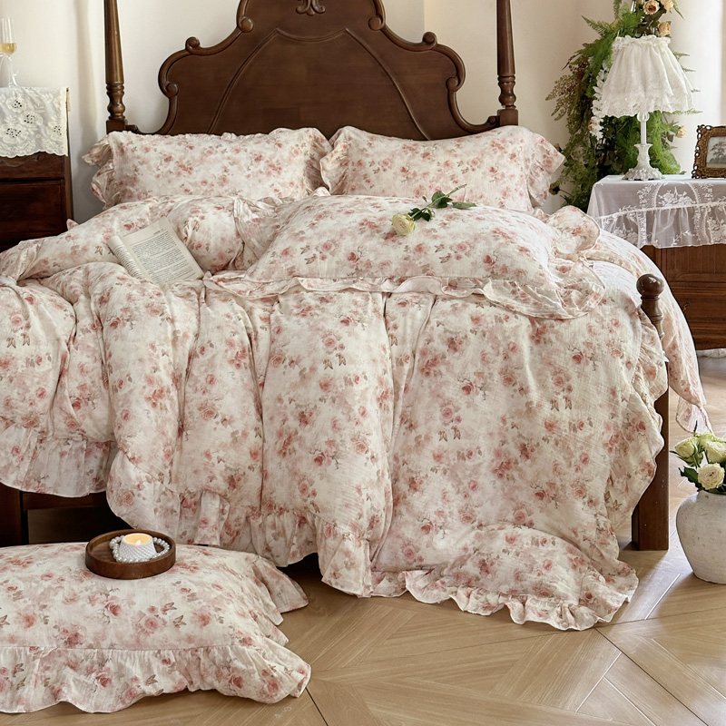 木楌家居2025新款法式油画风全棉双层皱皱纱四件套 香蜜桃桃