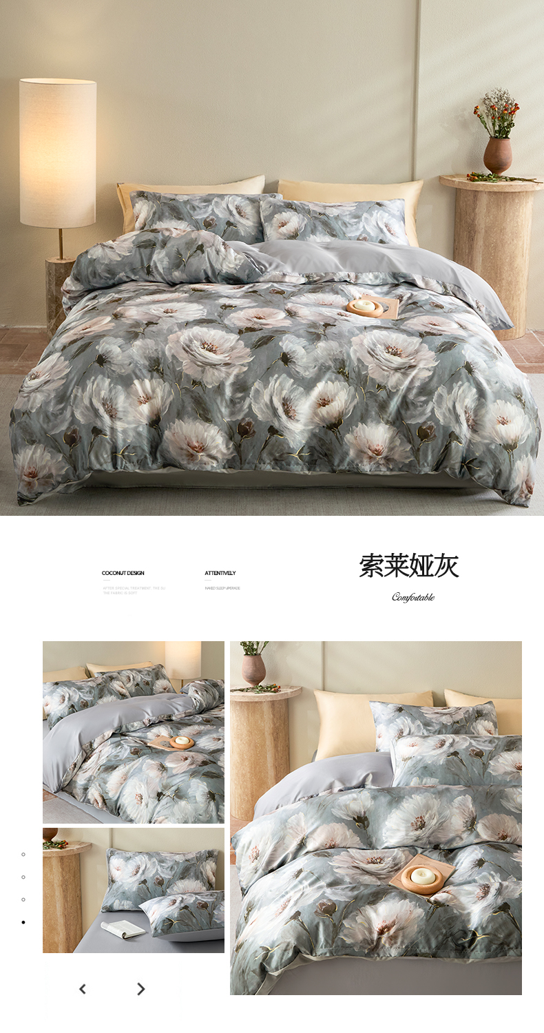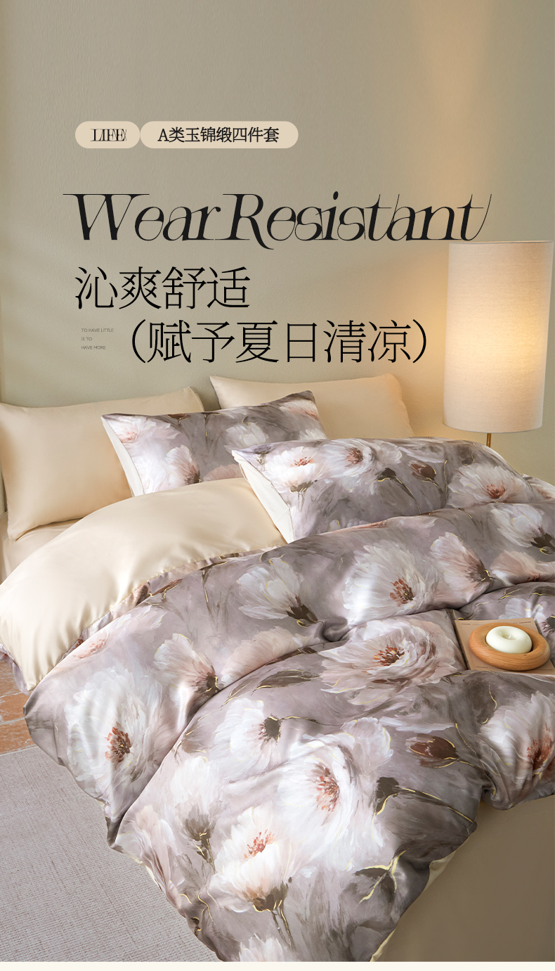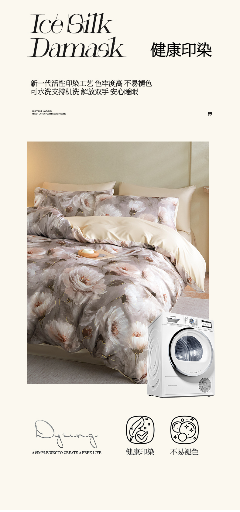 商品名称:麦田家纺 2025新款A类冰丝天丝玉锦缎印花四件套 索莱娅咖