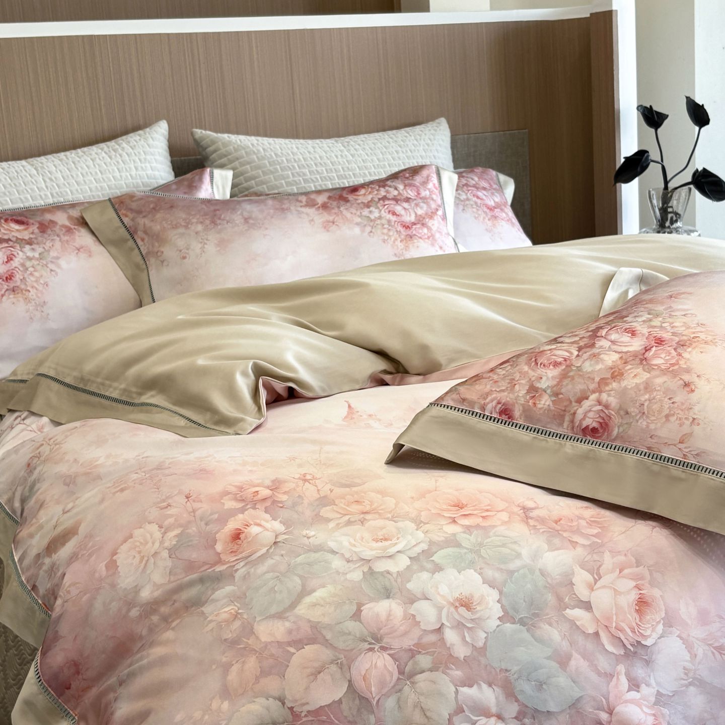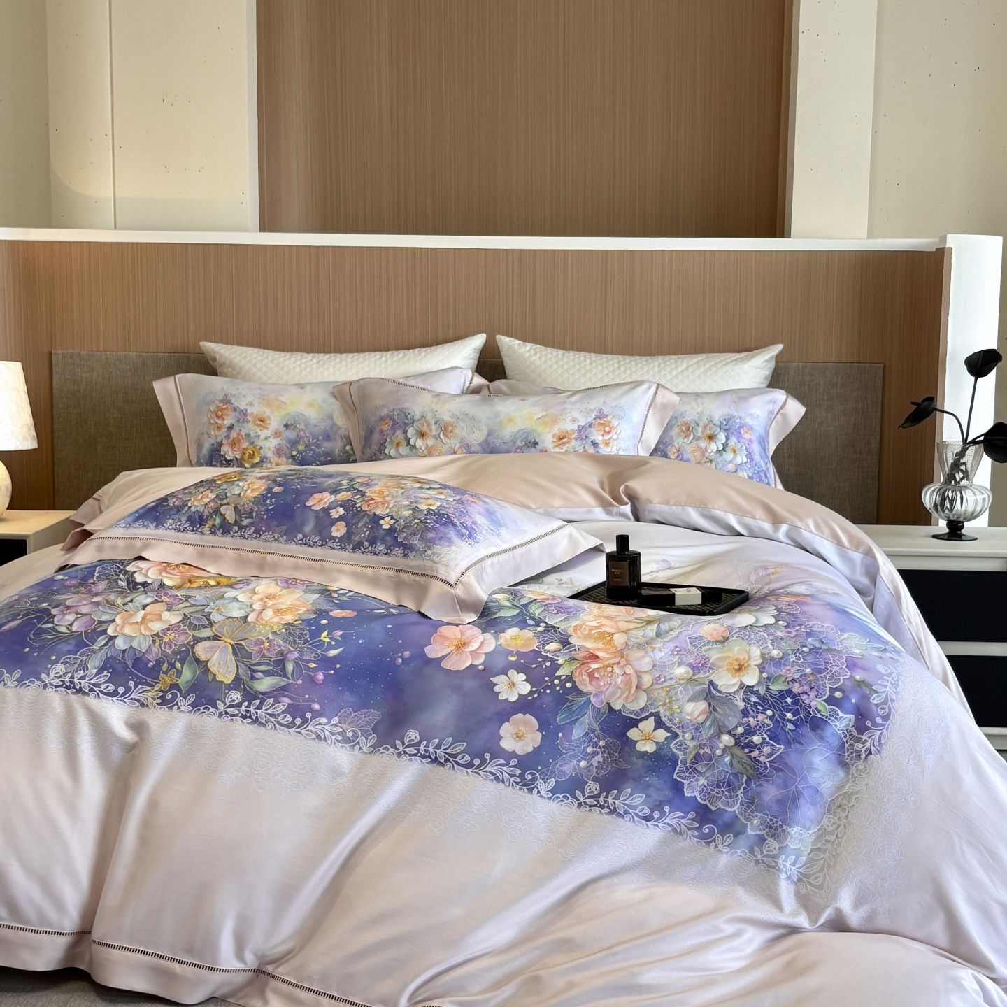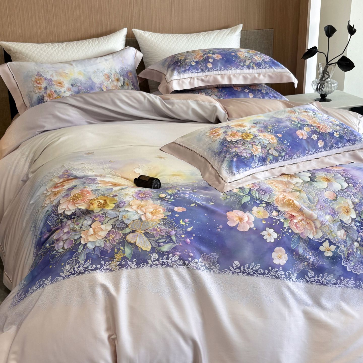 佳汐蓝家纺 2025新款天丝棉数码印花镂空床盖款四件套 伊利花园粉