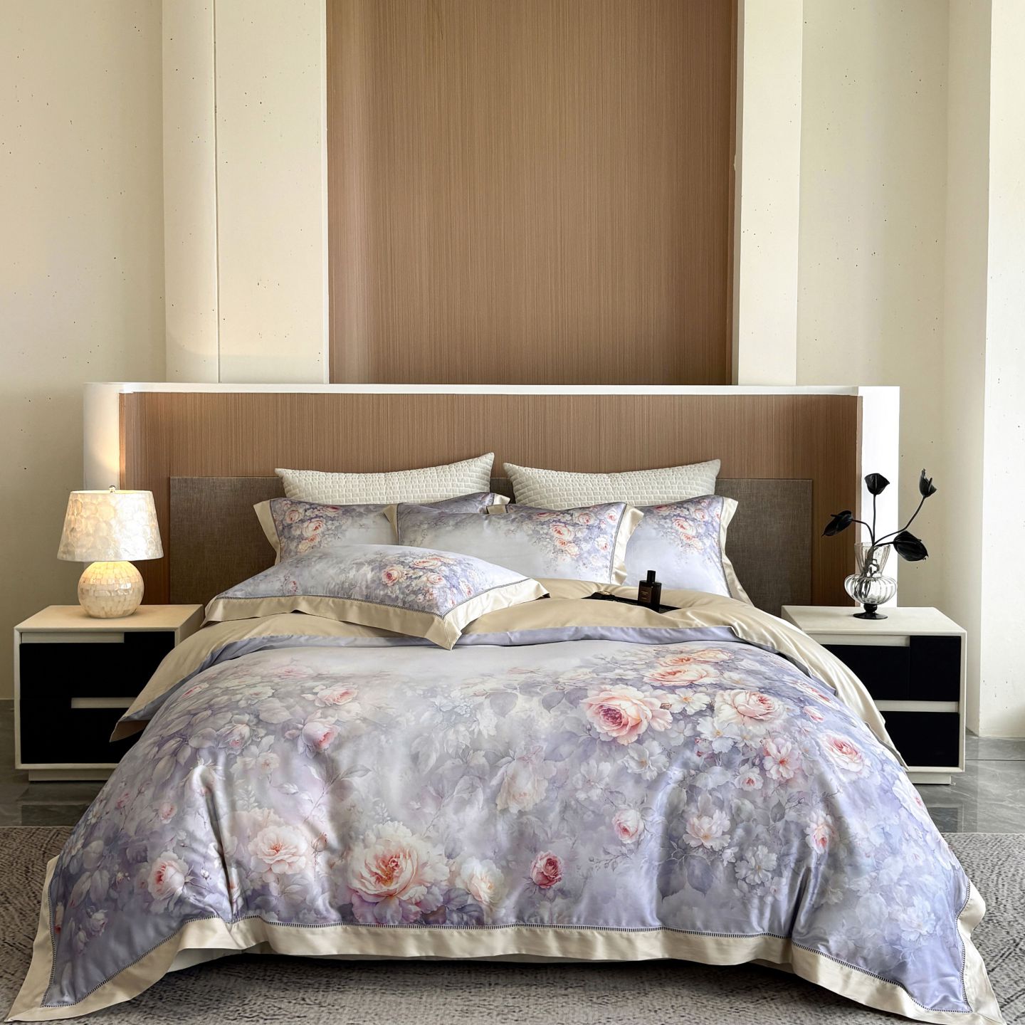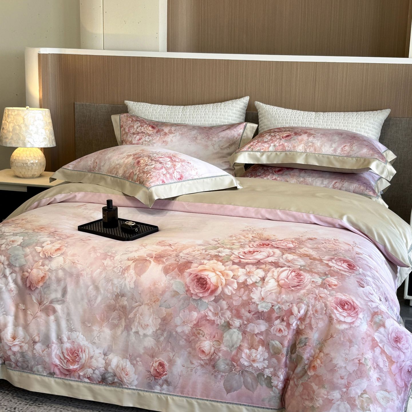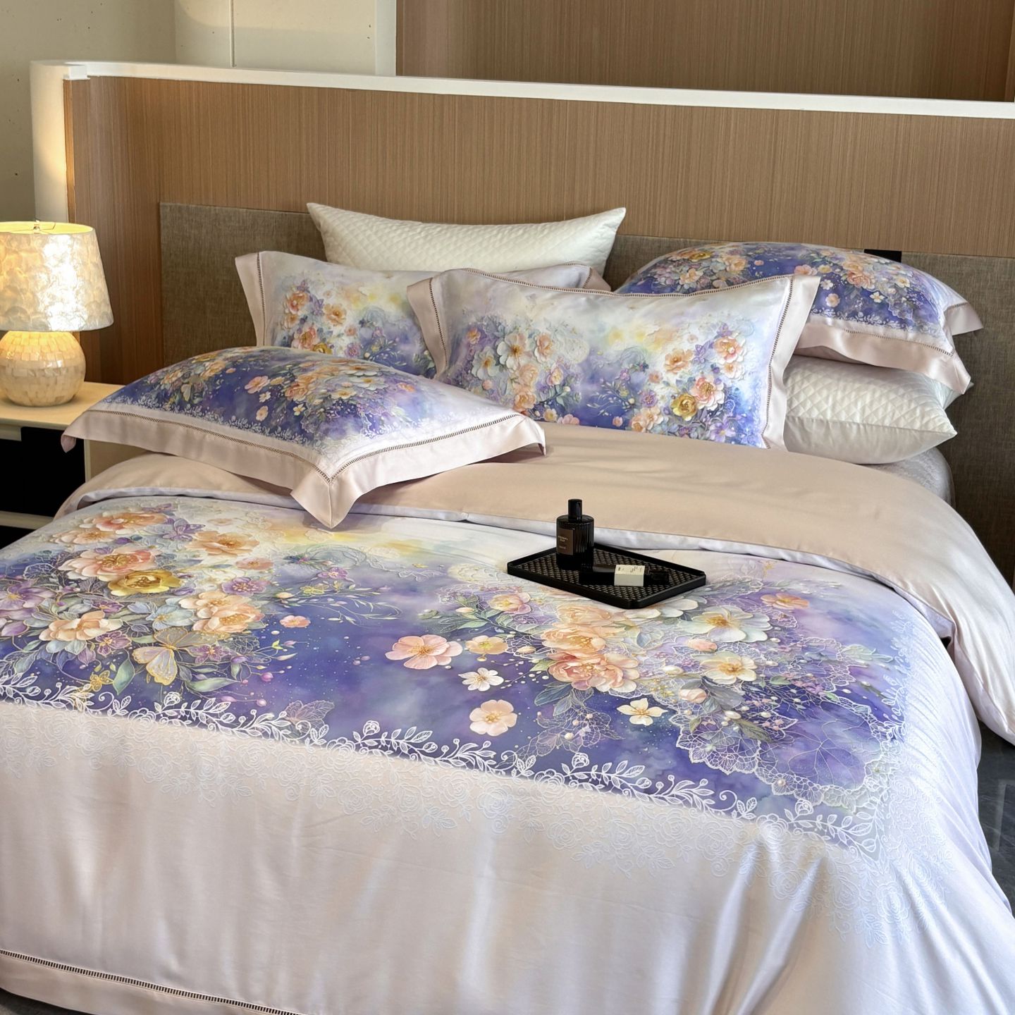 佳汐蓝家纺 2025新款天丝棉数码印花镂空床盖款四件套 伊利花园粉