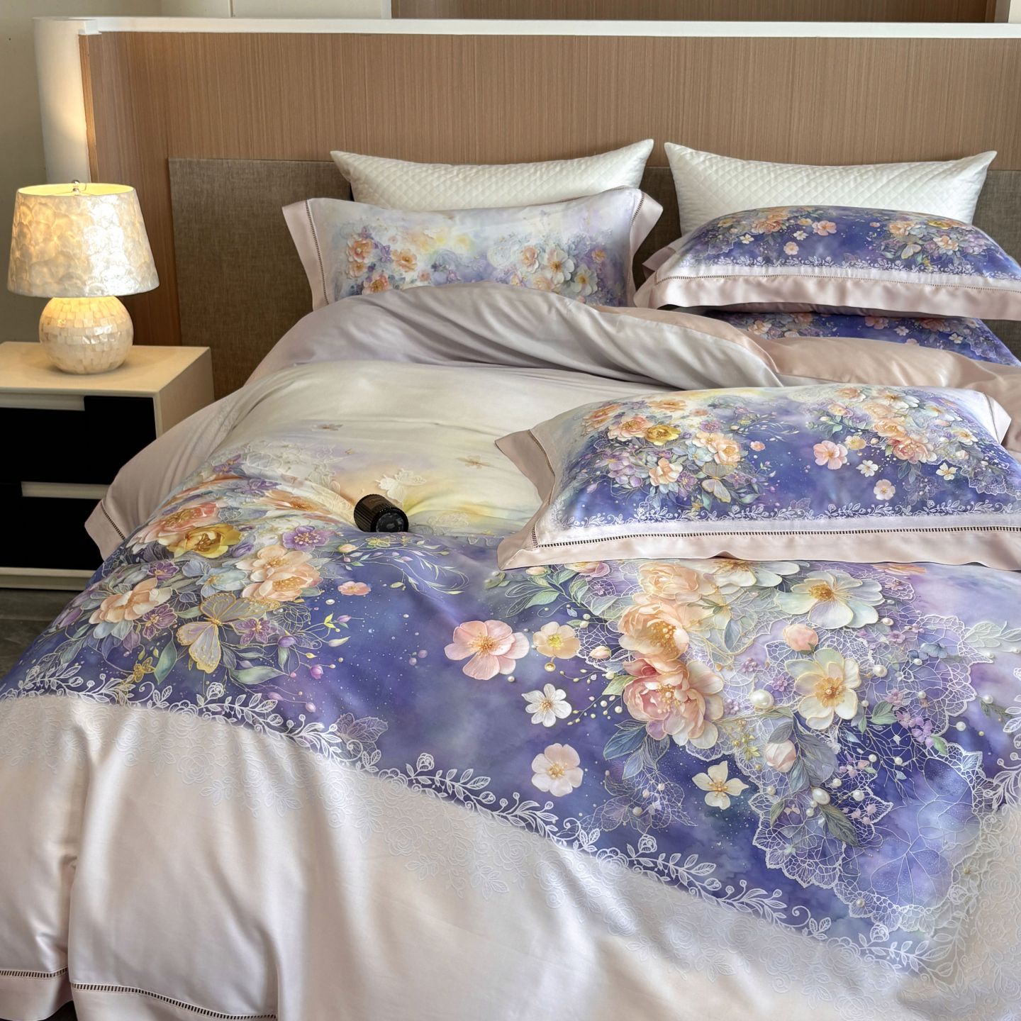 商品名称:佳汐蓝家纺 2025新款天丝棉数码印花镂空床盖款四件套 伊利花园粉