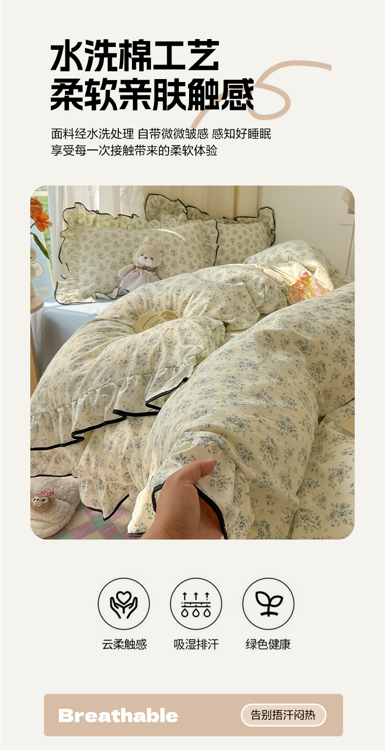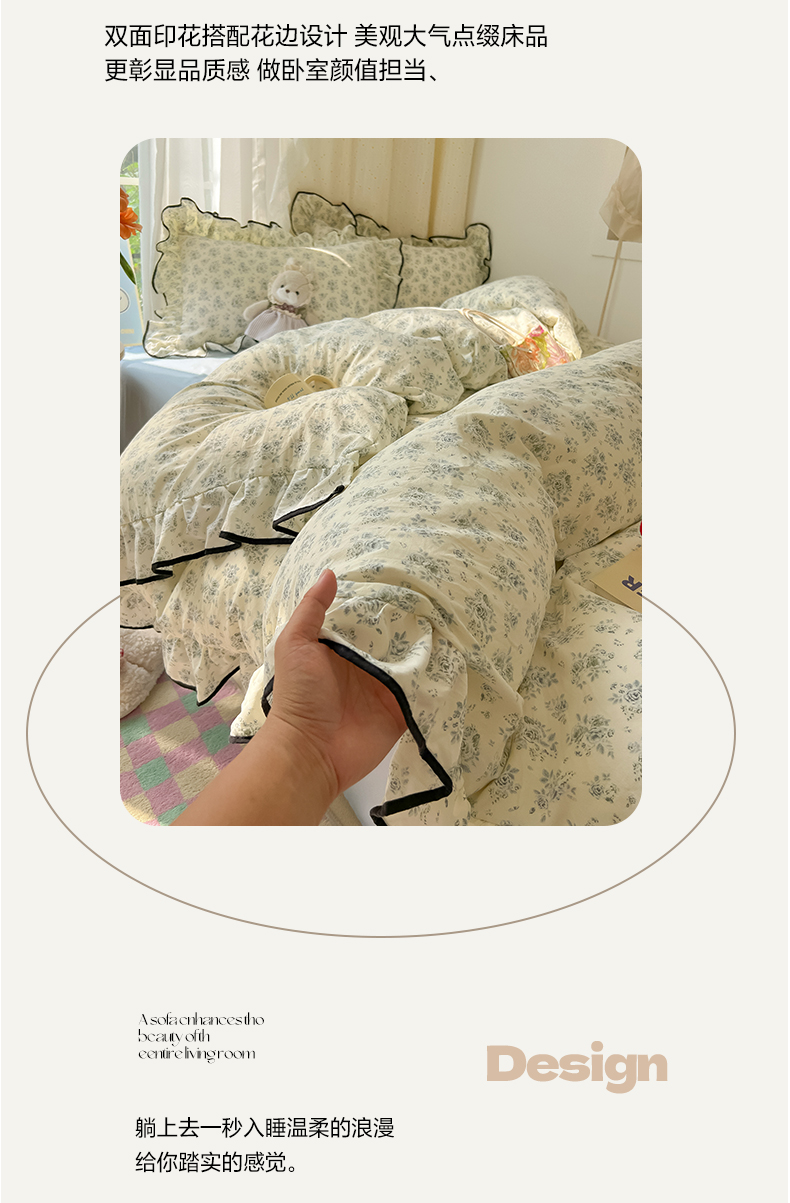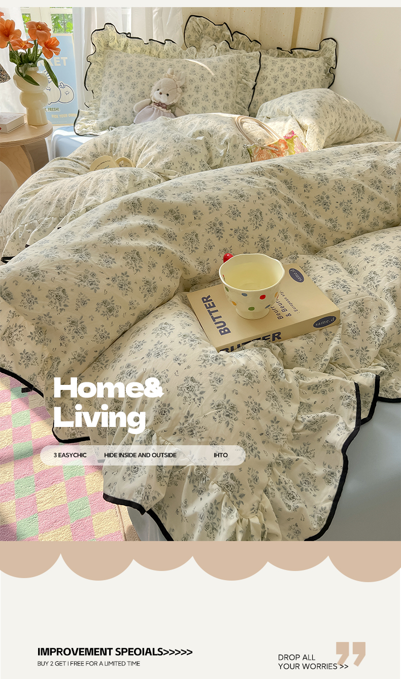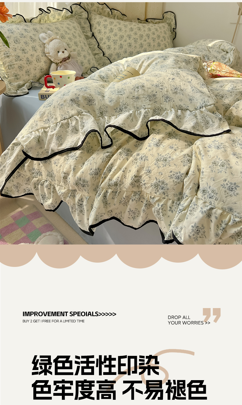 当前位置: 91家纺网 > 商品网购 > 床品套件 > 四件套 > 其它四件套 > 韩巢家纺 2025新款水洗棉大花边被套四件套直播热销款学生宿舍被罩床单三件套(提供卖家秀) 春日与玫瑰【大花边款】