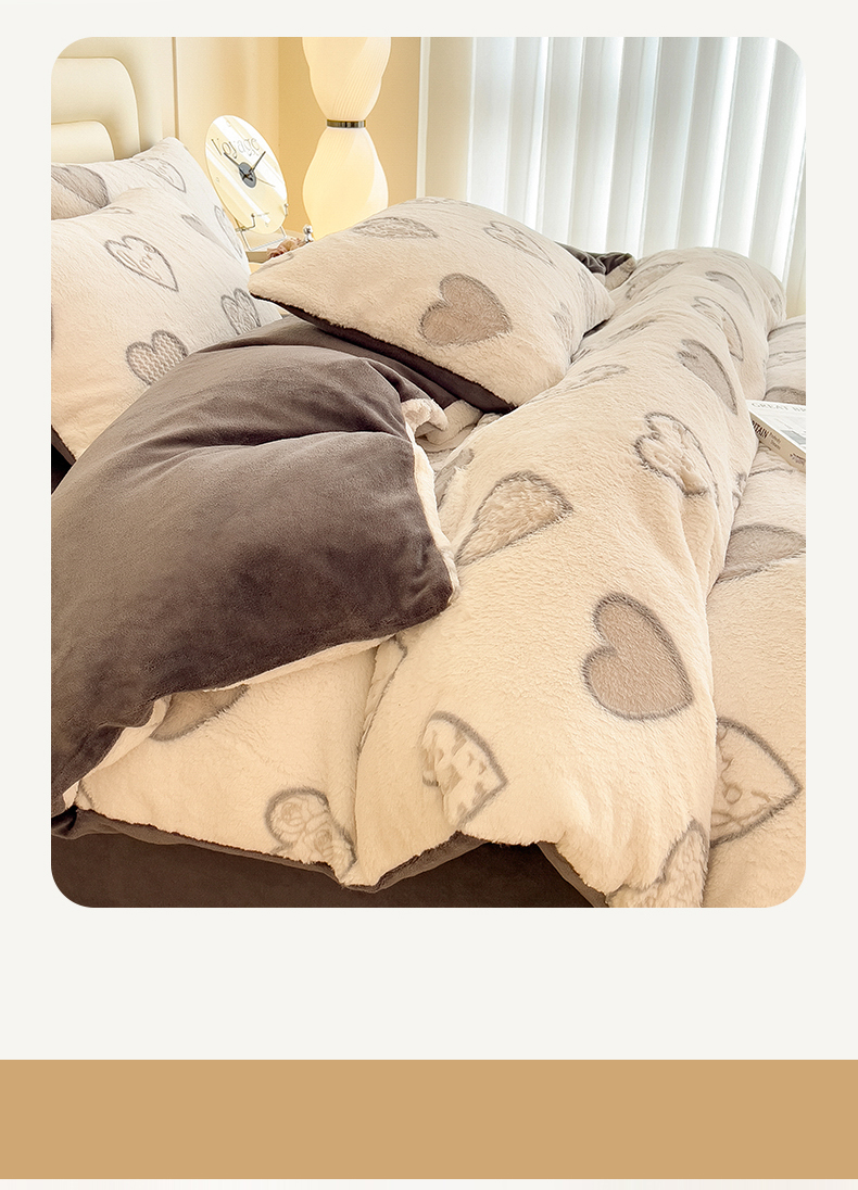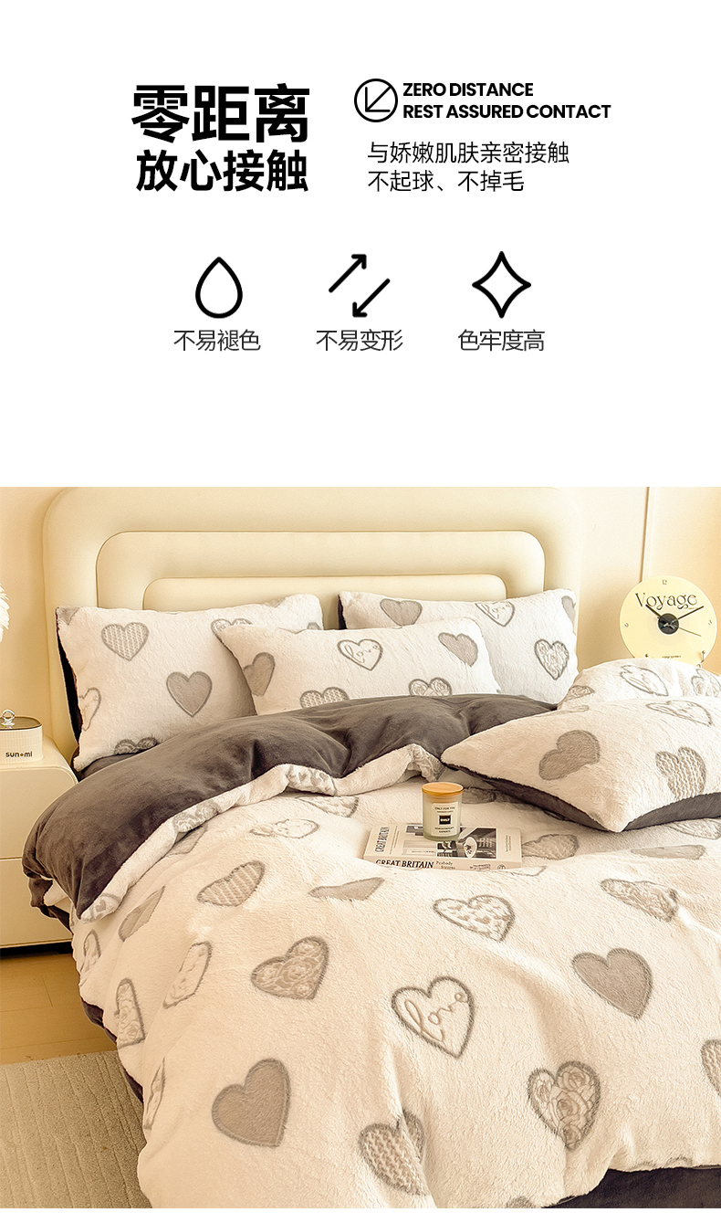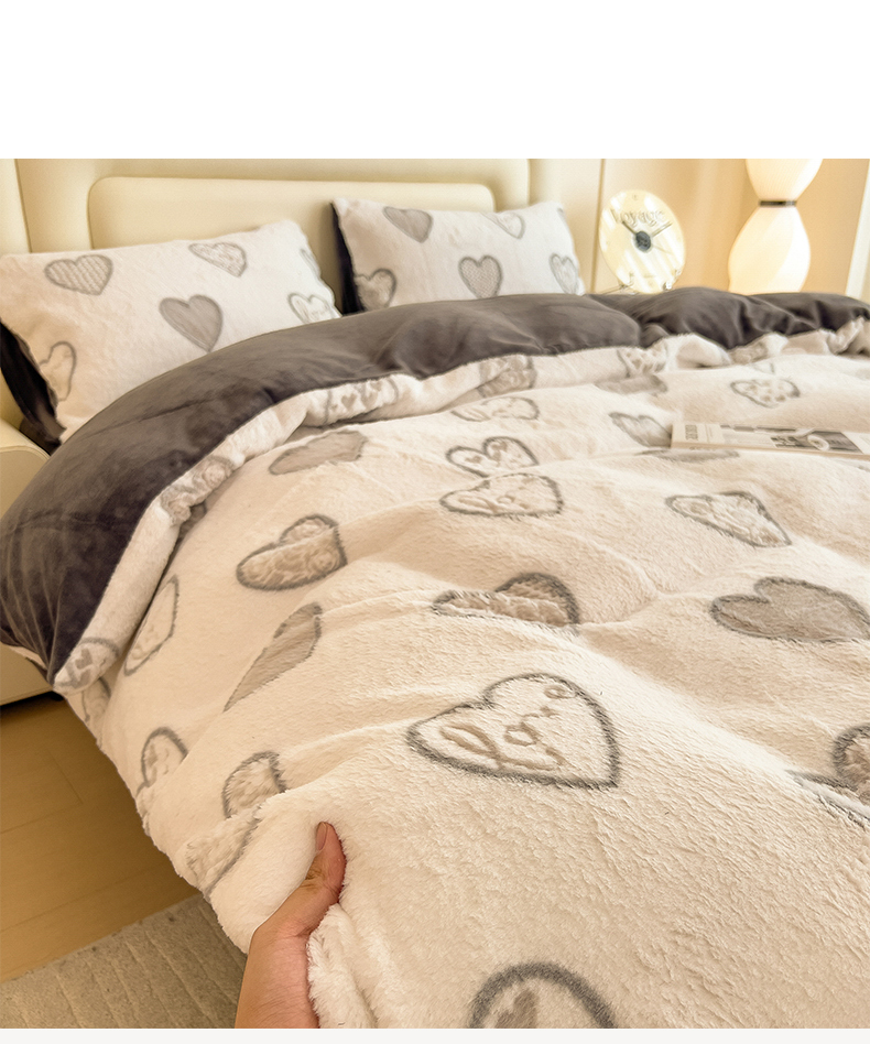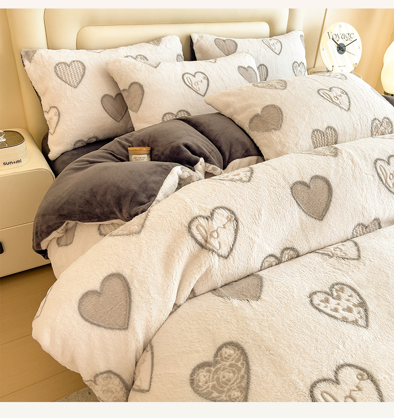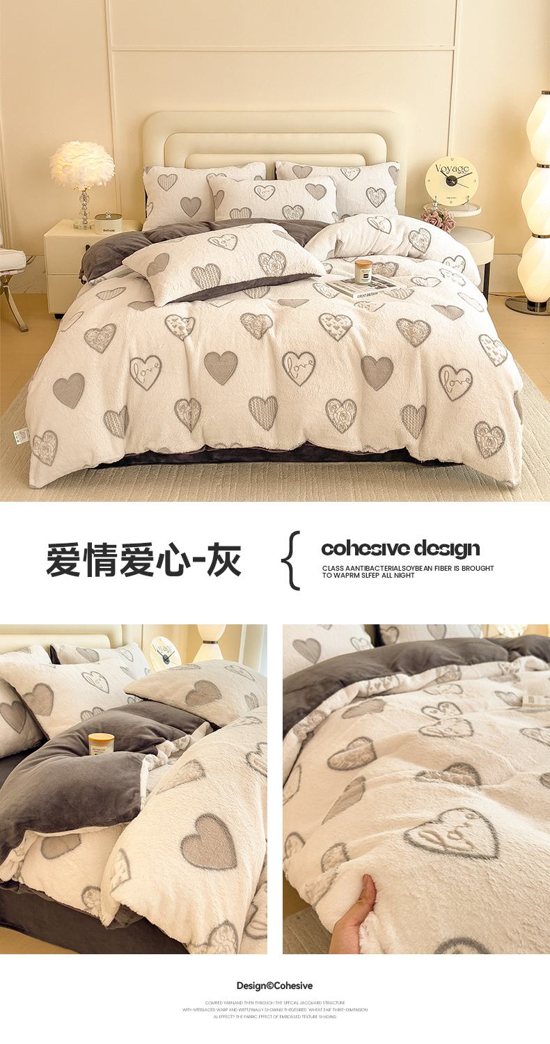 商品名称:摩妮卡 2025新款A类加厚兔毛雕花牛奶绒四件套 爱情爱心-灰