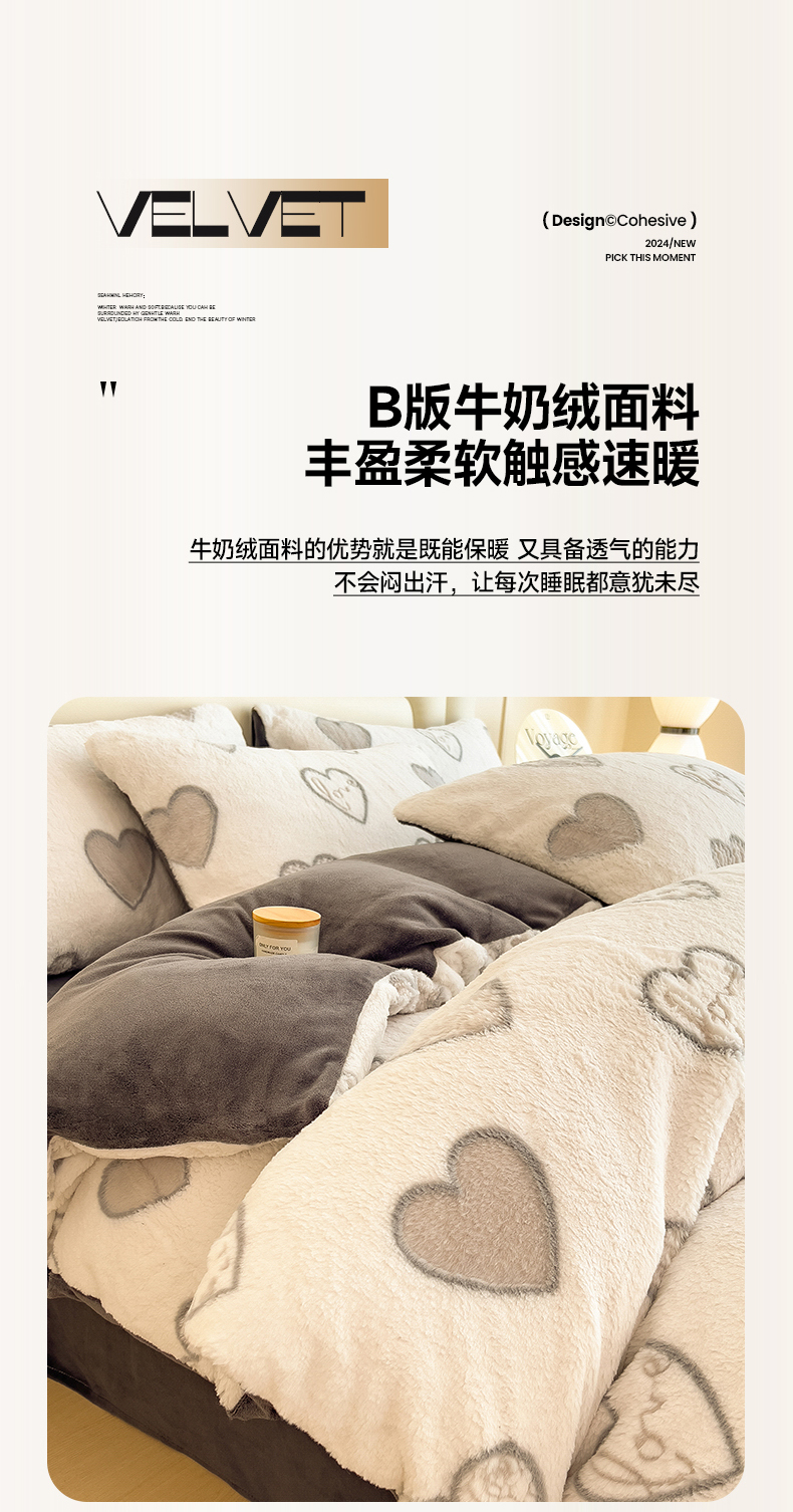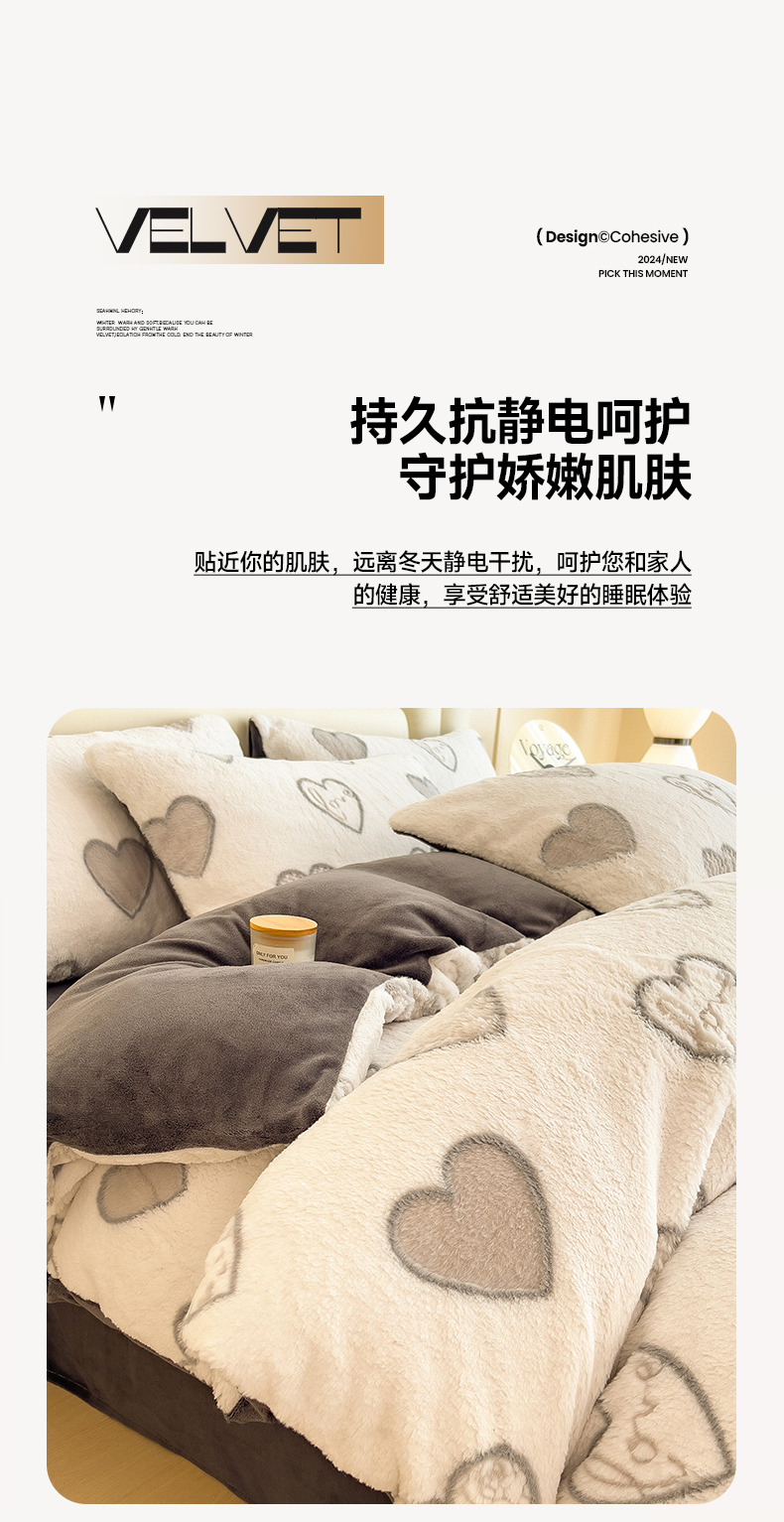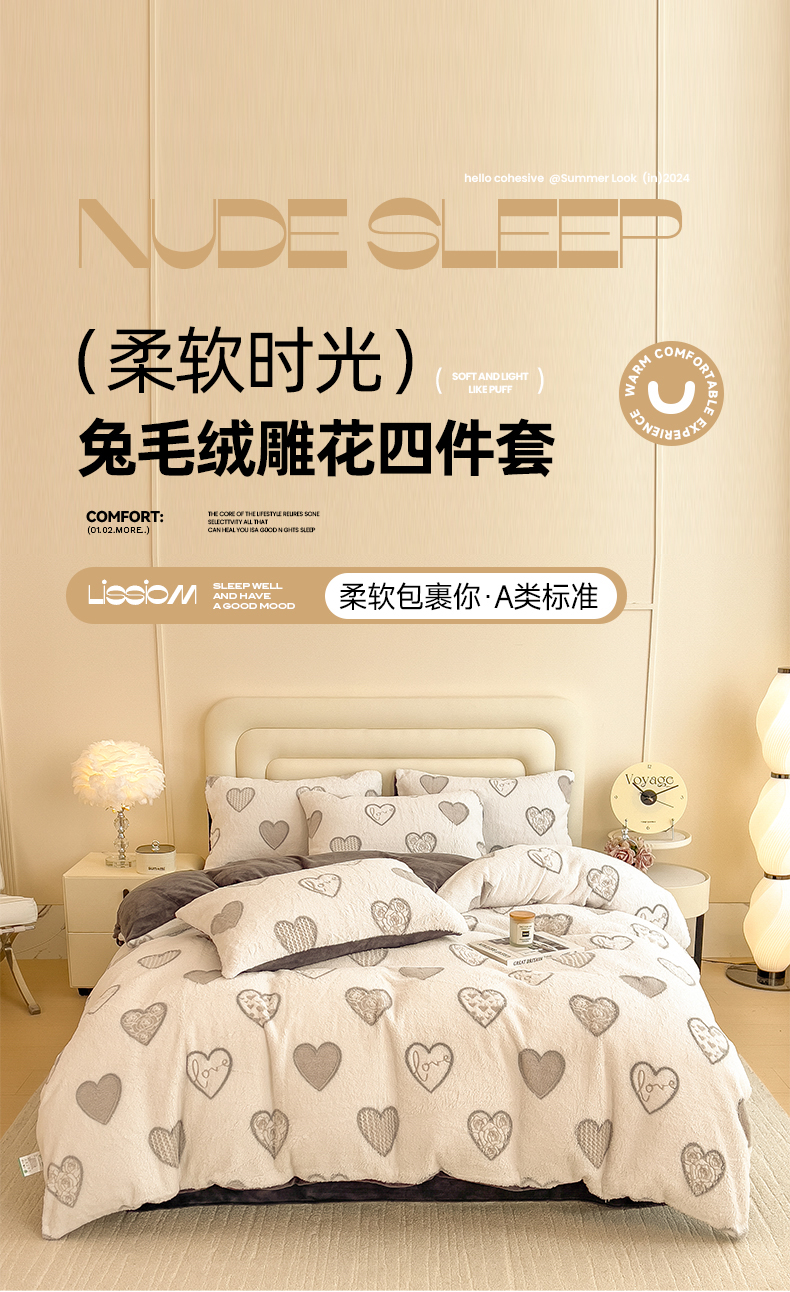 商品名称:摩妮卡 2025新款A类加厚兔毛雕花牛奶绒四件套 爱情爱心-灰