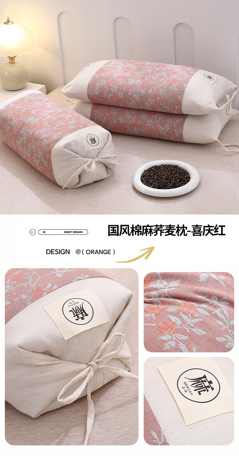 商品名称:梦叶草 2025新款国风棉麻荞麦枕芯可调节高度荞麦枕护颈椎反弓苦荞麦枕头 国风棉麻荞麦枕-浅脂玫