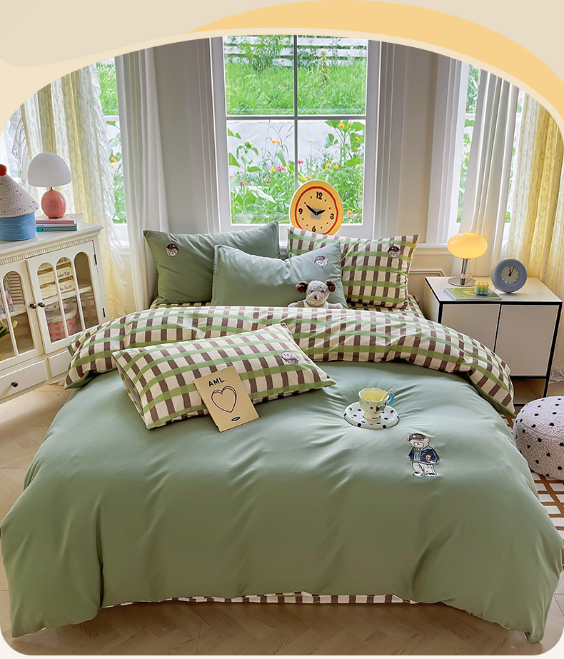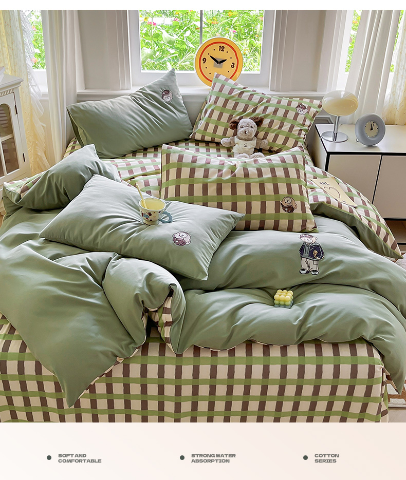 (总)大境 2026新款色织全棉水洗棉刺绣四件套小清新纯棉四件套,篮球小熊-格子咖,篮球小熊-格子蓝,篮球小熊-条纹粉,篮球小熊-条纹绿,篮球小熊-细条灰