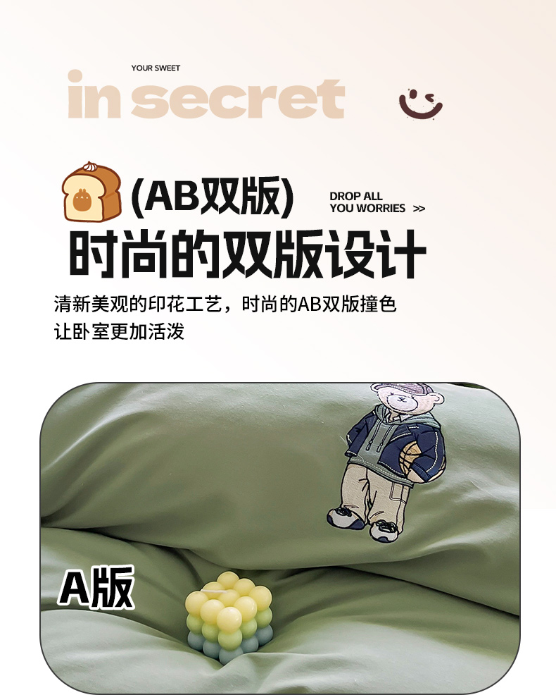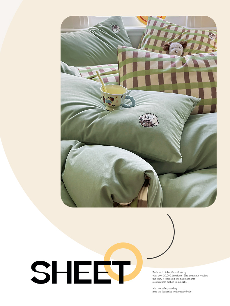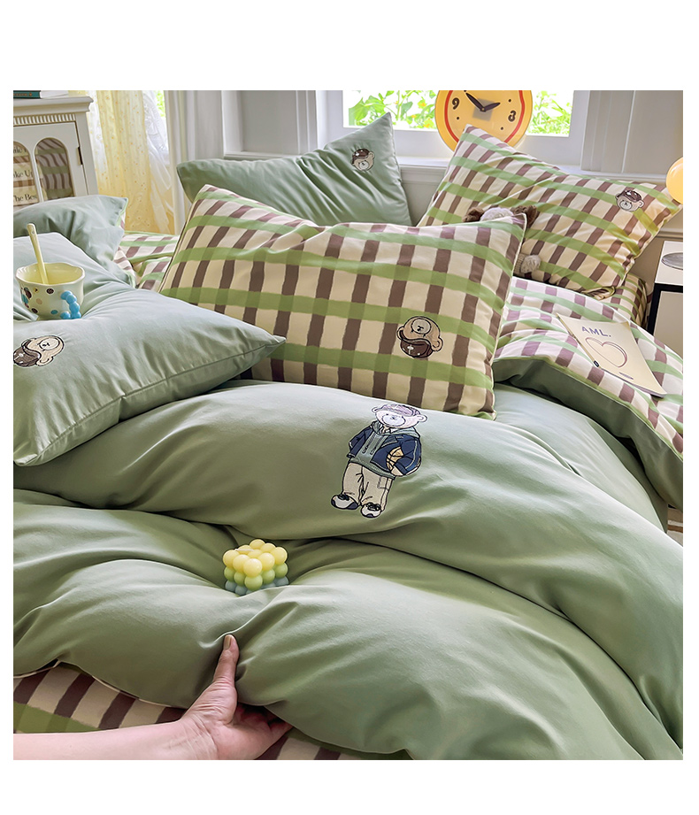 商品名称:大境 2025秋冬专版刺绣A类全棉磨毛四件套三件套 篮球小熊-抹茶绿
