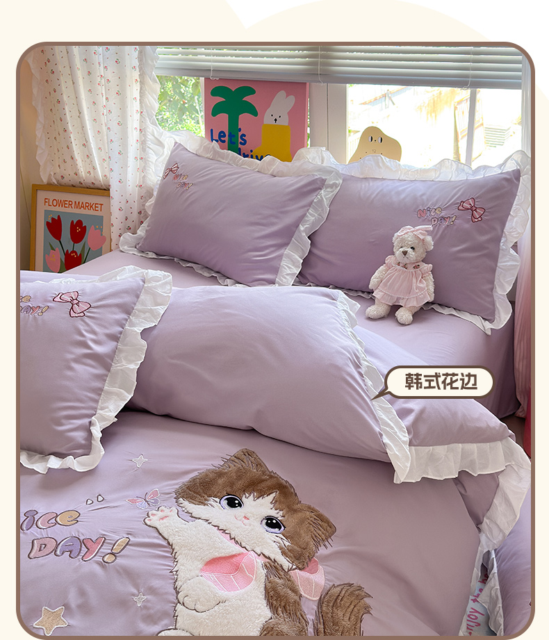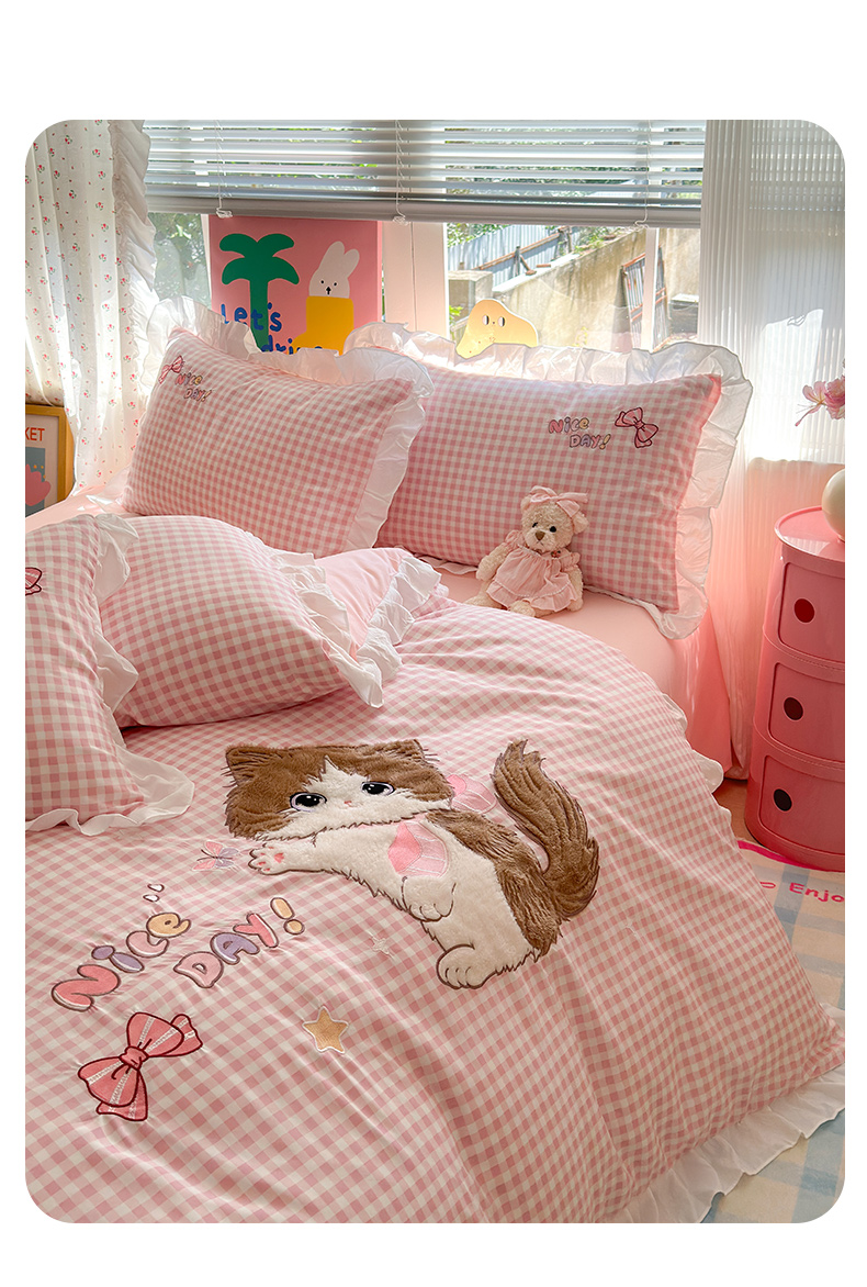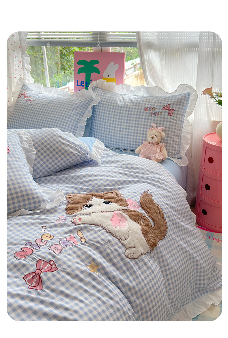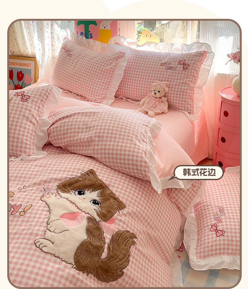 (总)易禾 2025新款韩版牛奶绒卡通兔毛贴布刺绣床单款床笠款四件套三件套小奶猫系列(专版),小奶猫——粉格,小奶猫——蓝格,小奶猫——浅粉,小奶猫——浅紫