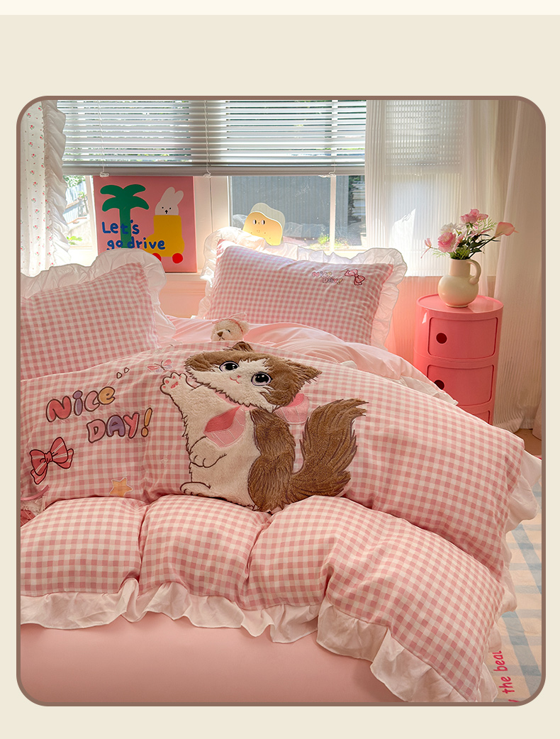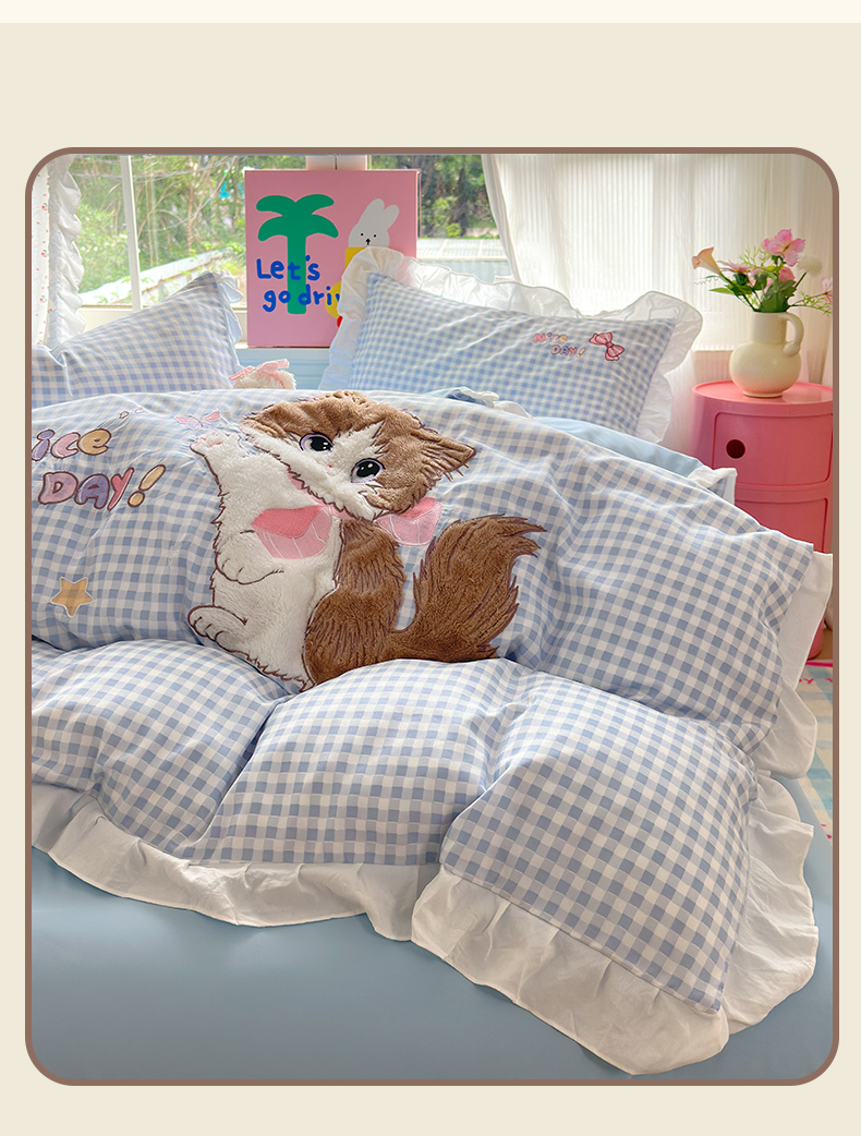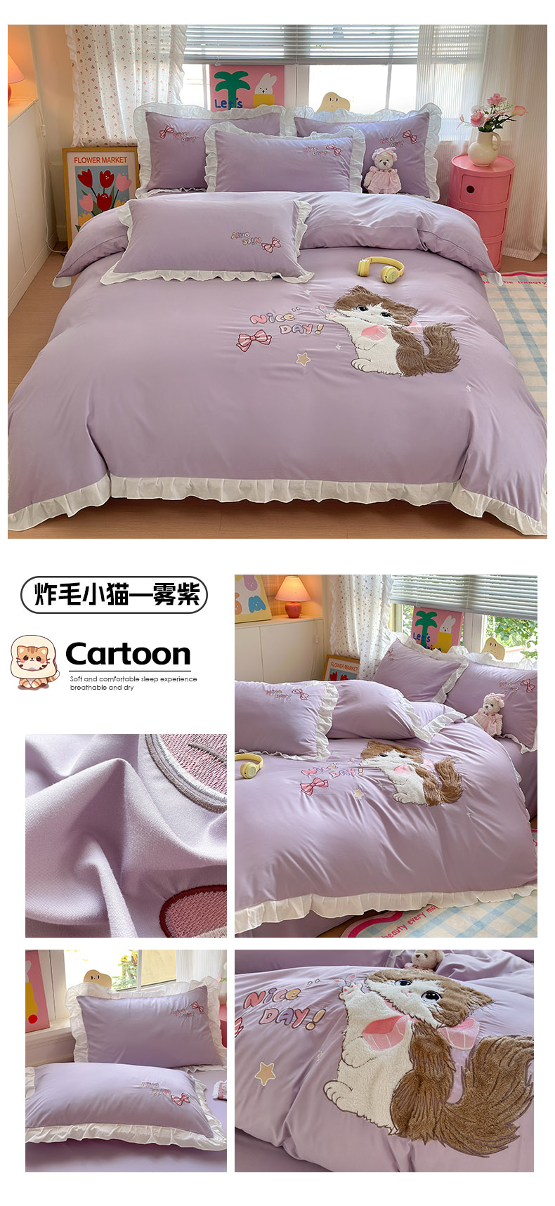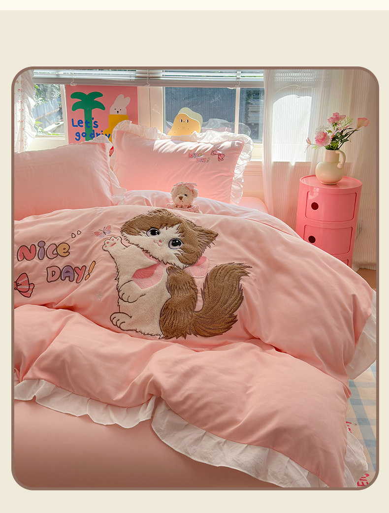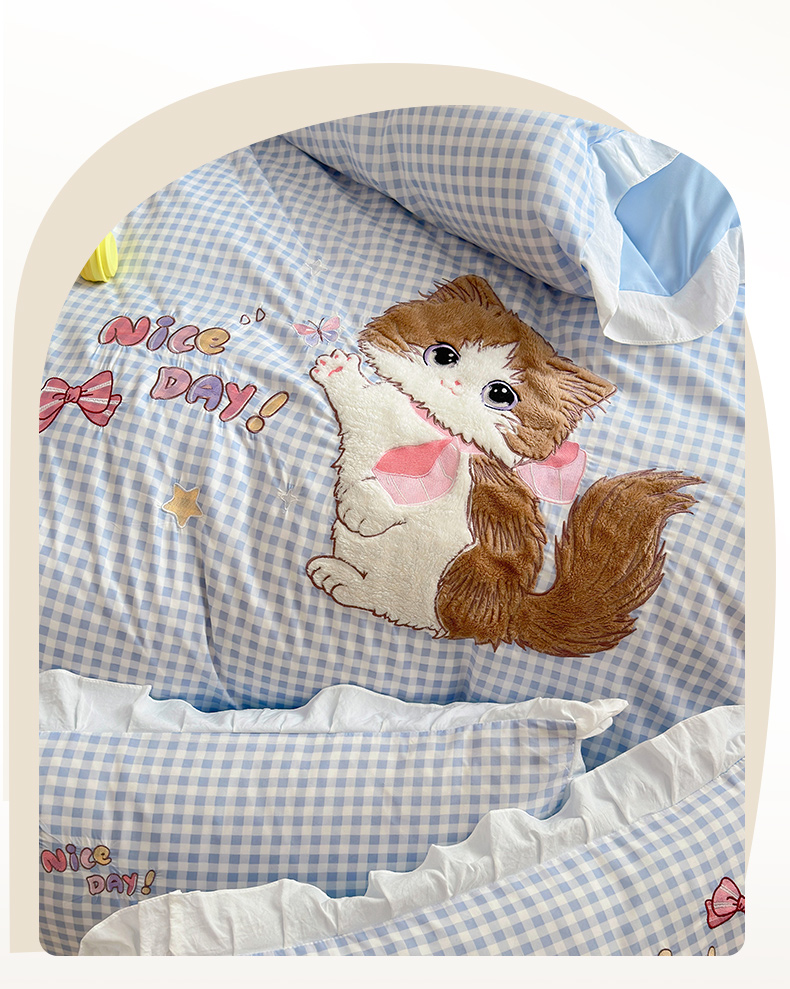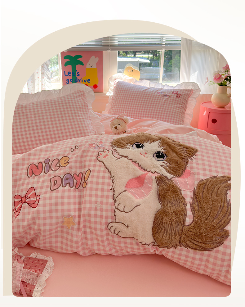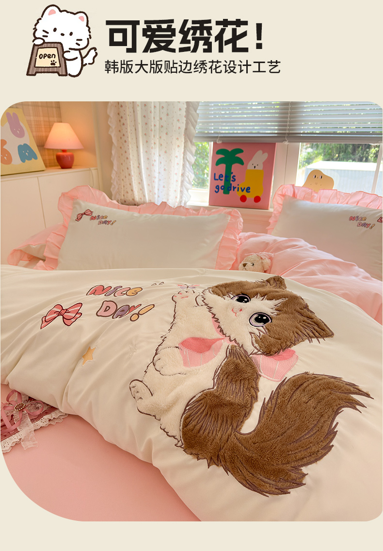 (总)易禾家纺 2025新款韩版卡通兔毛贴布绣水洗棉四件套学生宿舍三件套-炸毛小猫