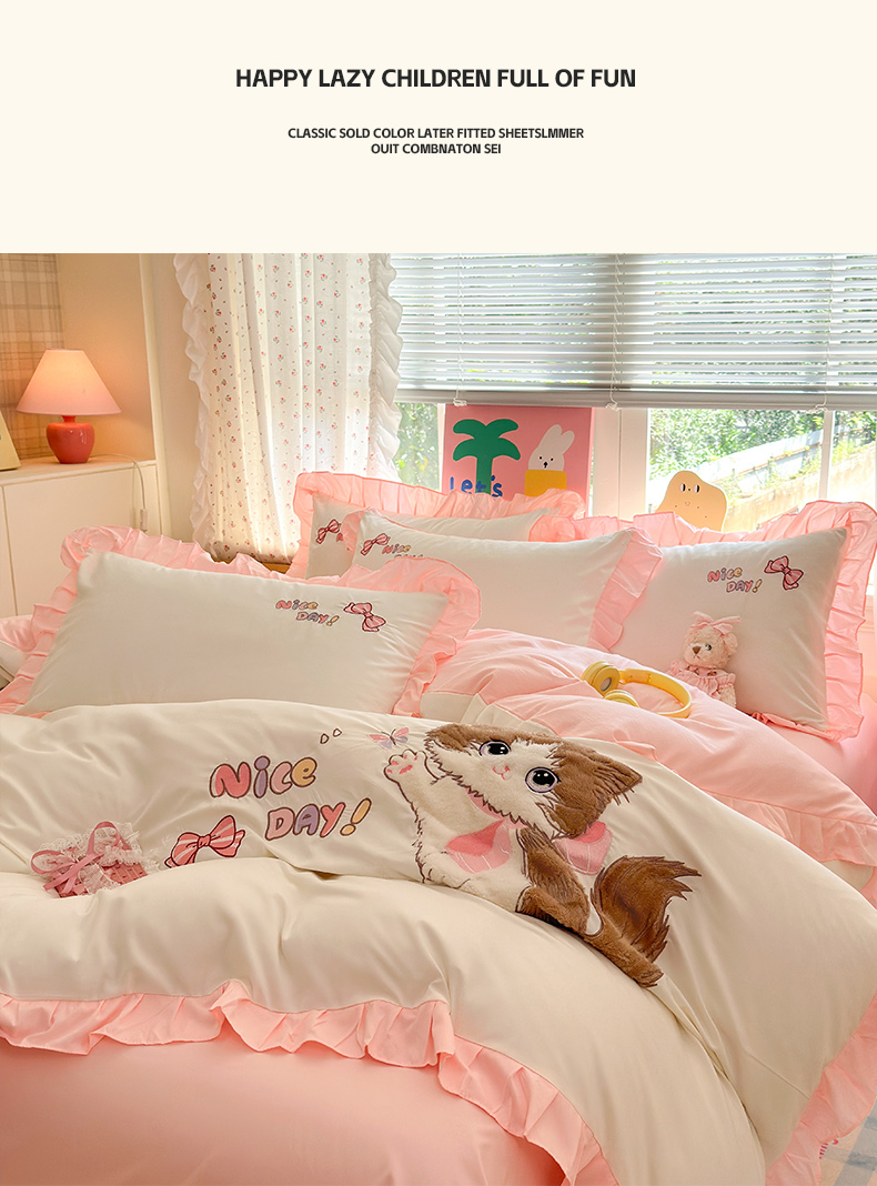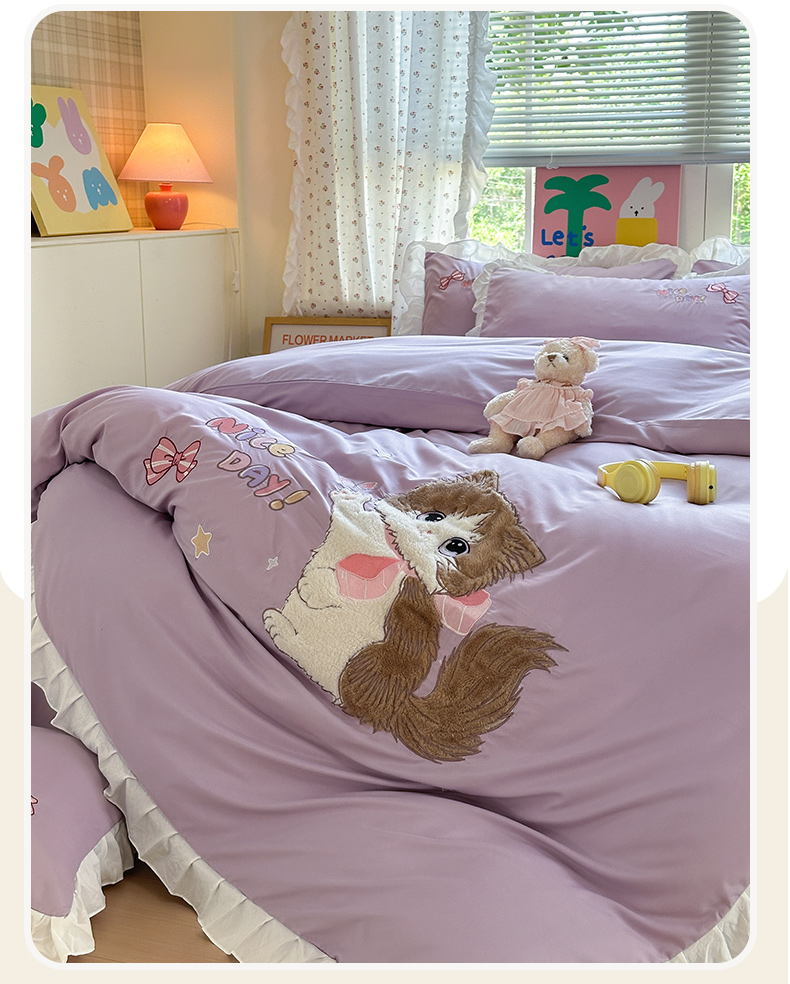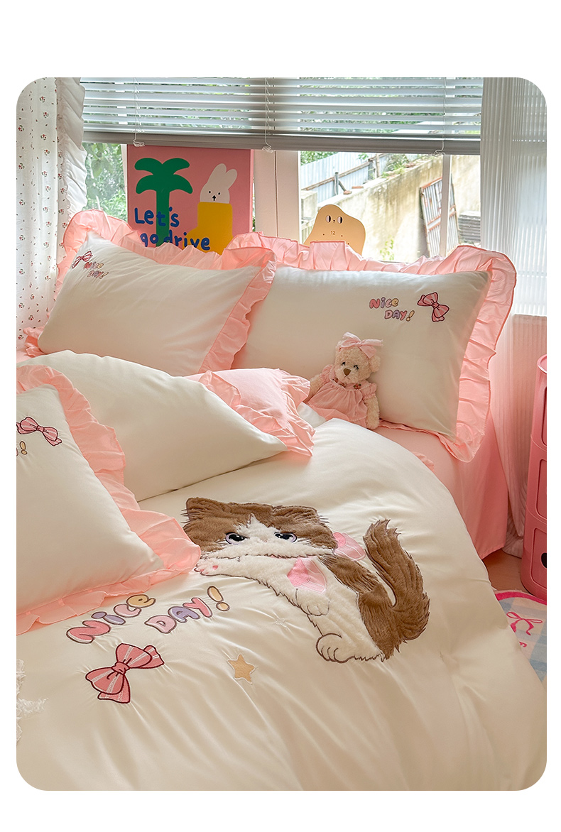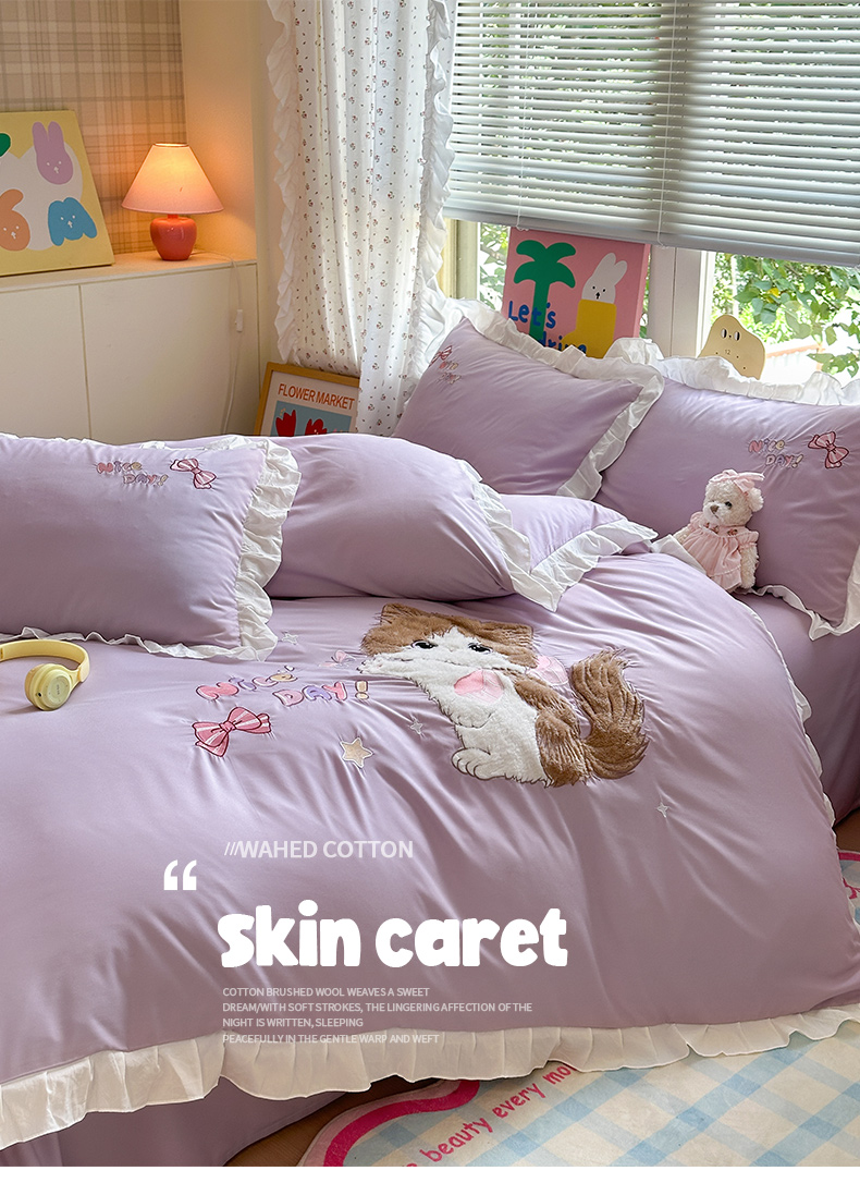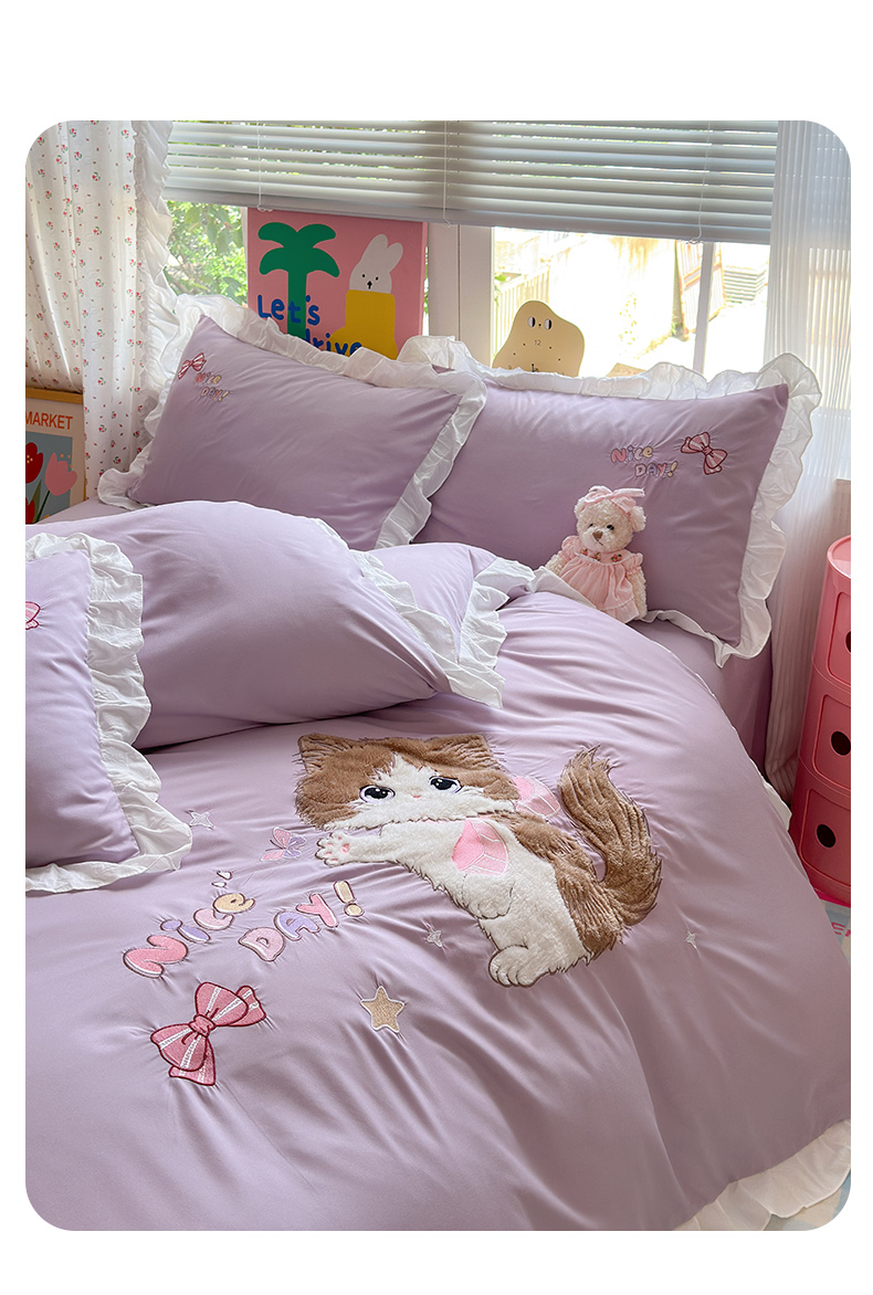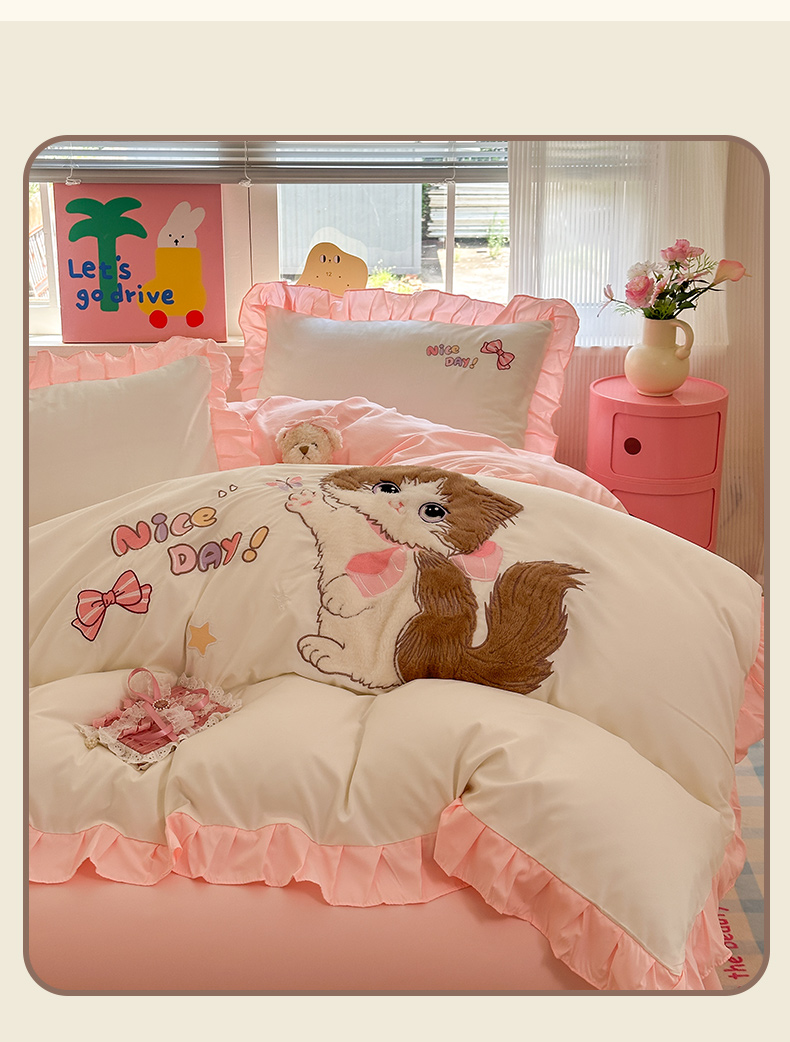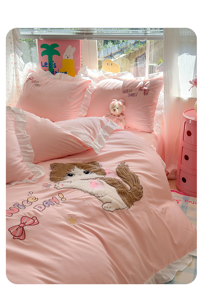 (总)易禾家纺 2025新款韩版卡通兔毛贴布绣水洗棉四件套学生宿舍三件套-炸毛小猫