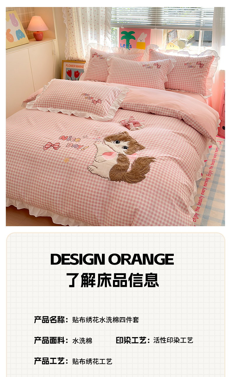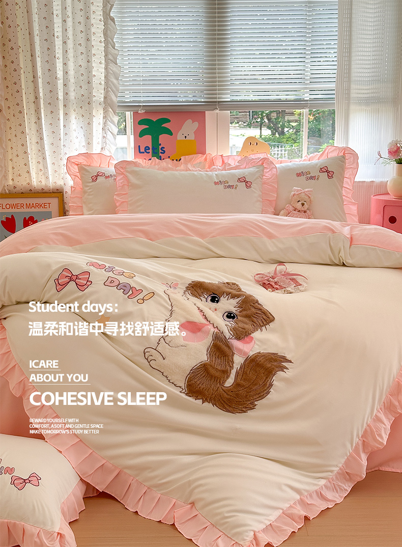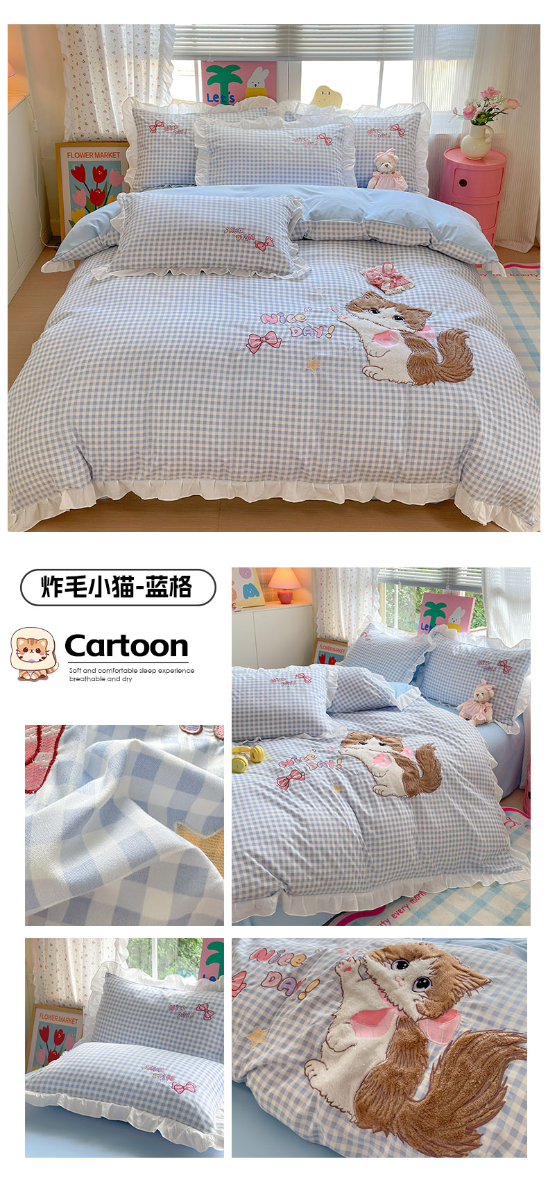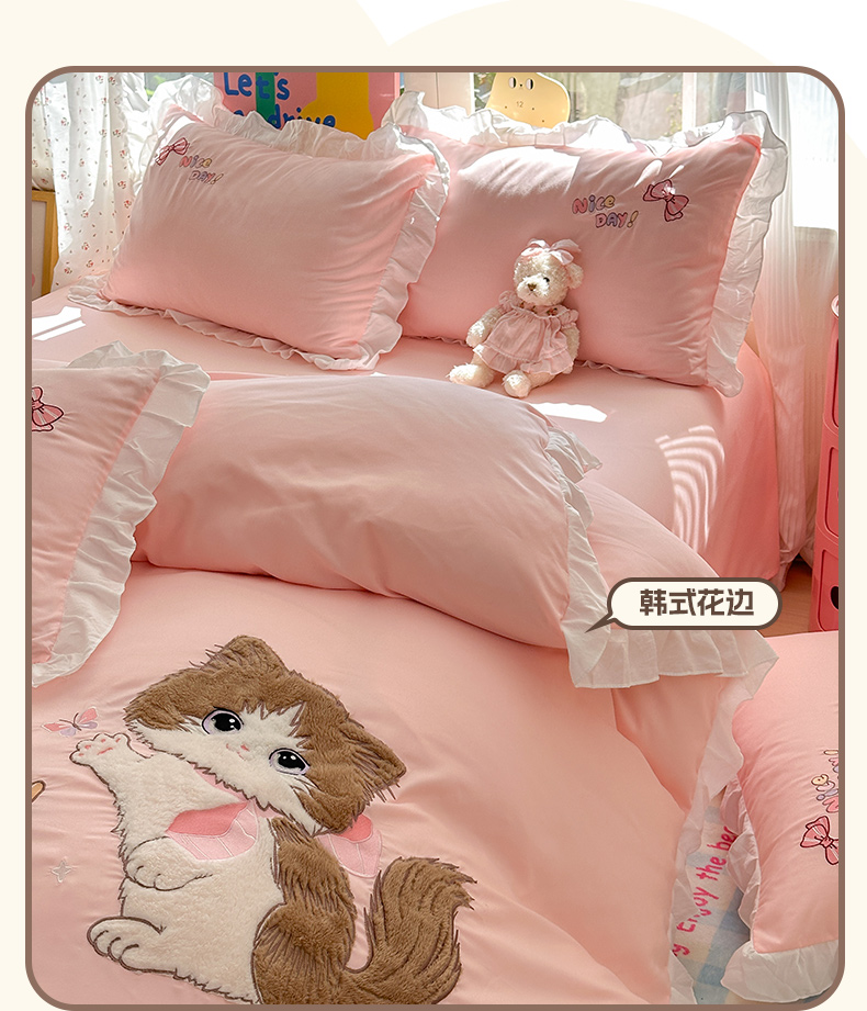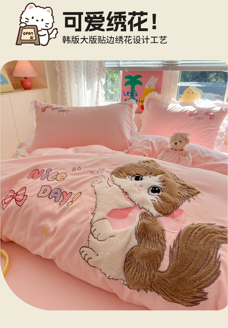 商品名称:(总)易禾家纺 2025新款韩版卡通兔毛贴布绣水洗棉四件套学生宿舍三件套-炸毛小猫
