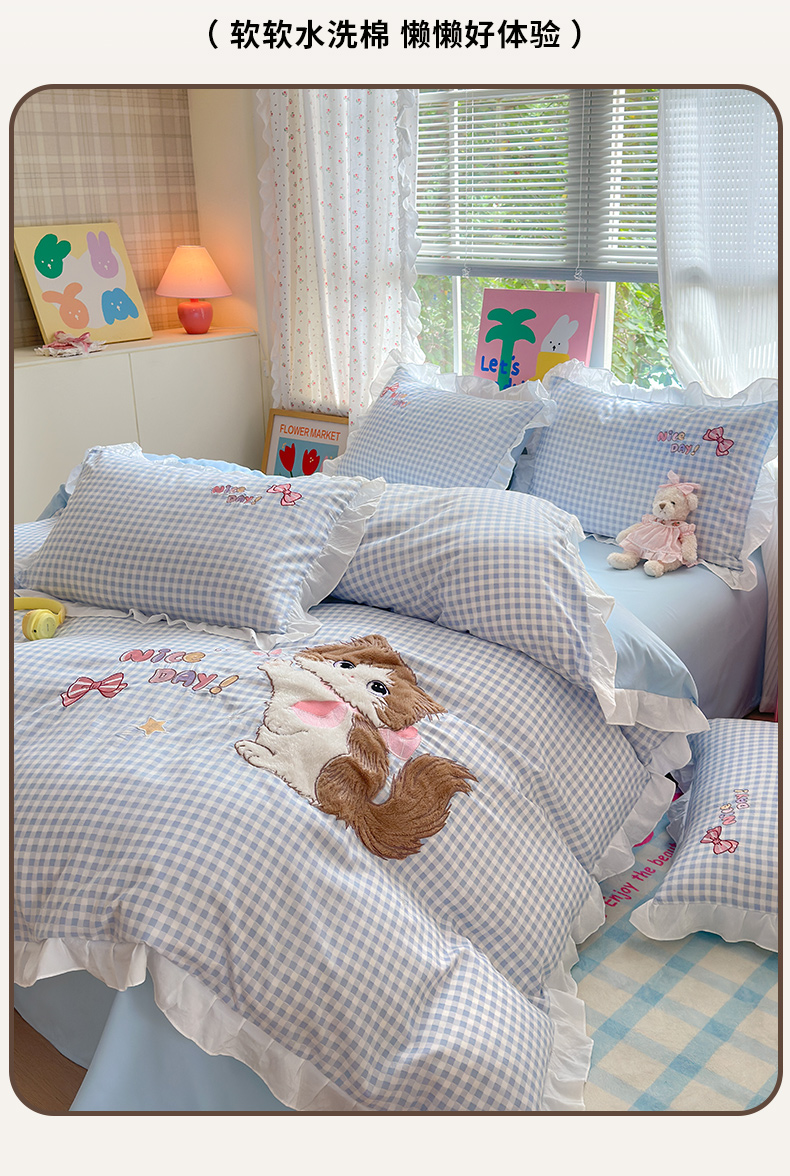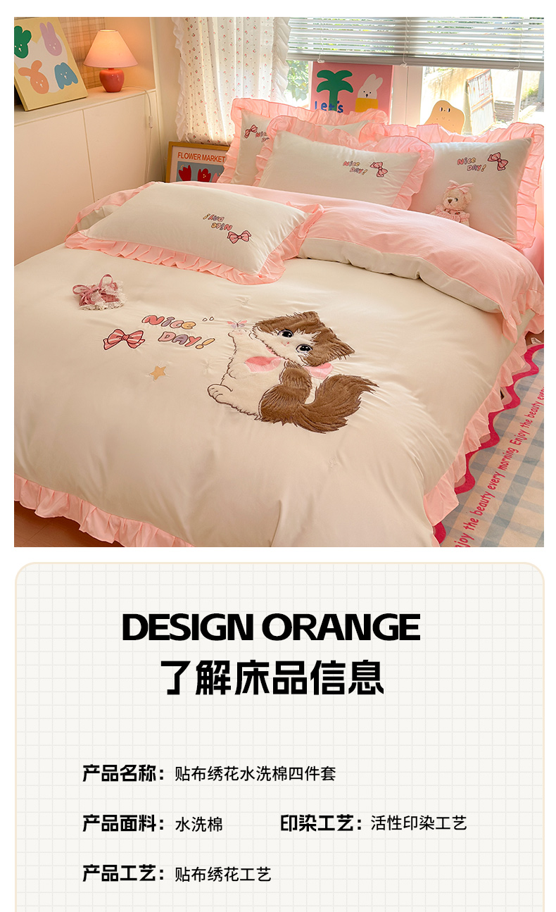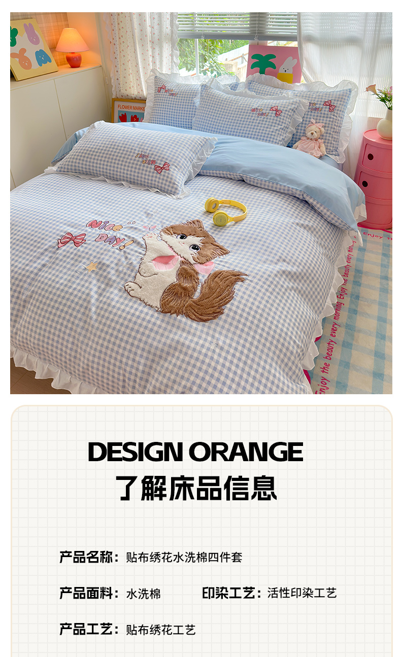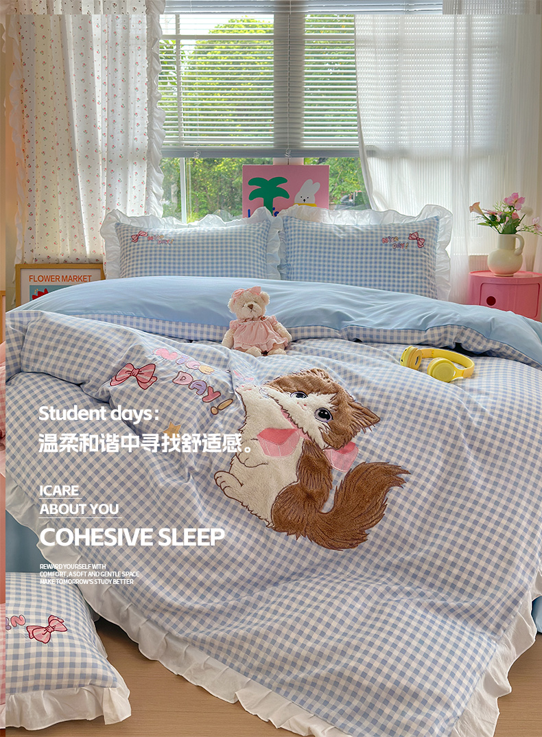 商品名称:(总)易禾家纺 2025新款韩版卡通兔毛贴布绣水洗棉四件套学生宿舍三件套-炸毛小猫