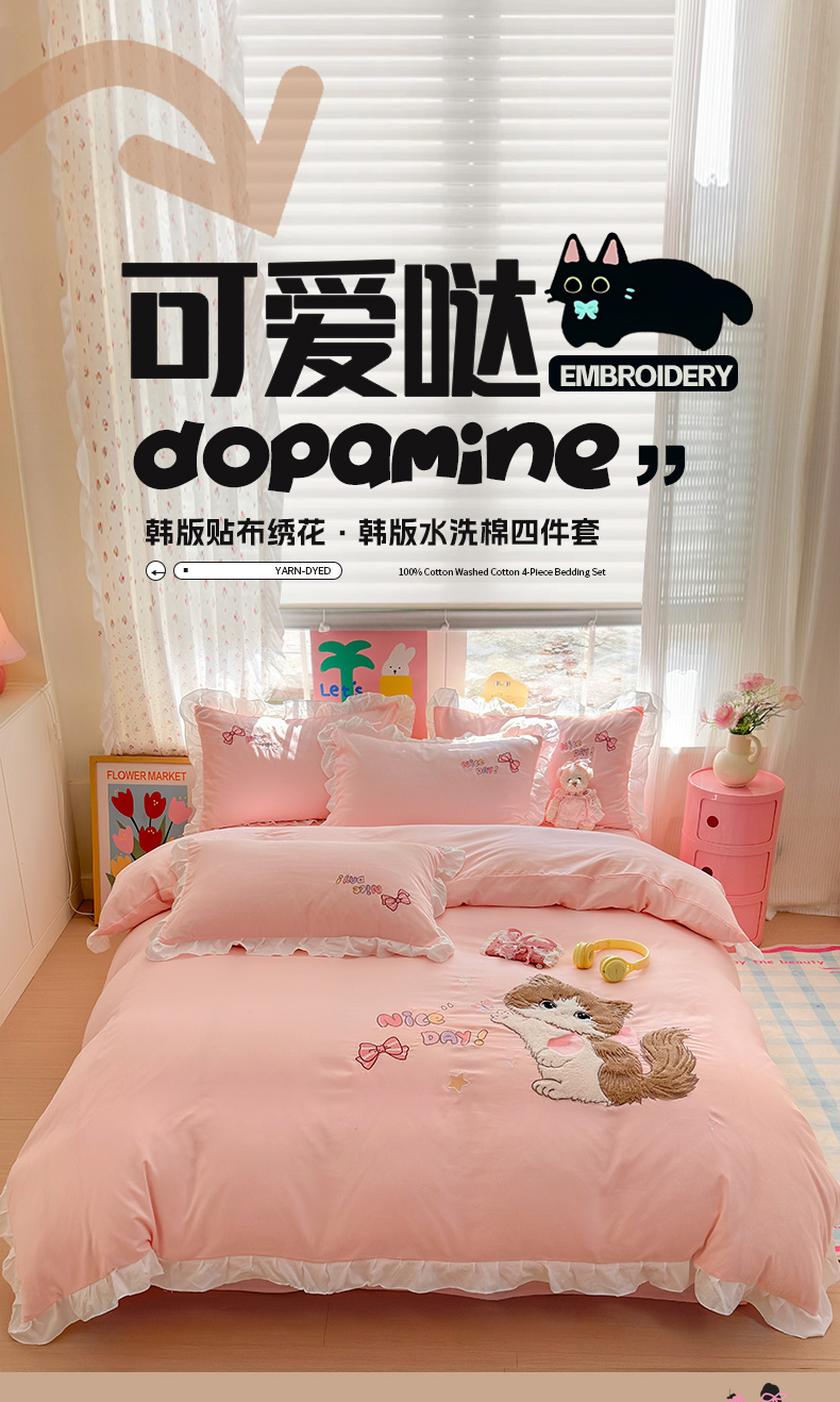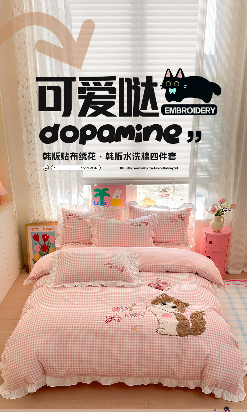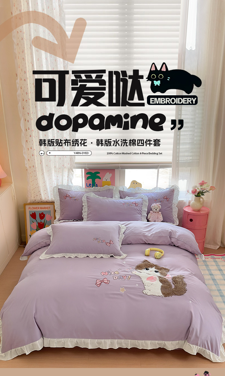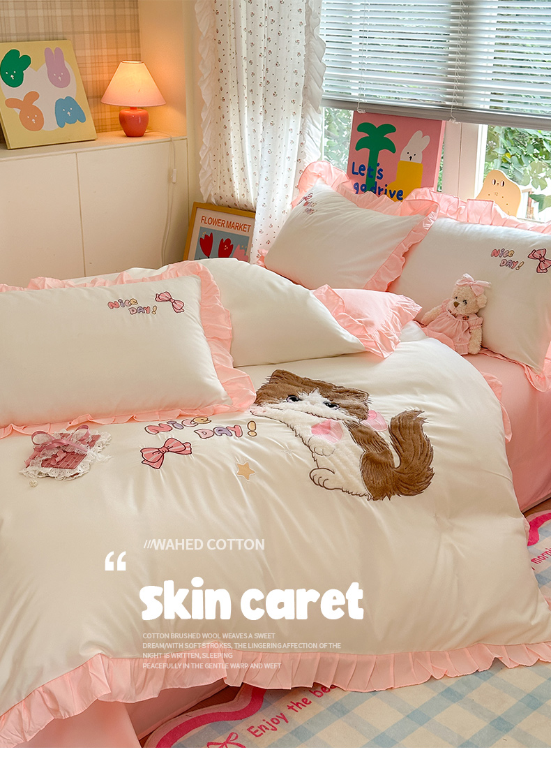 商品名称:(总)易禾家纺 2025新款韩版卡通兔毛贴布绣水洗棉四件套学生宿舍三件套-炸毛小猫