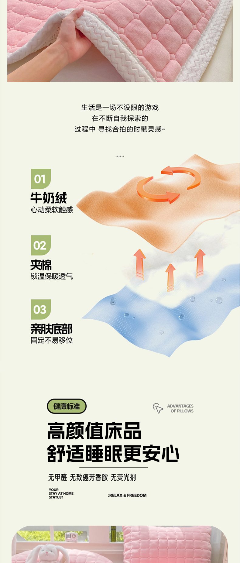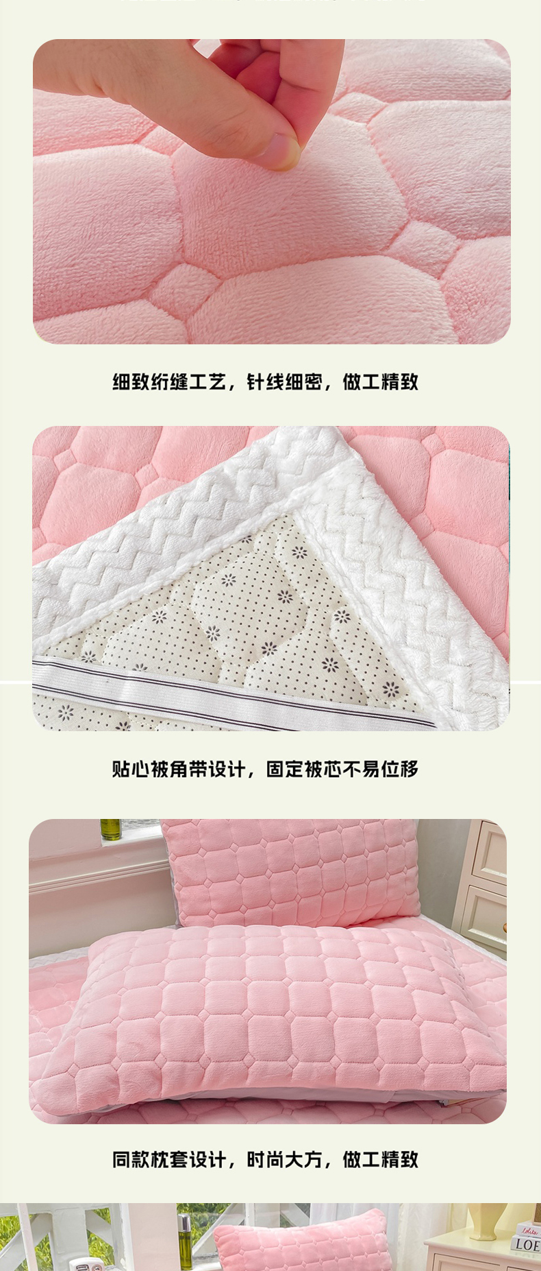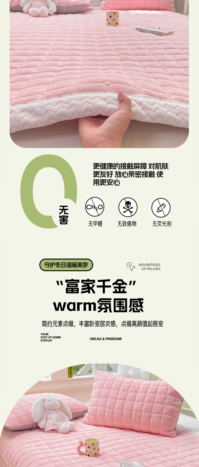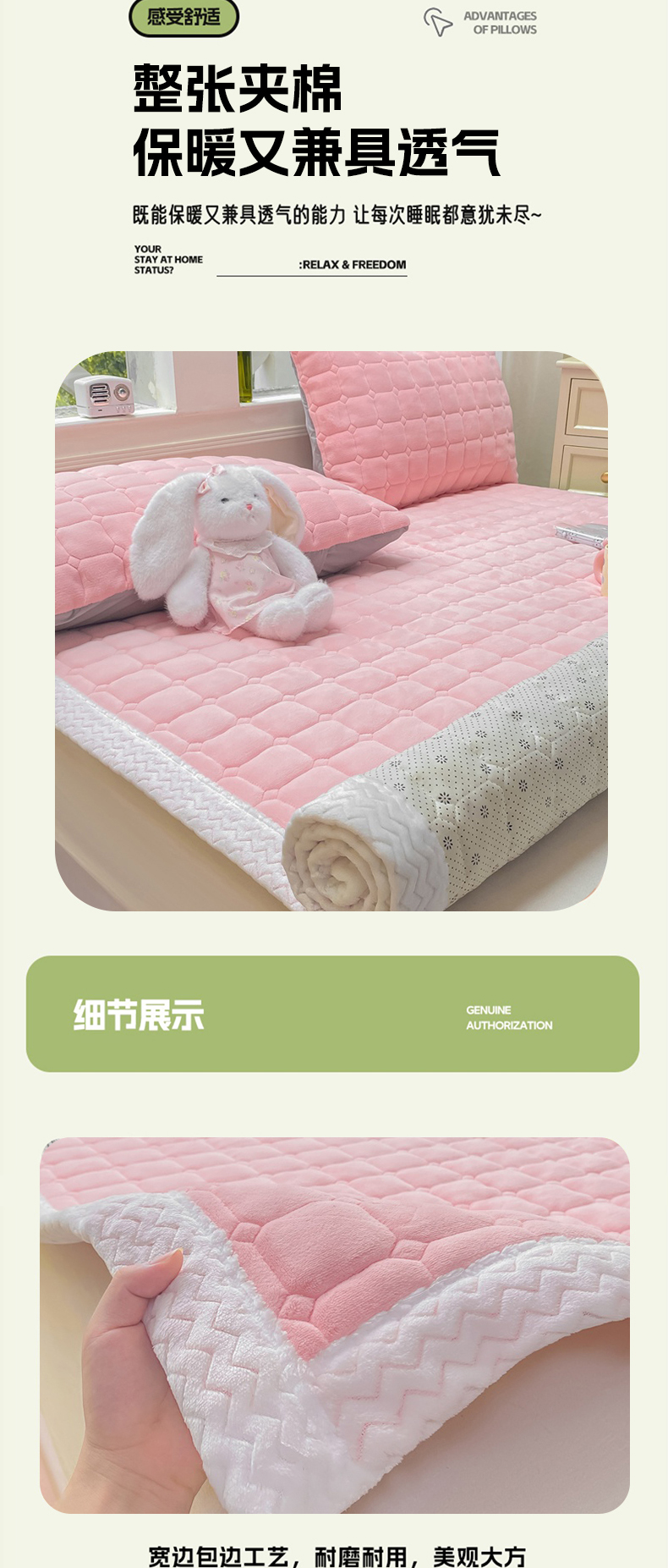 (总)麒东家纺 2025年新款兔毛绒泡泡绒夹棉床垫,粉色,咖色,绿色,米白,浅灰,深灰,天蓝