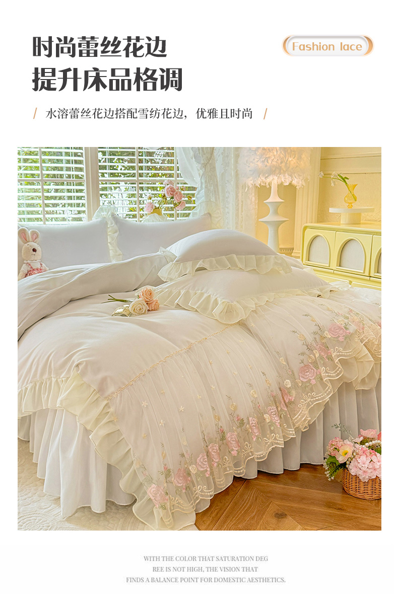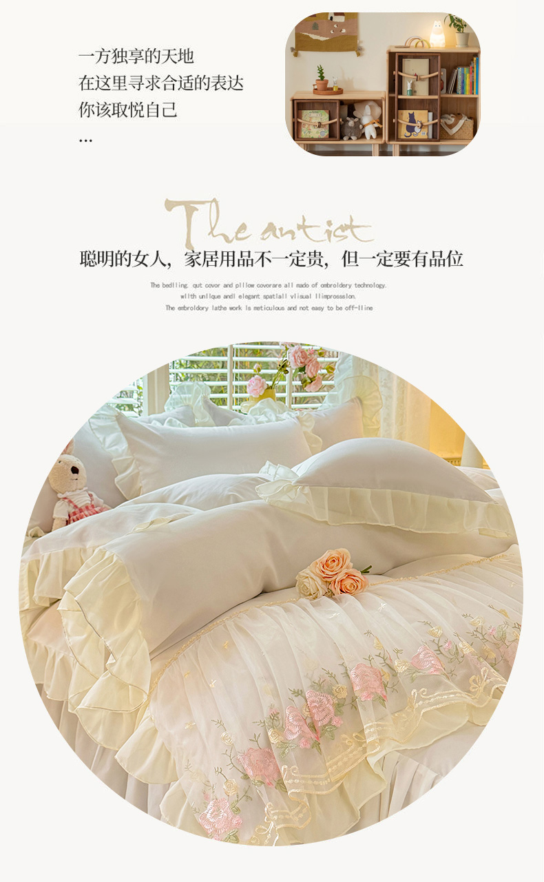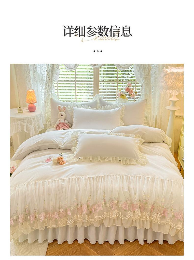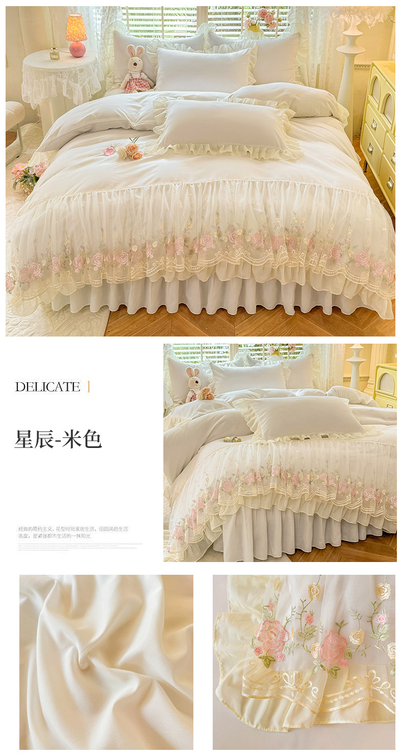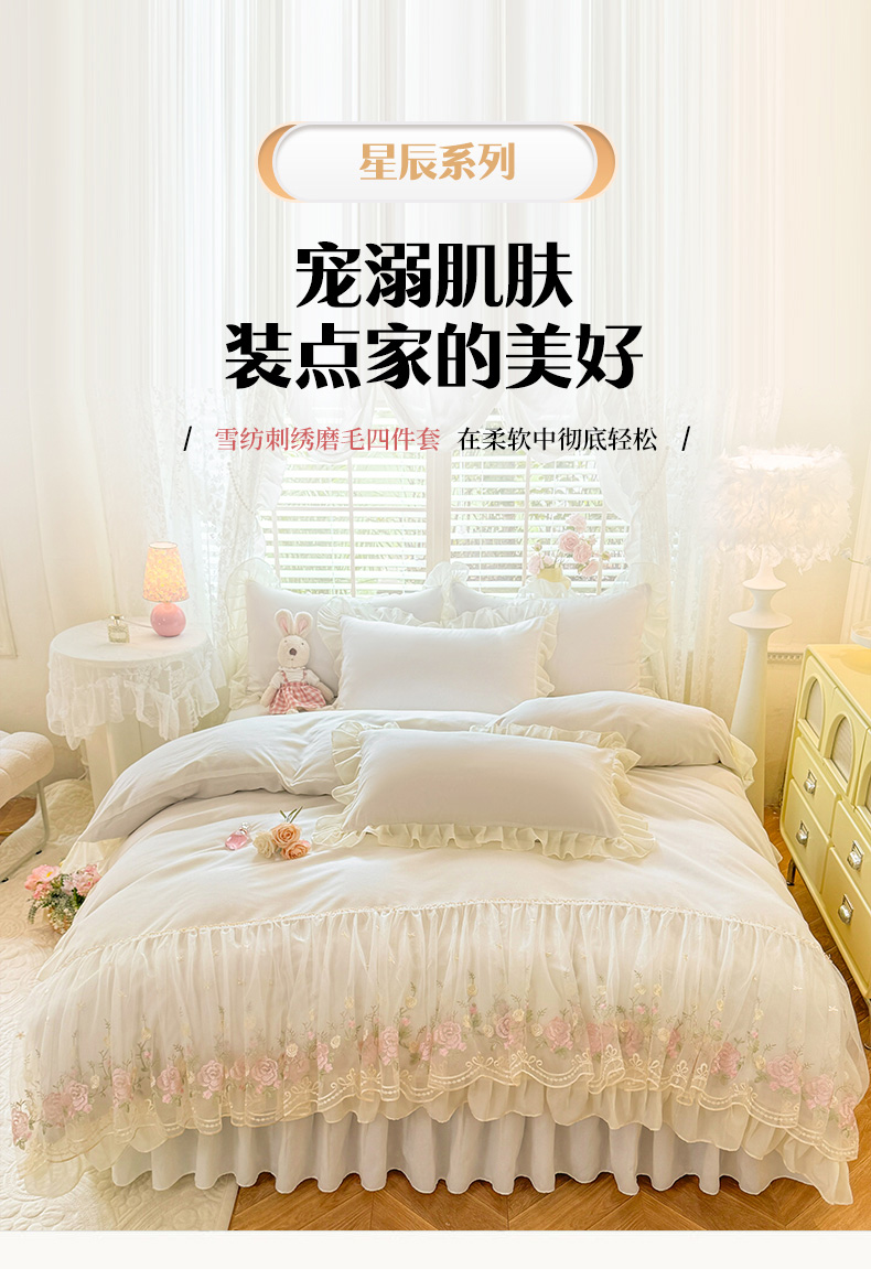 当前位置: 91家纺网 > 商品网购 > 床品套件 > 四件套 > 其它四件套 > 后庭寝室 2025新款韩版蕾丝床裙款四件套-星辰系列 星辰-米色