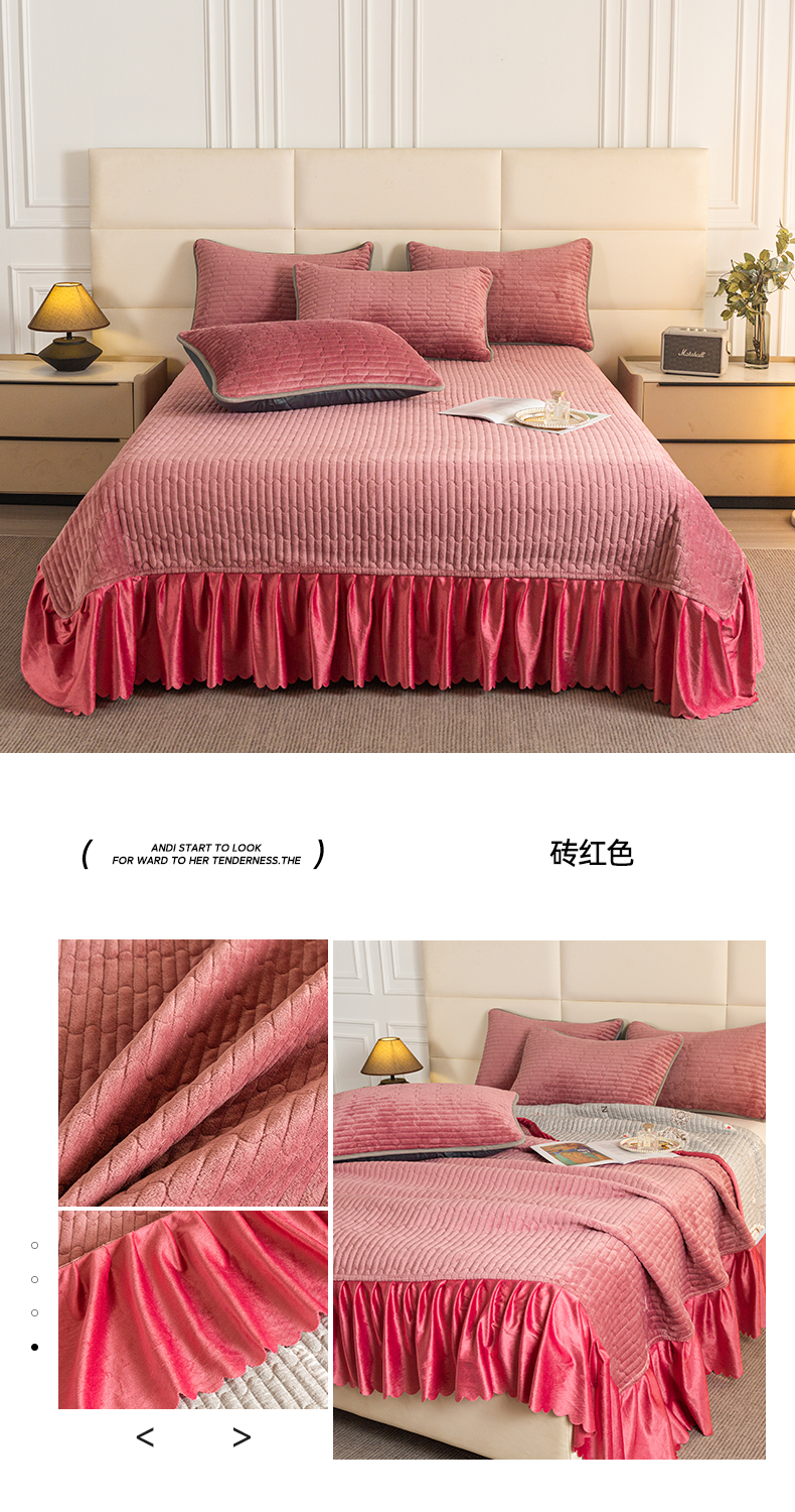 商品名称:梓依家纺 2025新款牛奶绒单床裙款蕾丝床盖三件套四件套 砖红色