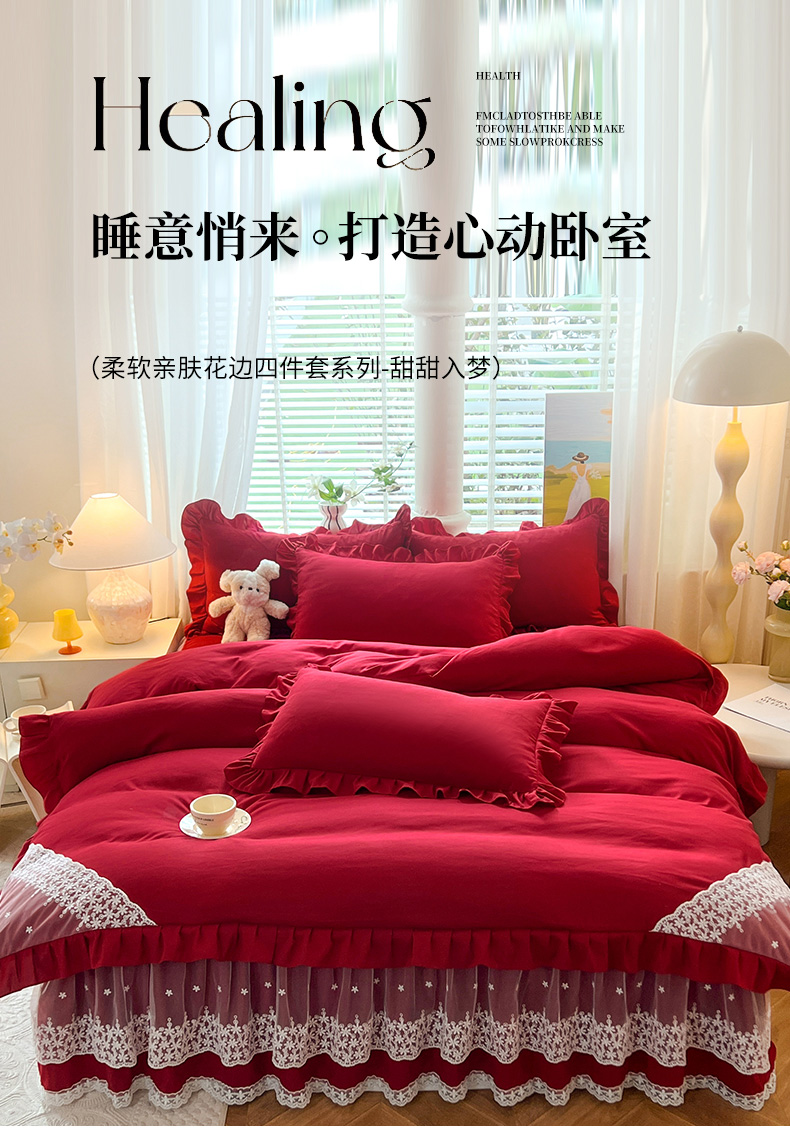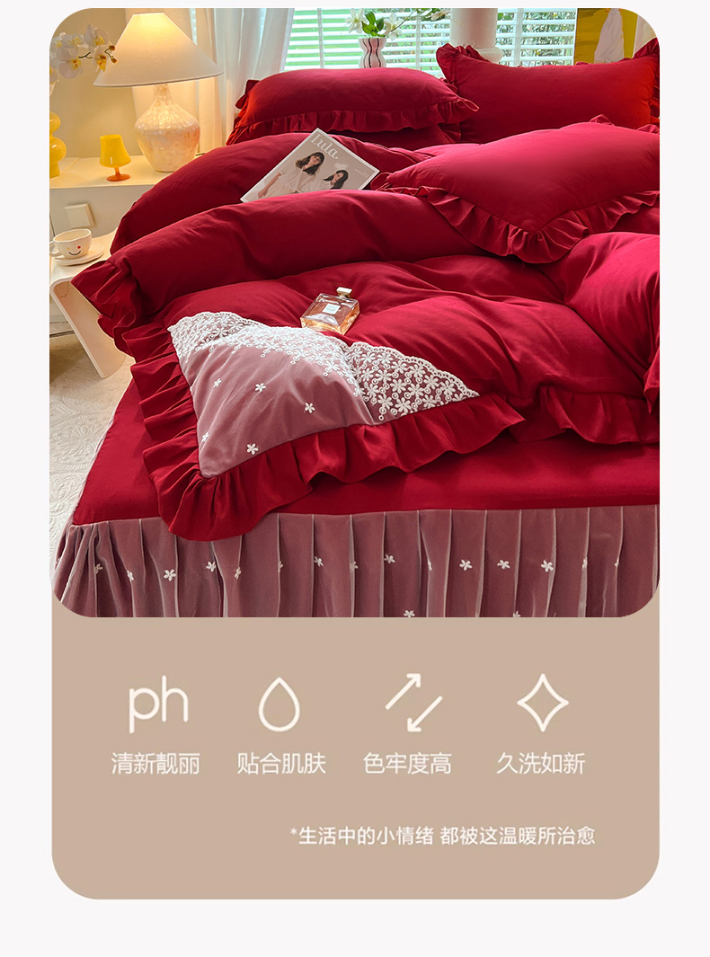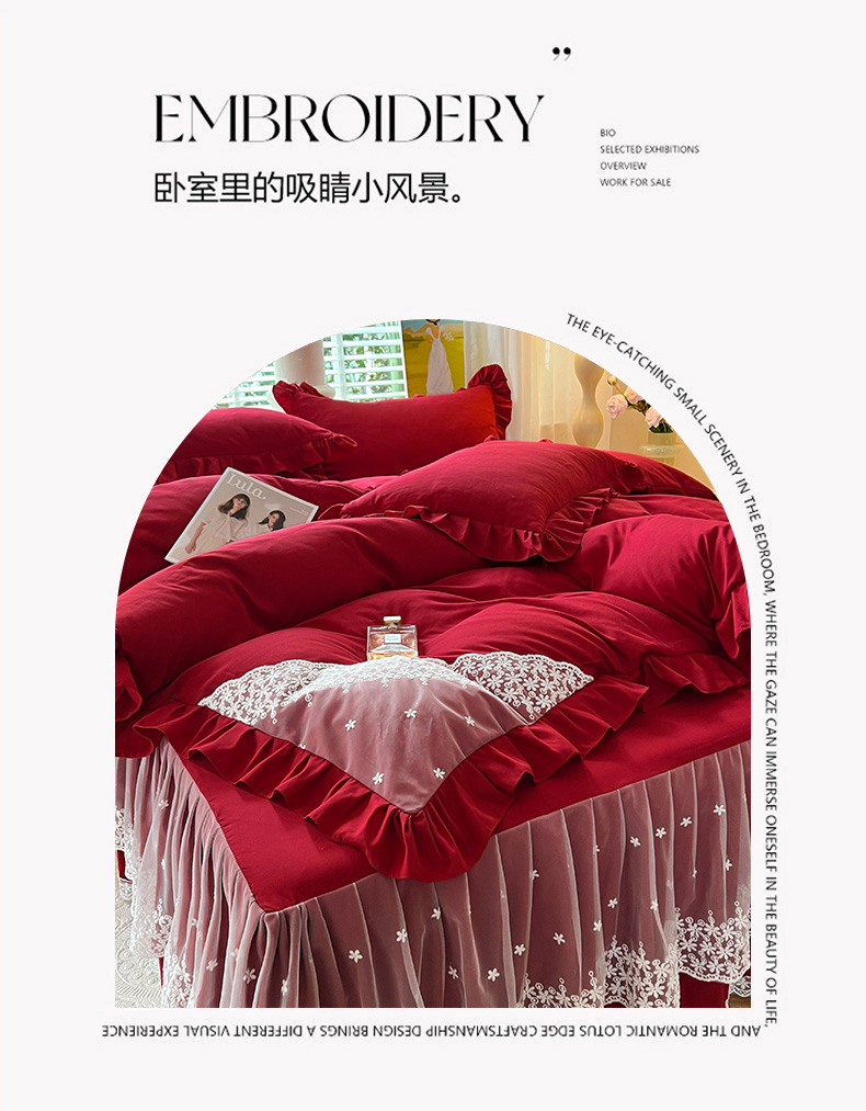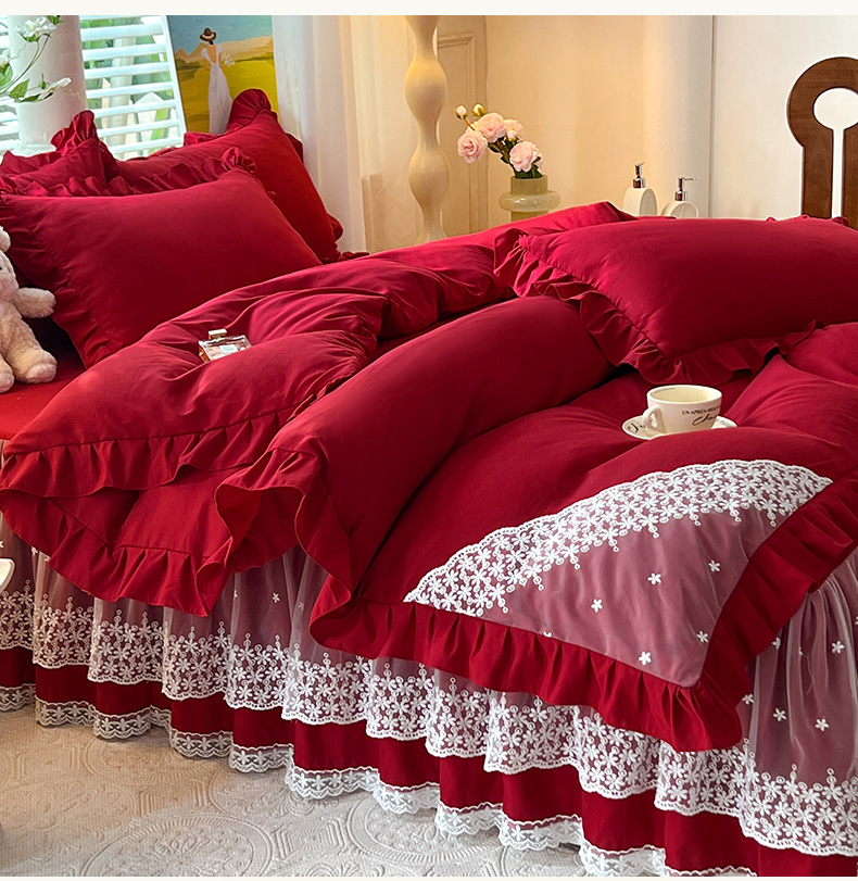 后庭寝室 2025新款柔软亲肤花边蕾丝床裙四件套-花颜系列 花颜-酒红