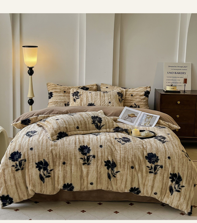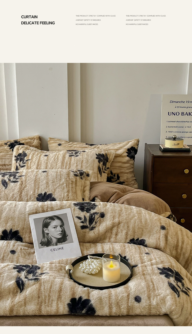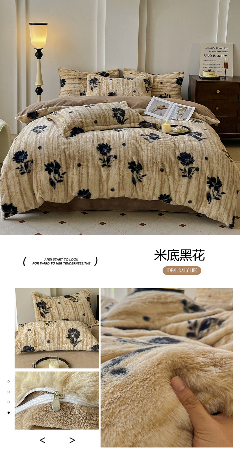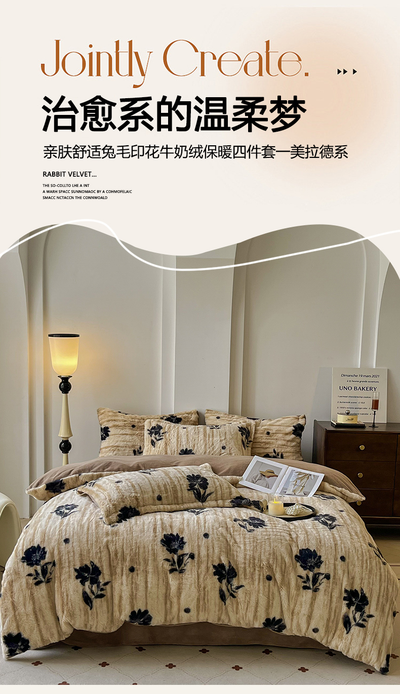 商品名称:梦纤绒 2025新款亲肤舒适兔毛印花牛奶绒保暖四件套一美拉德系 米底黑花