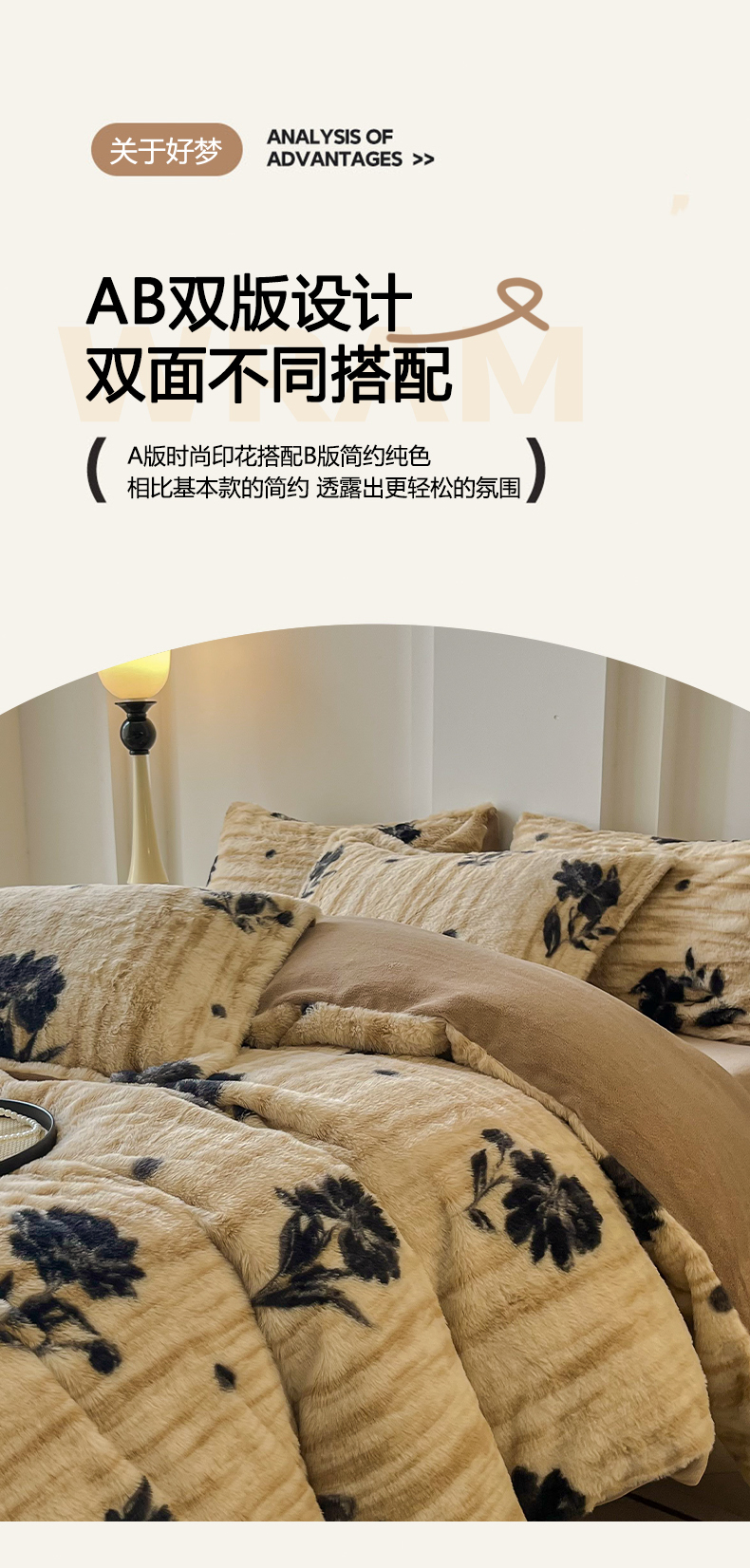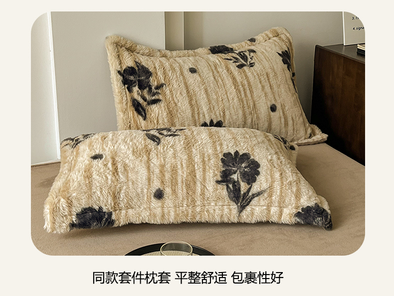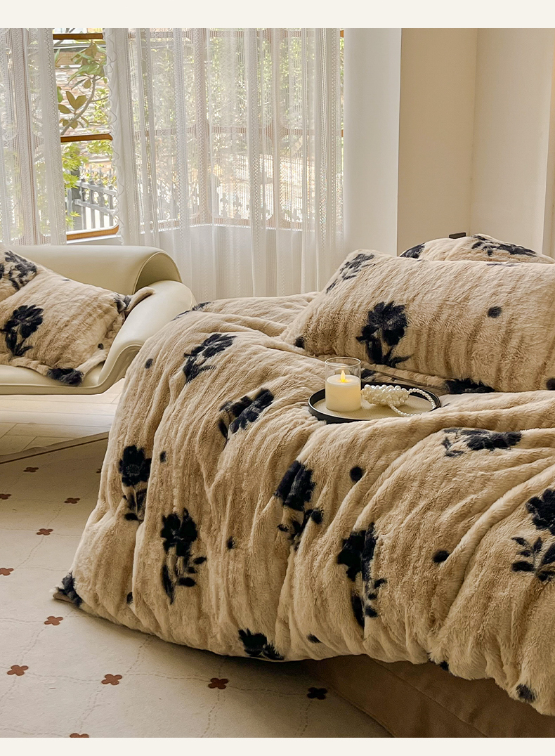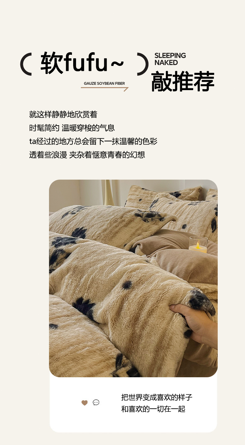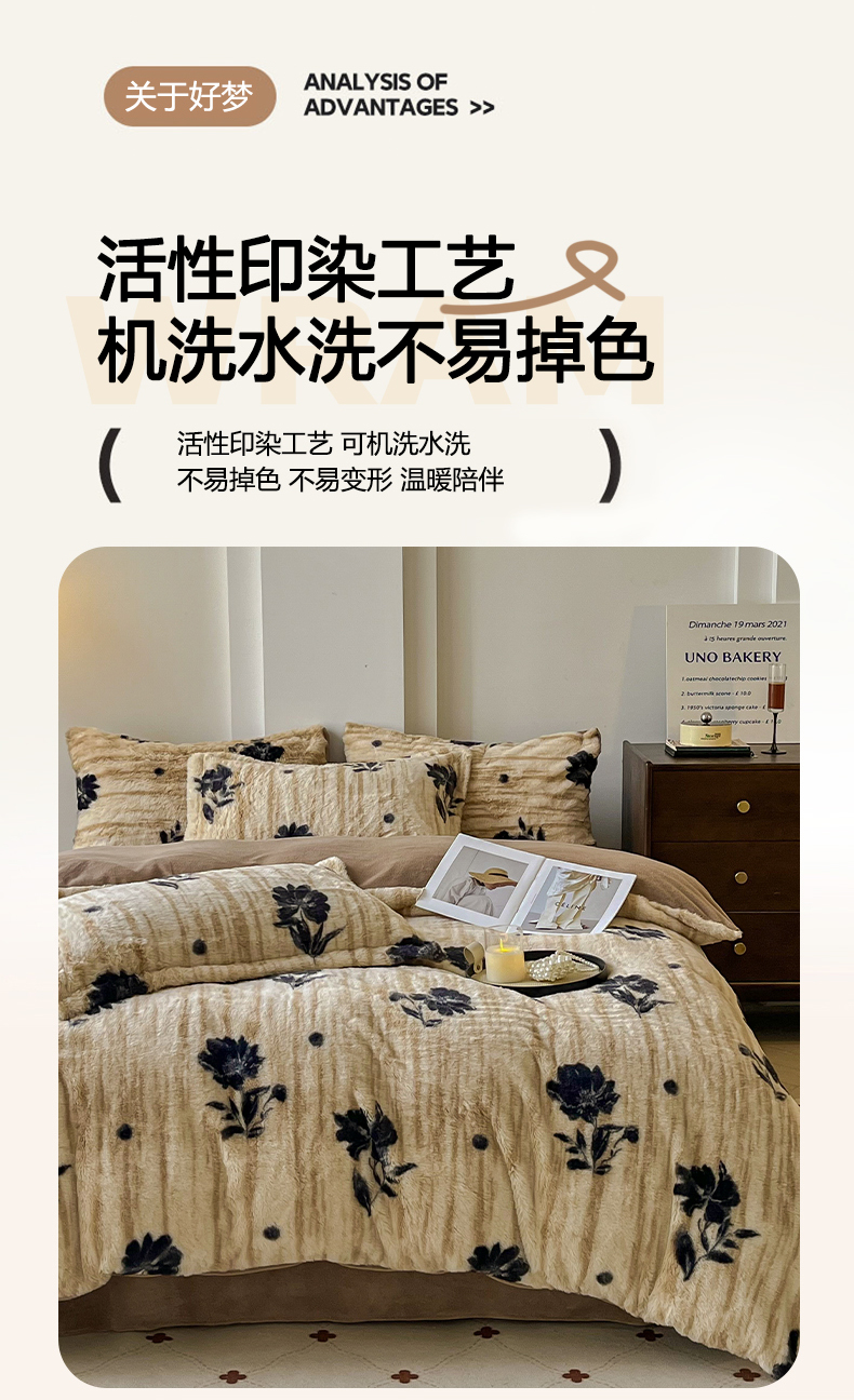 商品名称:梦纤绒 2025新款亲肤舒适兔毛印花牛奶绒保暖四件套一美拉德系 米底黑花