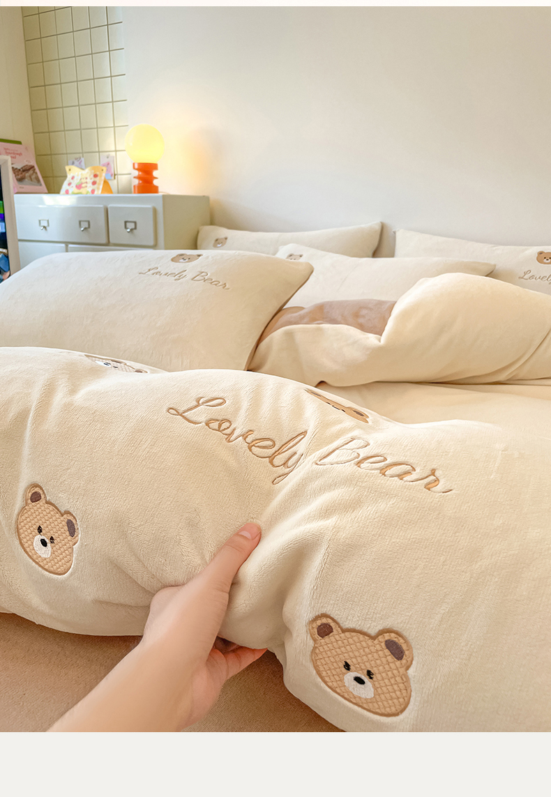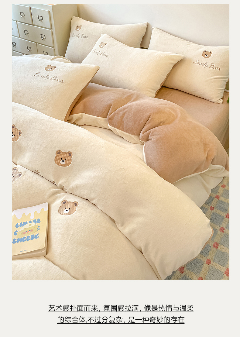 商品名称:美澳家纺 2025新款刺绣ins小清新高克重牛奶绒四件套床笠款四件套 小熊-奶白