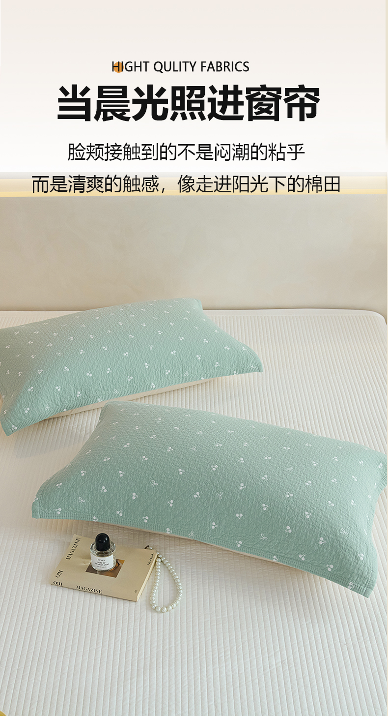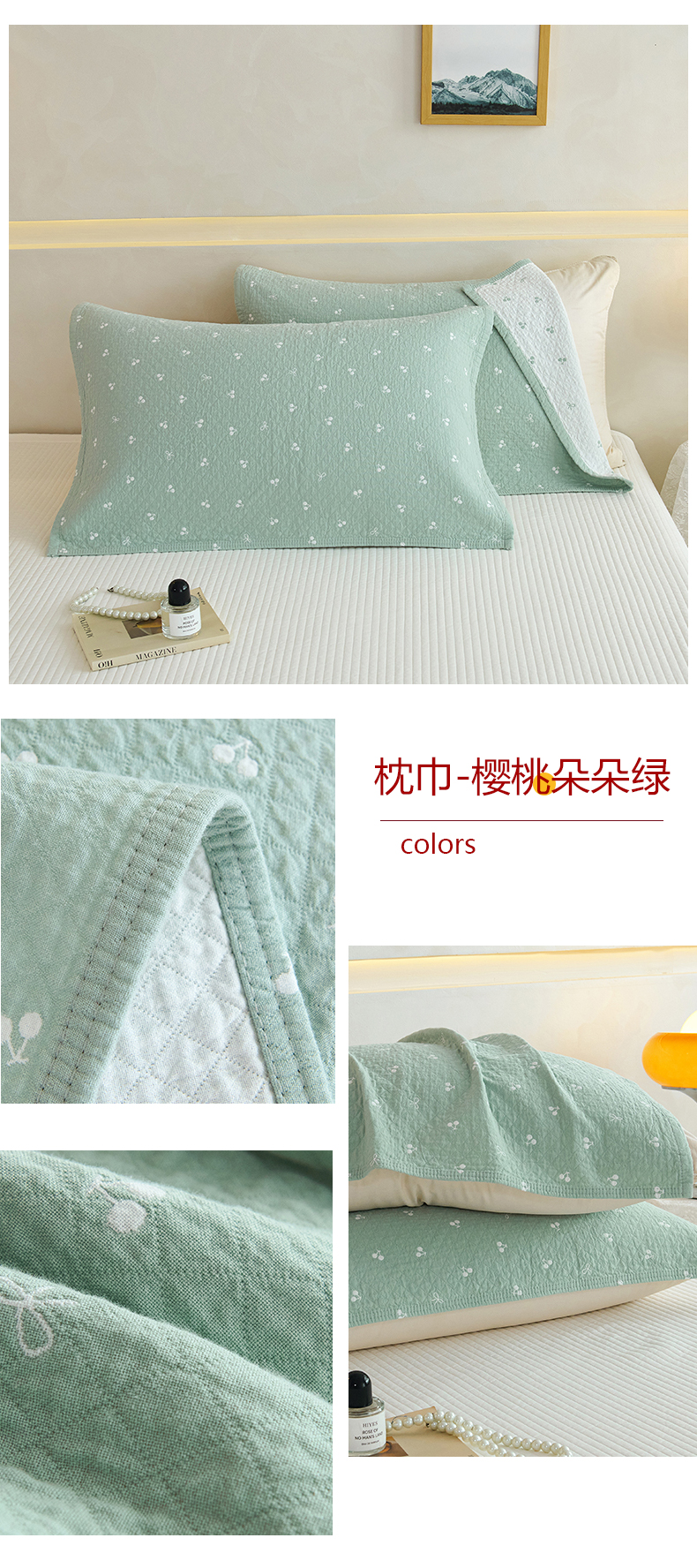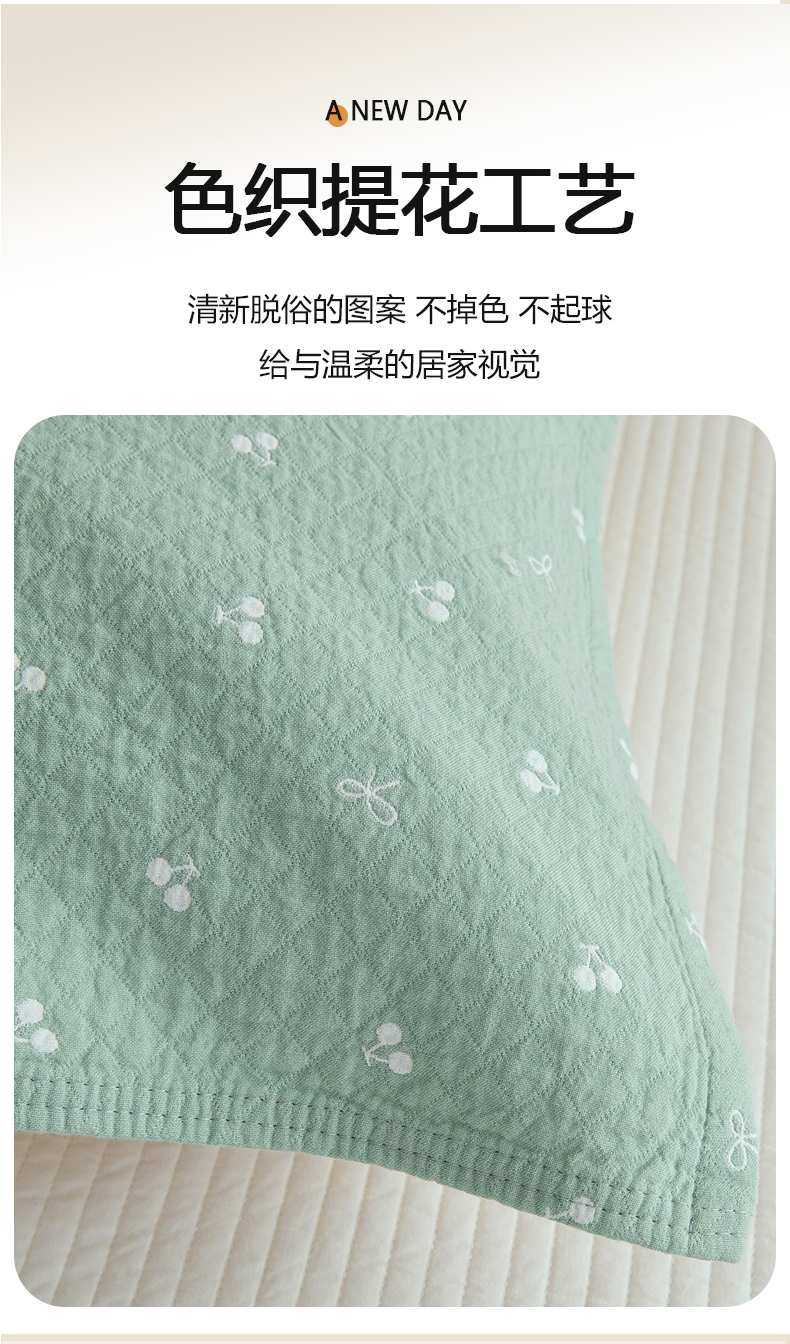 商品名称:棠薇家纺 2025新款 枕巾纯棉纱布水洗全棉纱布纯棉耐脏吸汗透气预缩水 樱桃朵朵绿