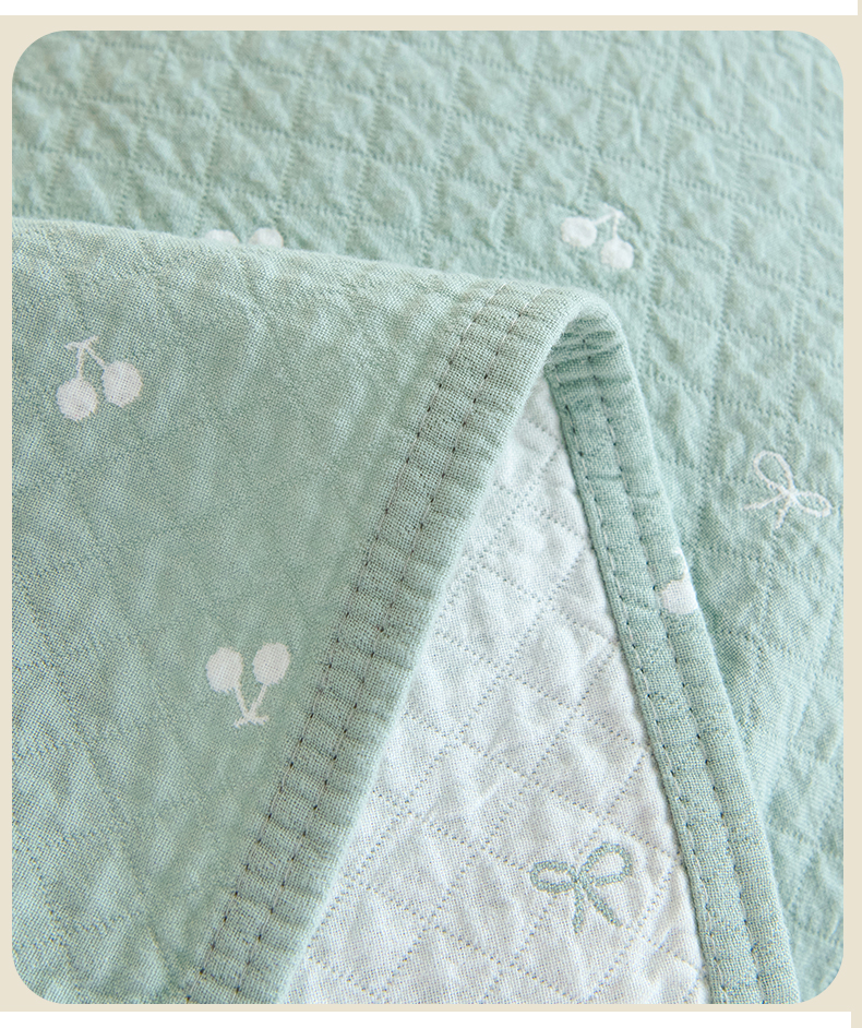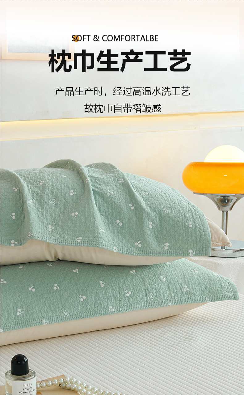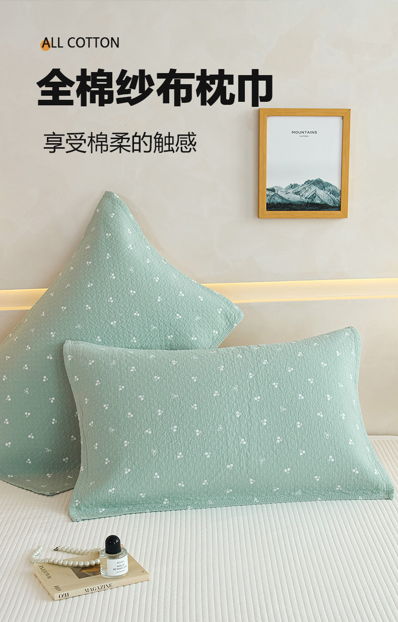 棠薇家纺 2025新款 枕巾纯棉纱布水洗全棉纱布纯棉耐脏吸汗透气预缩水 樱桃朵朵绿