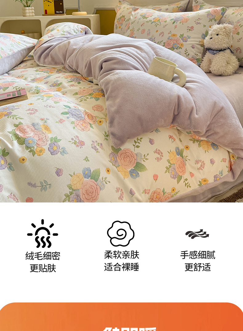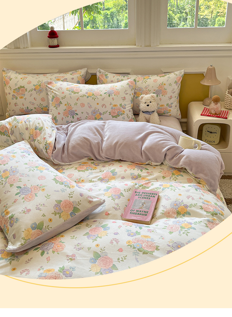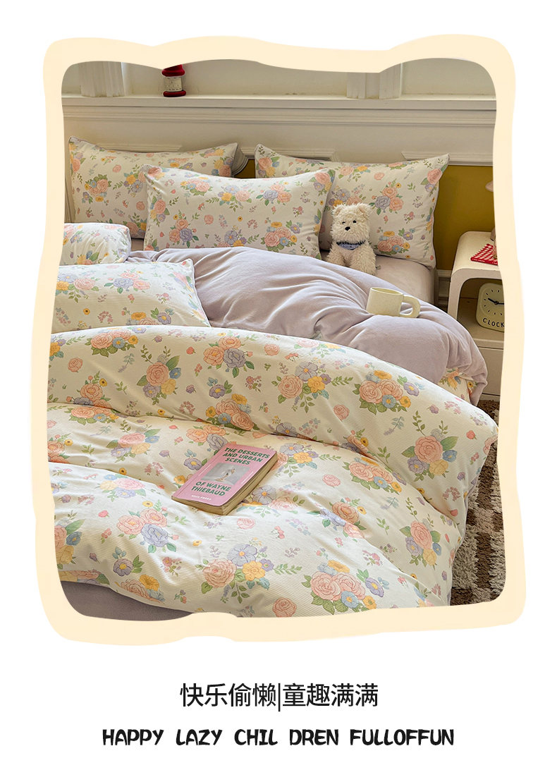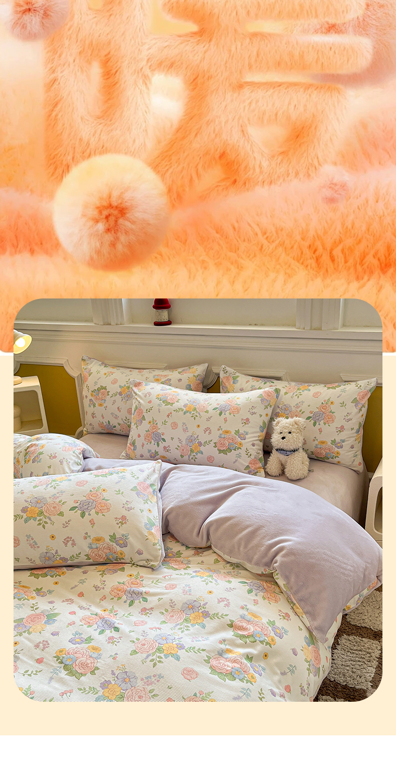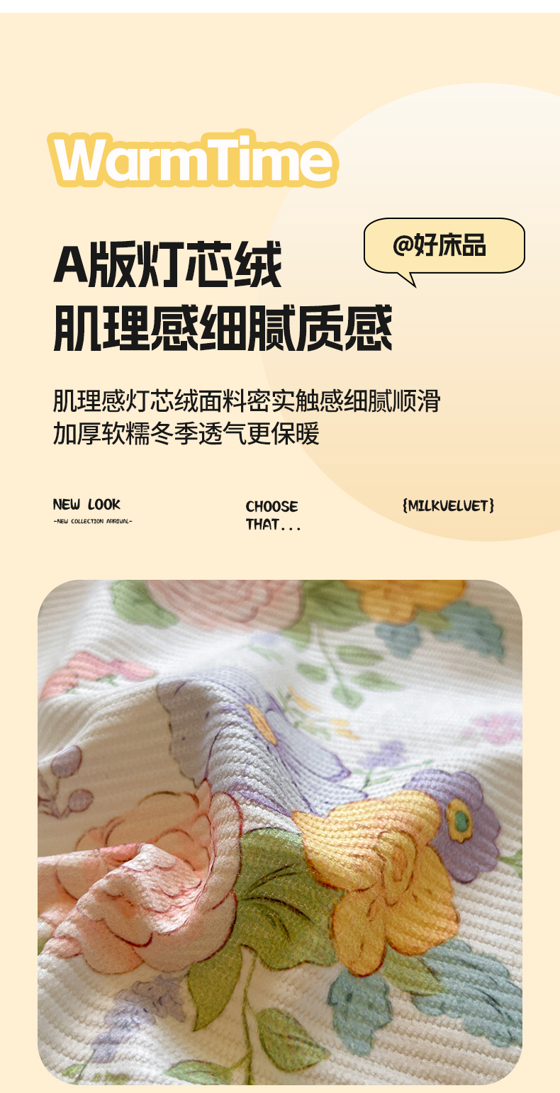 商品名称:羚羊语家纺 2025新款灯芯绒 温暖颂系列-印花牛奶绒四件套高克重简约卡通花卉提花加厚保暖床单床笠三件套(买家秀请联系客服!) 温暖颂-初绽
