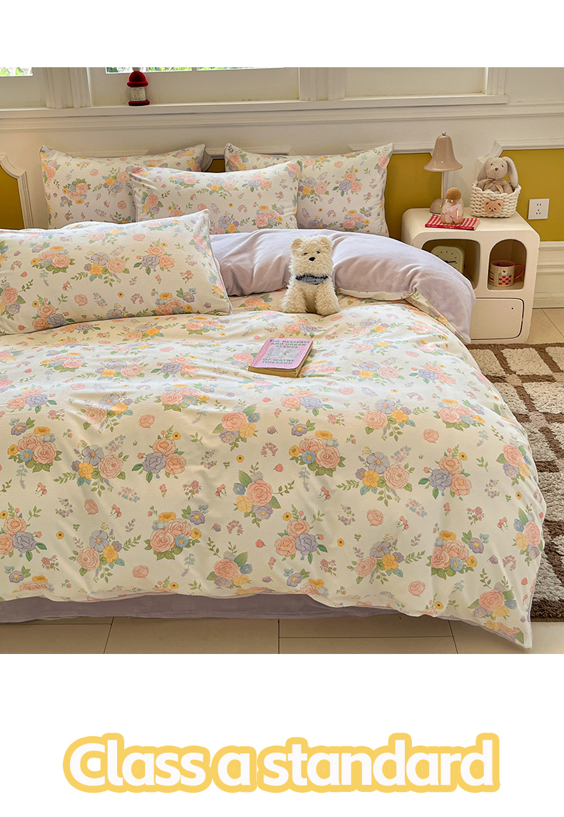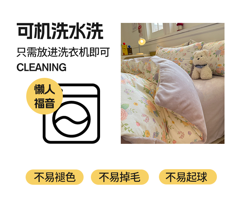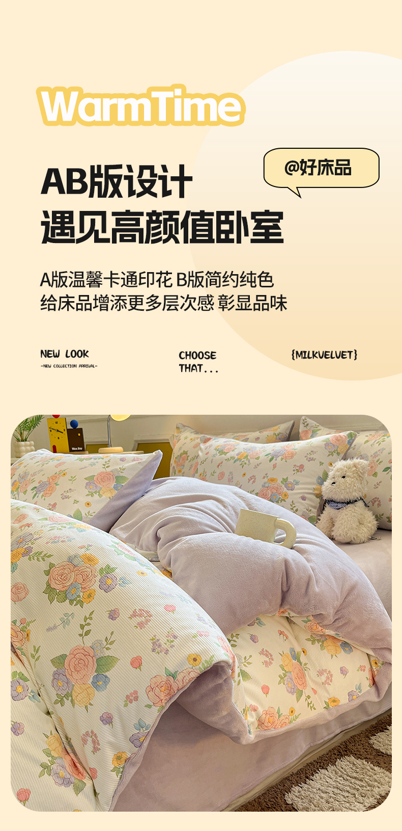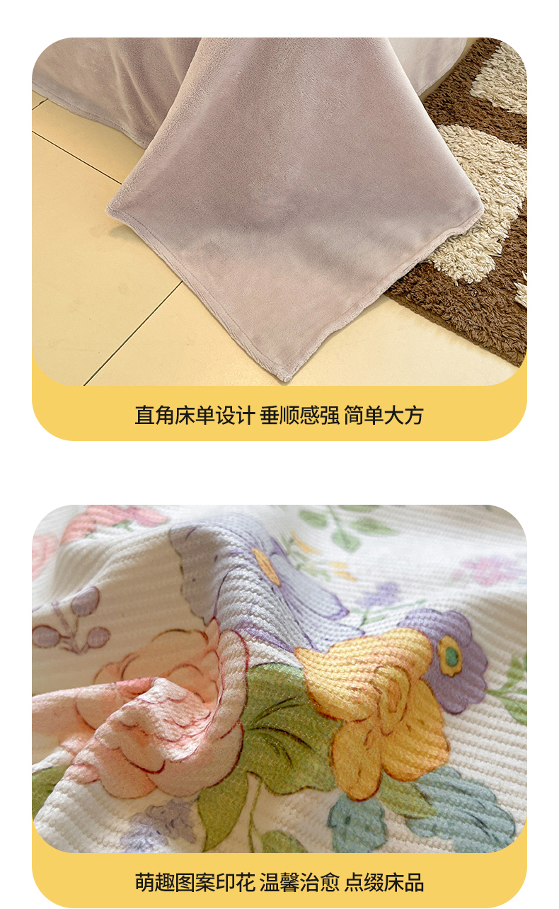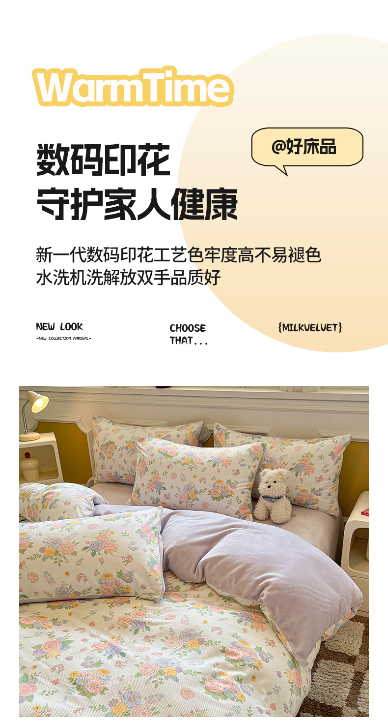 商品名称:羚羊语家纺 2025新款灯芯绒 温暖颂系列-印花牛奶绒四件套高克重简约卡通花卉提花加厚保暖床单床笠三件套(买家秀请联系客服!) 温暖颂-初绽