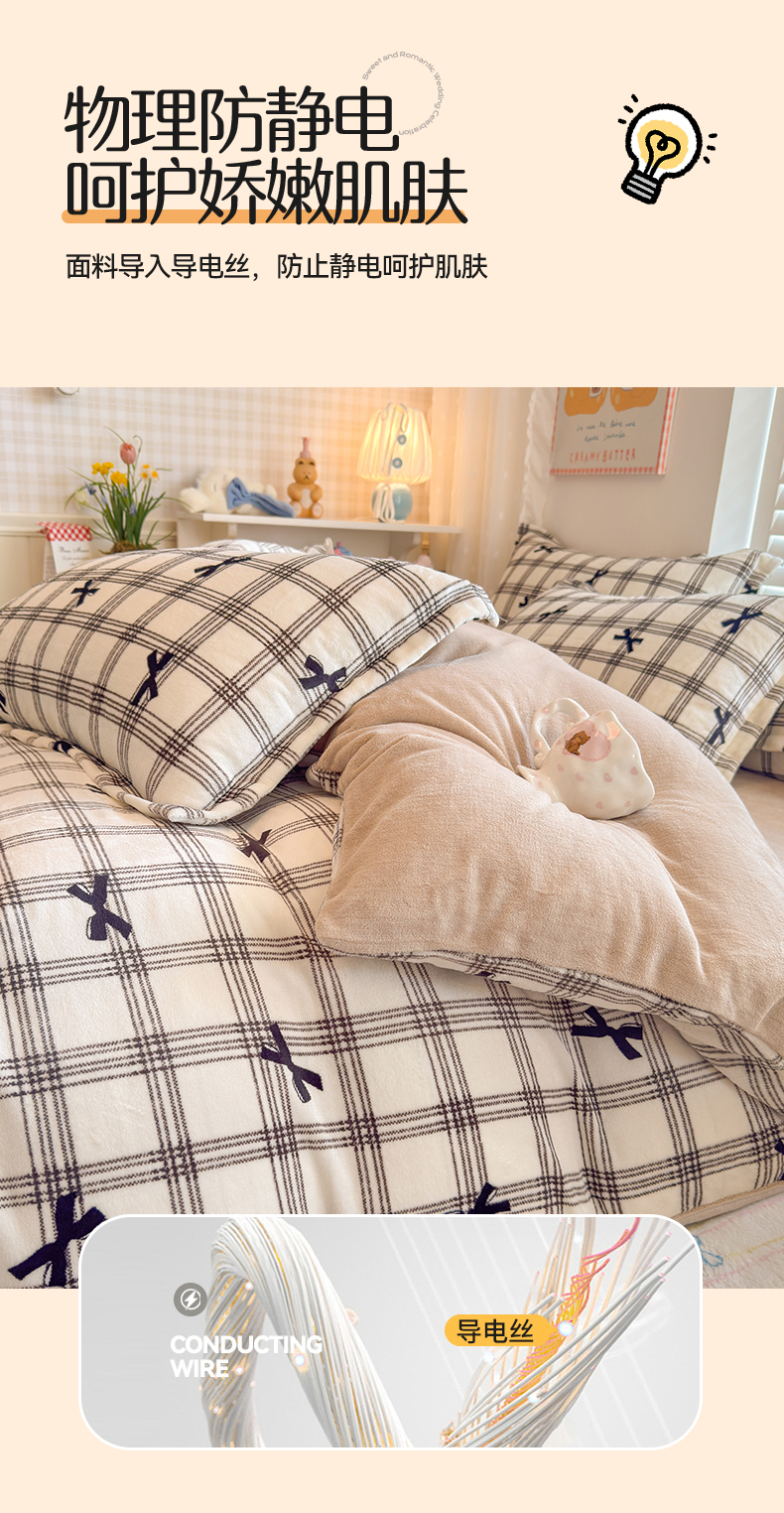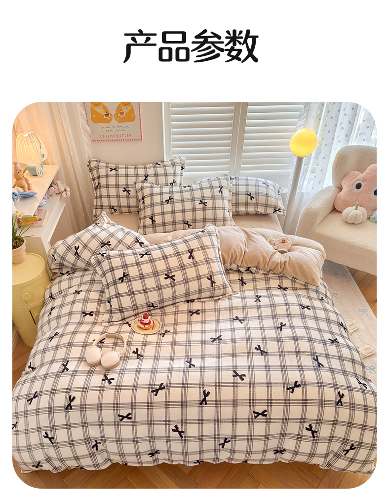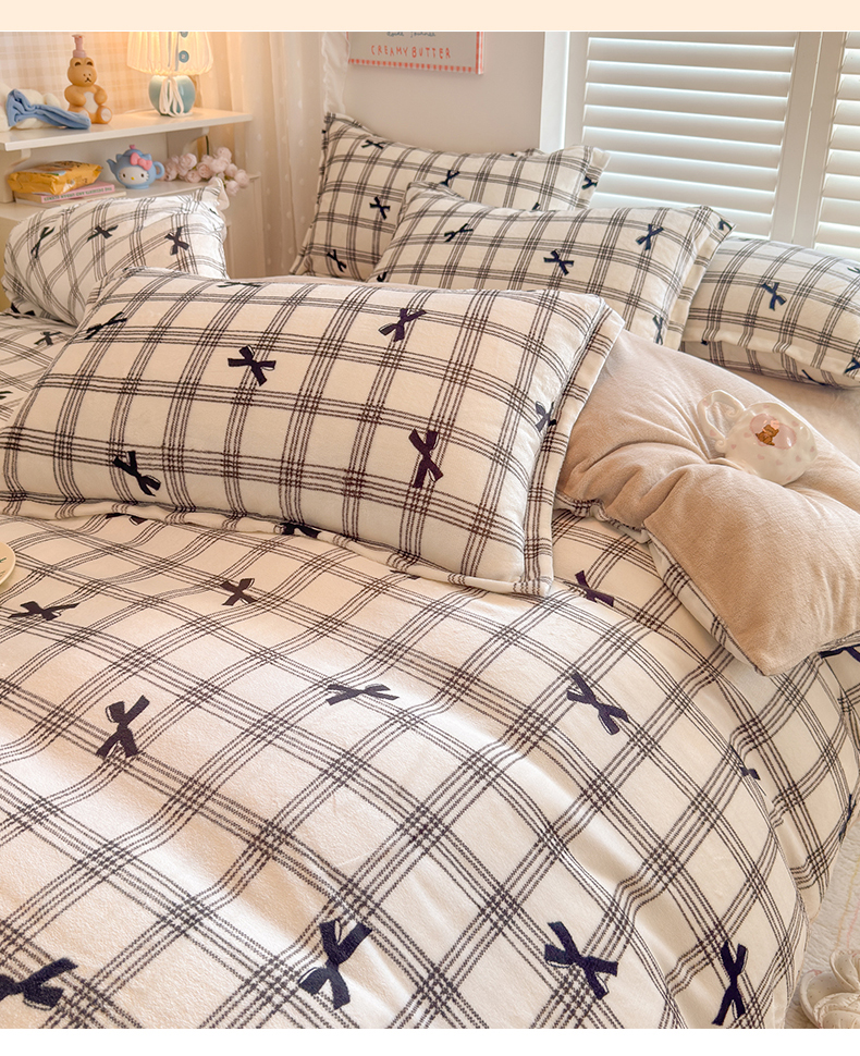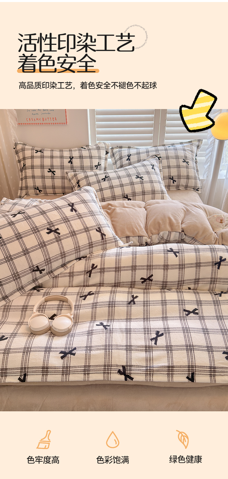 当前位置: 91家纺网 > 商品网购 > 床品套件 > 四件套 > 牛奶绒四件套 > 名兮家居 2025新款卡通时尚风高克重印花牛奶绒四件套 格子蝴蝶结
