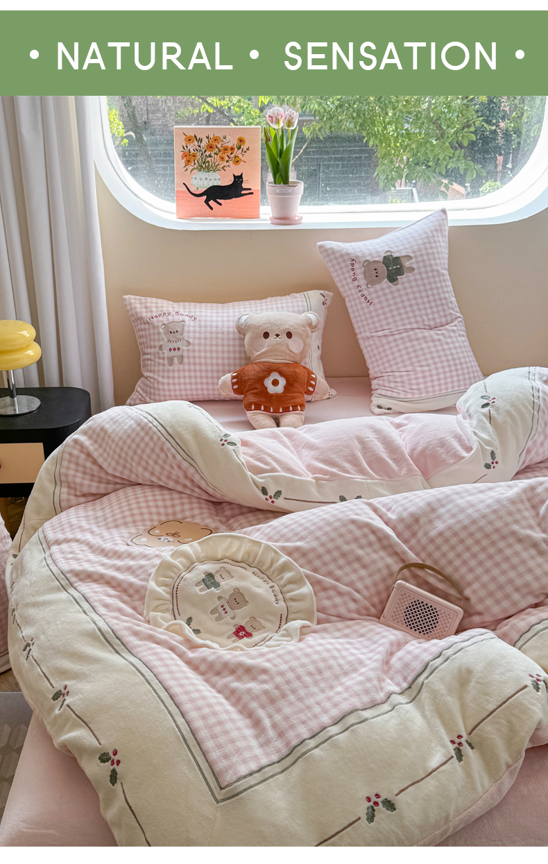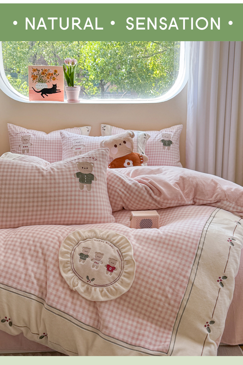 慕晨 2025新款高克重牛奶绒卡通绣花可爱加厚牛奶绒四件套小清新小红书风直播-本本熊 本本熊-粉
