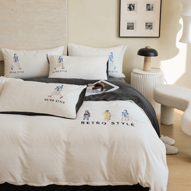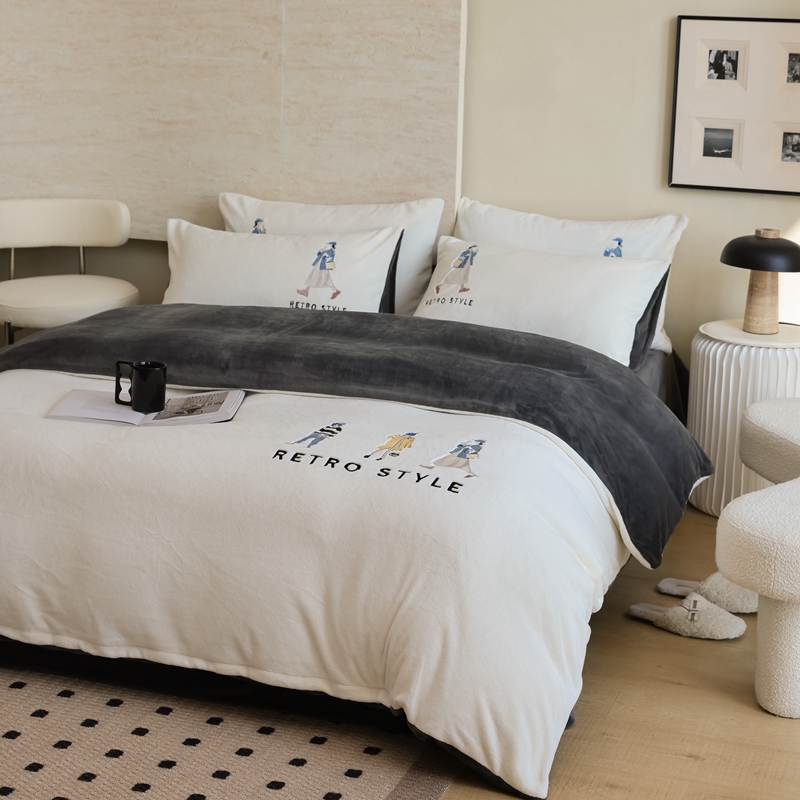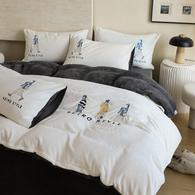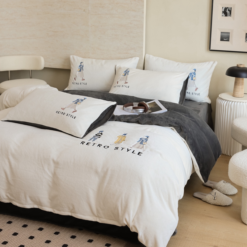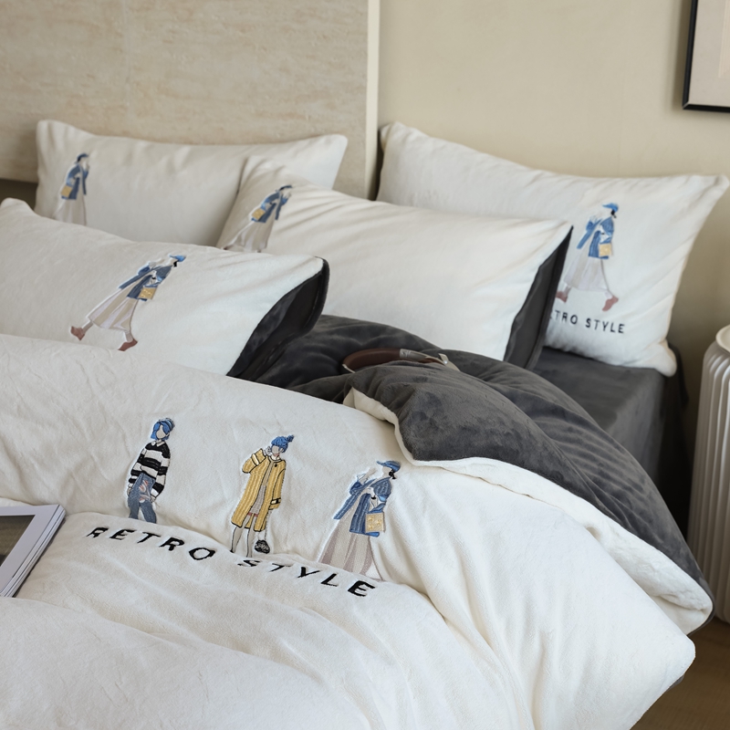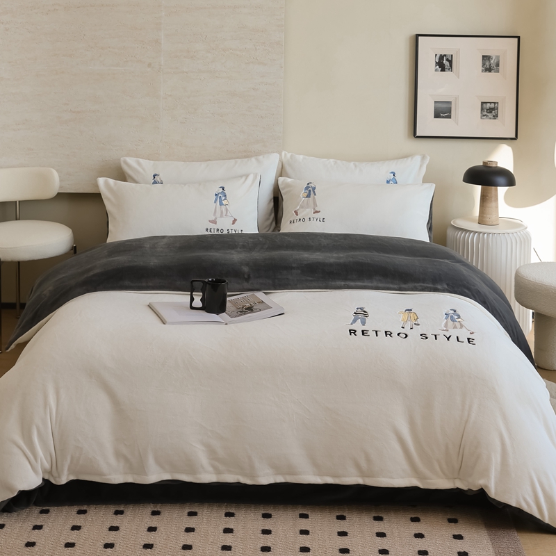 商品名称:121【牛奶绒刺绣四件套】2025新款毛毯被子四件套单件床单被套床笠珊瑚绒牛奶绒冬被法兰绒兔毛绒刺绣男孩-Boy系列场景二 baby-深灰