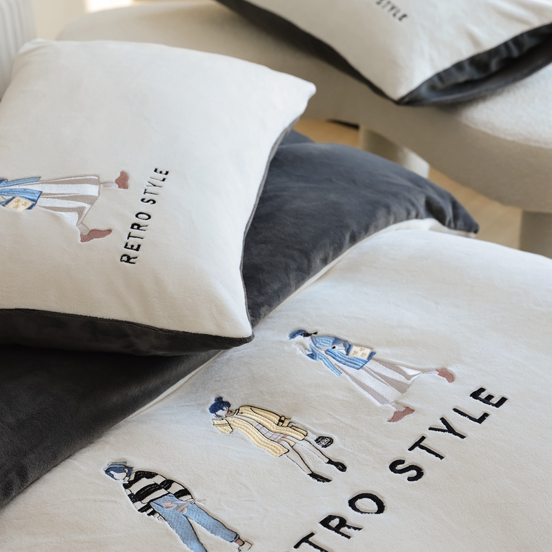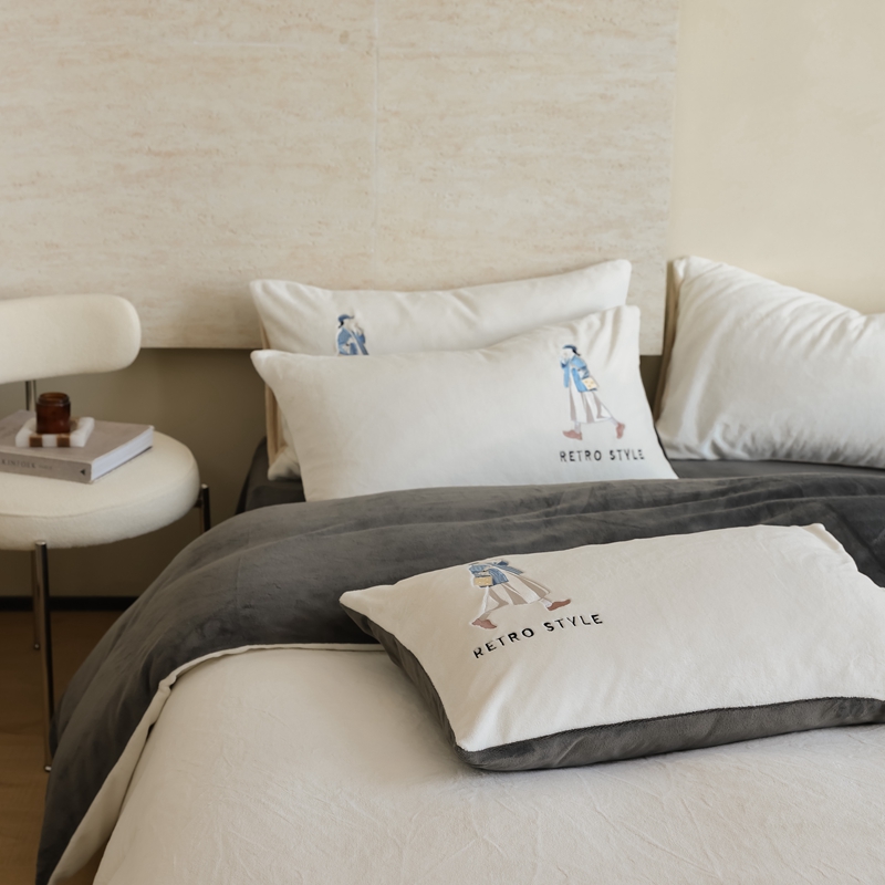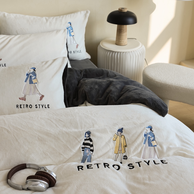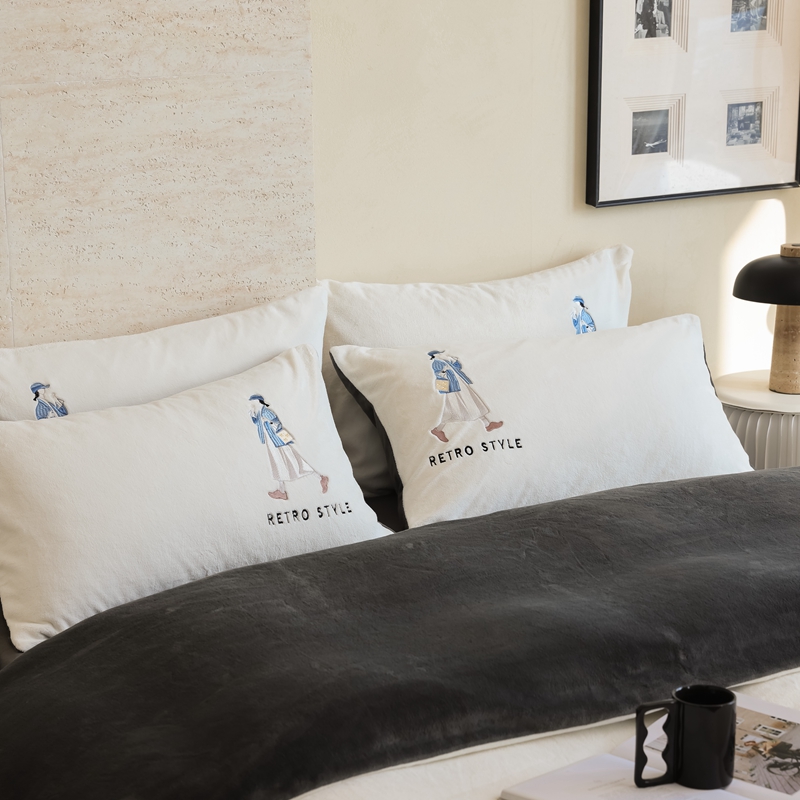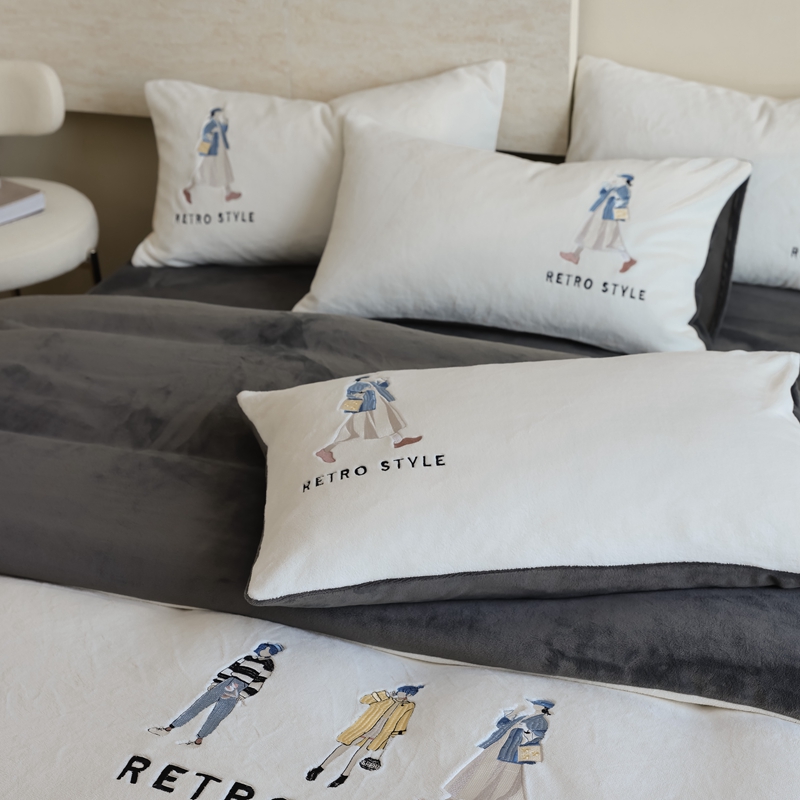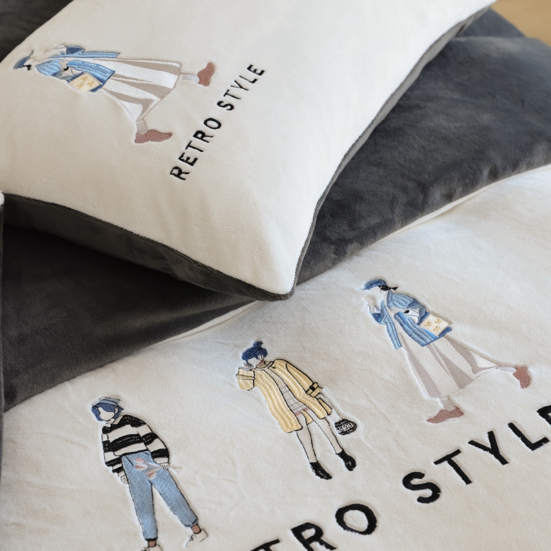 商品名称:121【牛奶绒刺绣四件套】2025新款毛毯被子四件套单件床单被套床笠珊瑚绒牛奶绒冬被法兰绒兔毛绒刺绣男孩-Boy系列场景二 baby-深灰