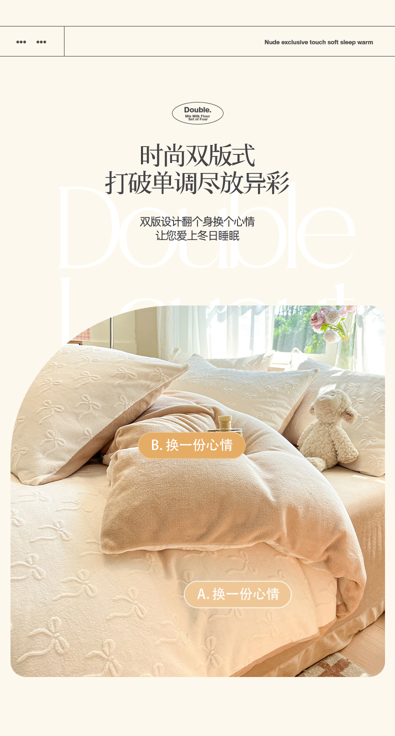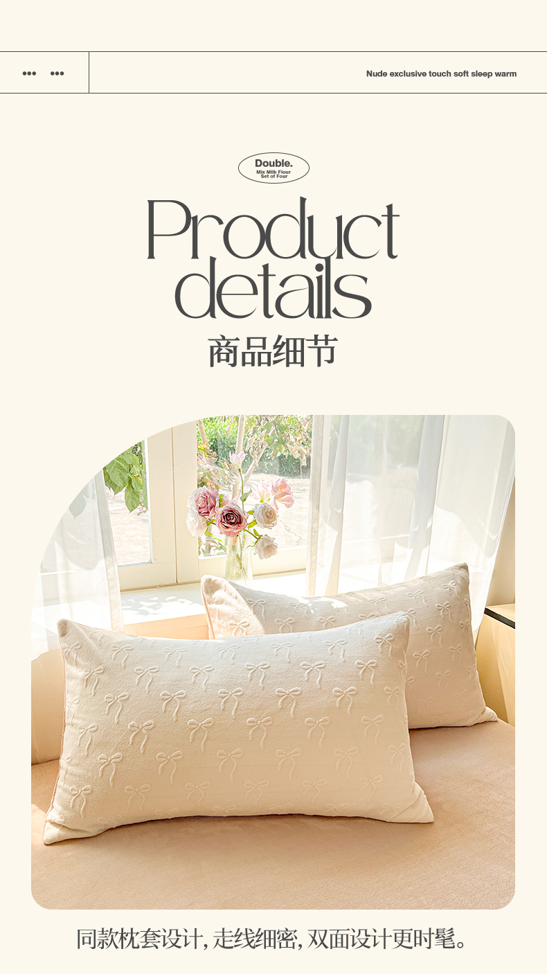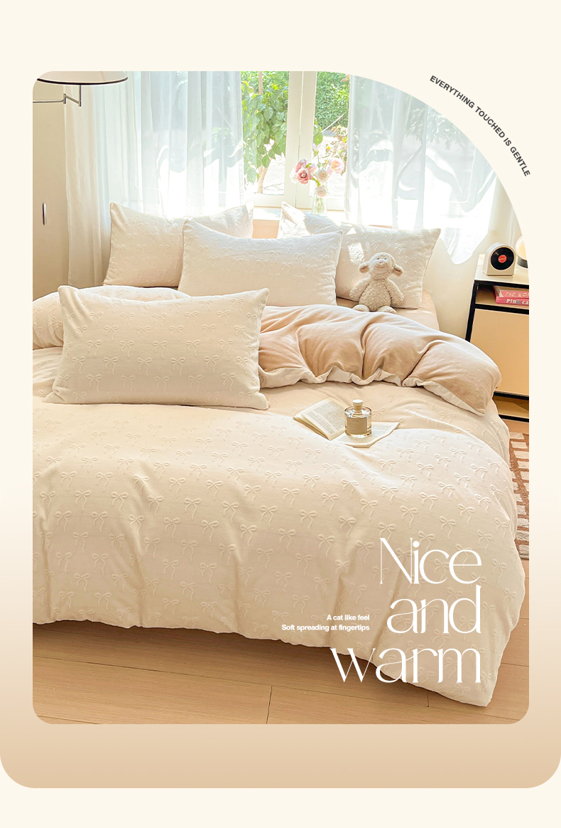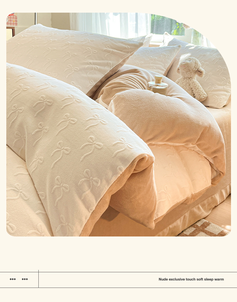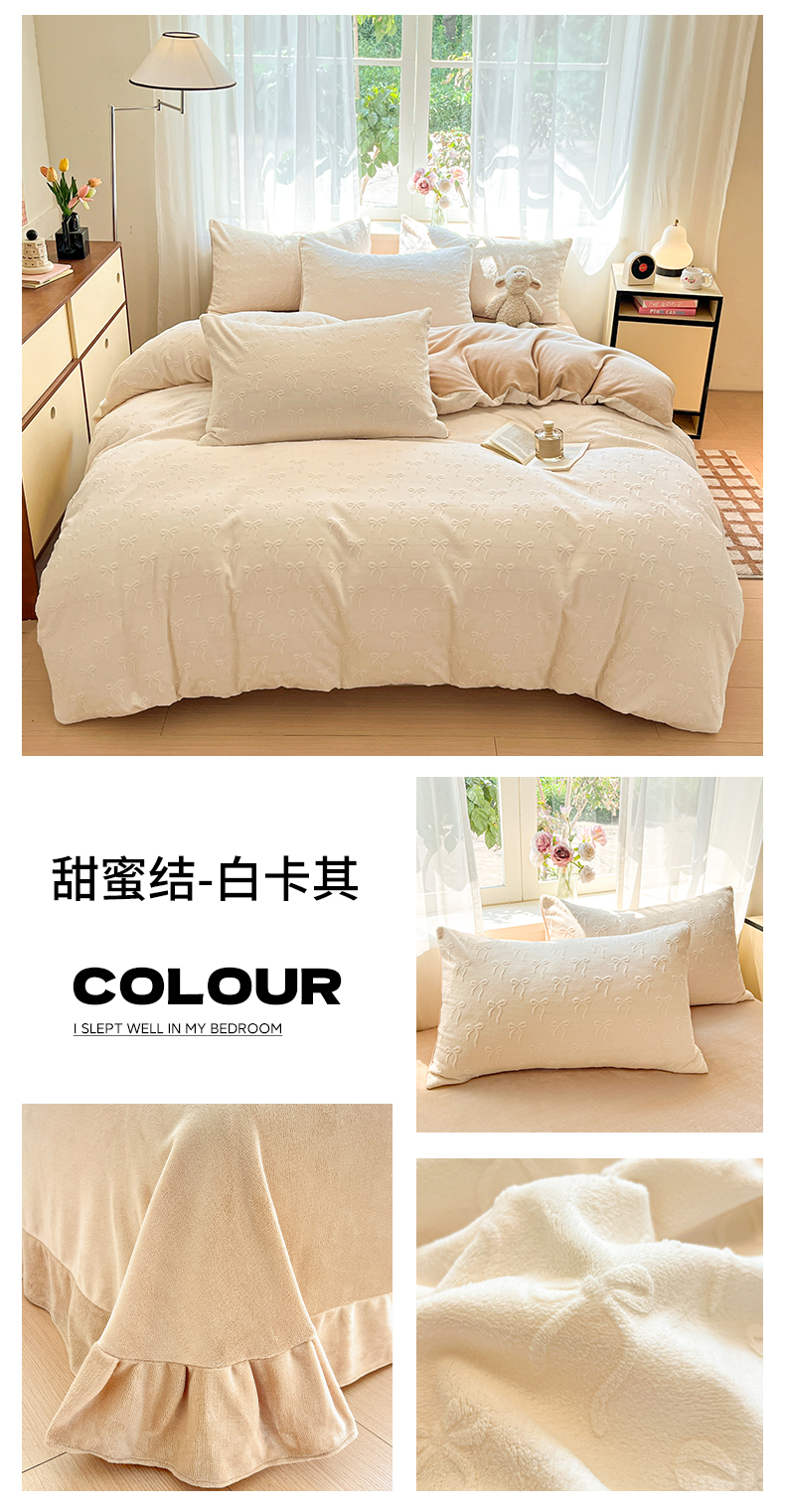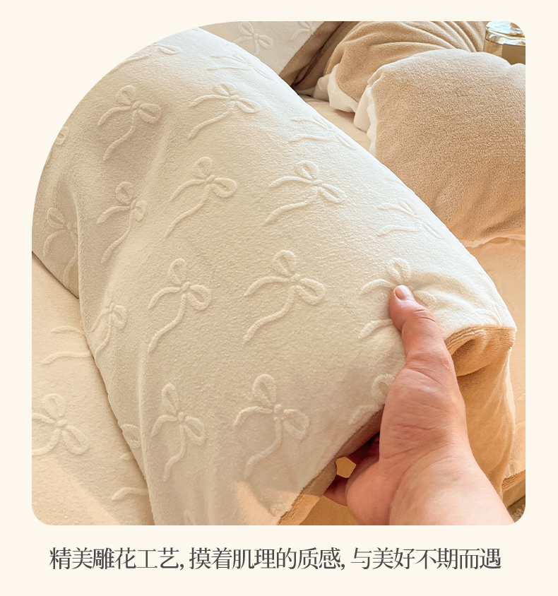 商品名称:绘萱家居 2025新款高克重雕花雕印纯色牛奶绒四件套双拼法莱绒珊瑚绒 甜蜜结-白卡其