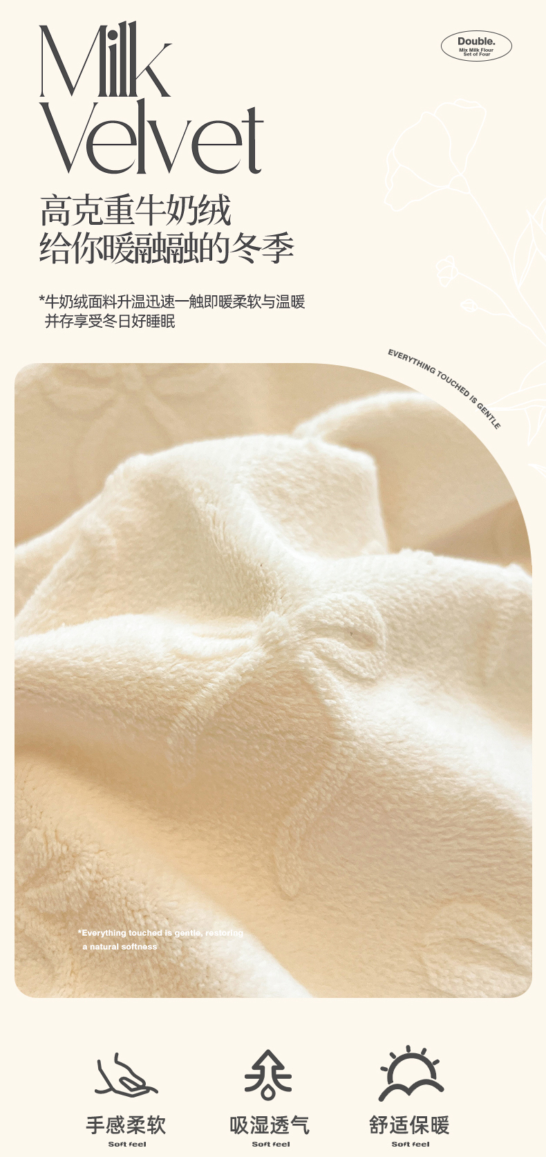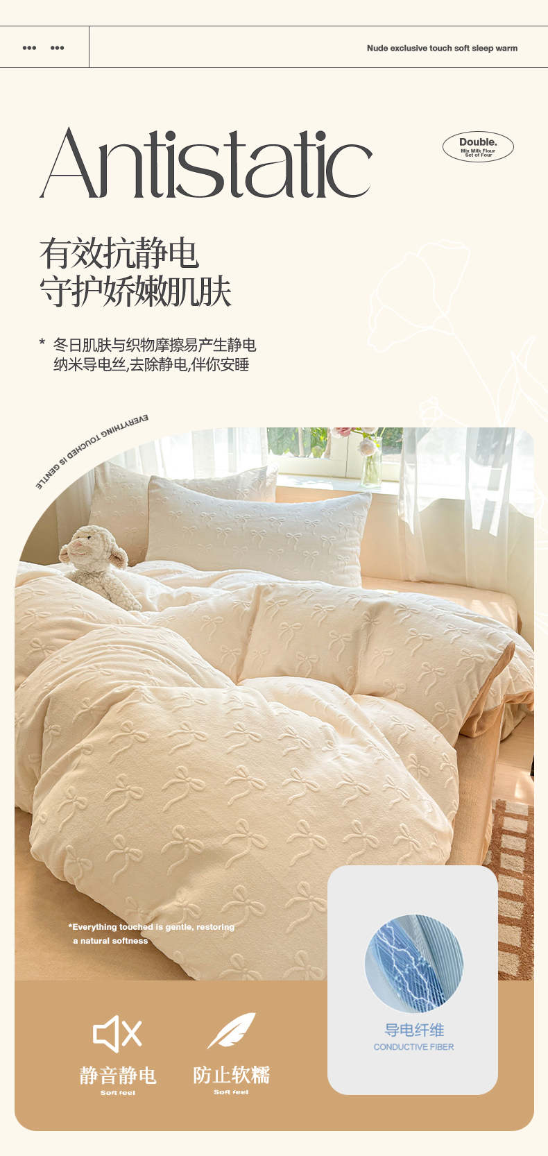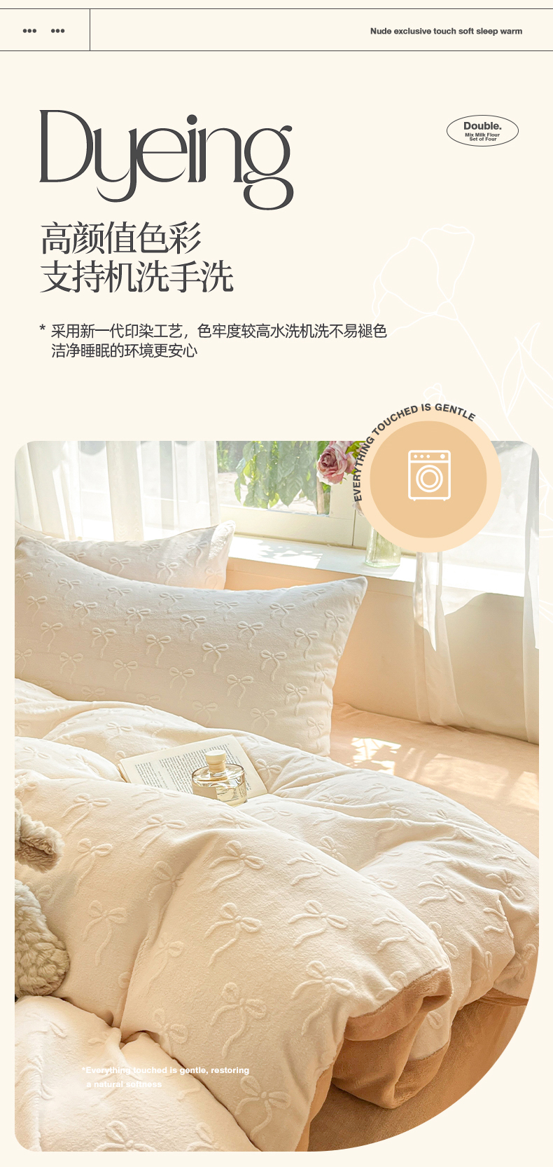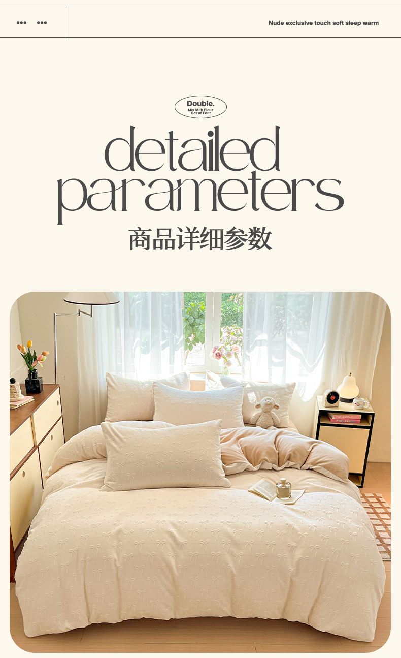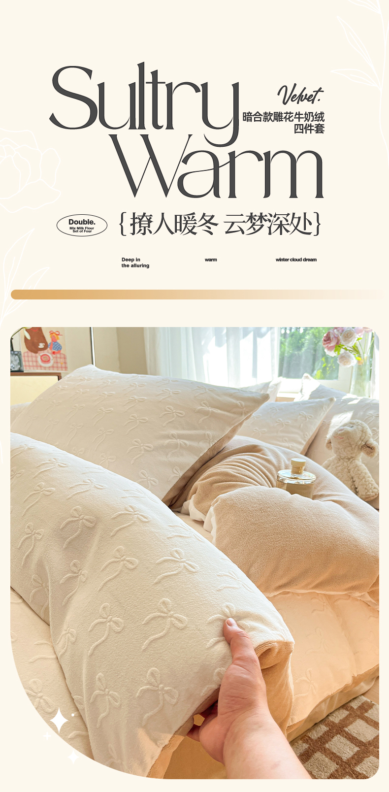 商品名称:绘萱家居 2025新款高克重雕花雕印纯色牛奶绒四件套双拼法莱绒珊瑚绒 甜蜜结-白卡其