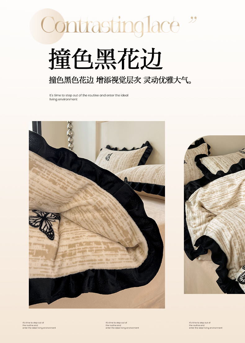 逸林家纺《原希尔顿逸林》 2025新款法式黑花边牛奶绒四件套韩版花边法式赫本风牛奶绒四件套爆款 牛奶绒-法式蝴蝶