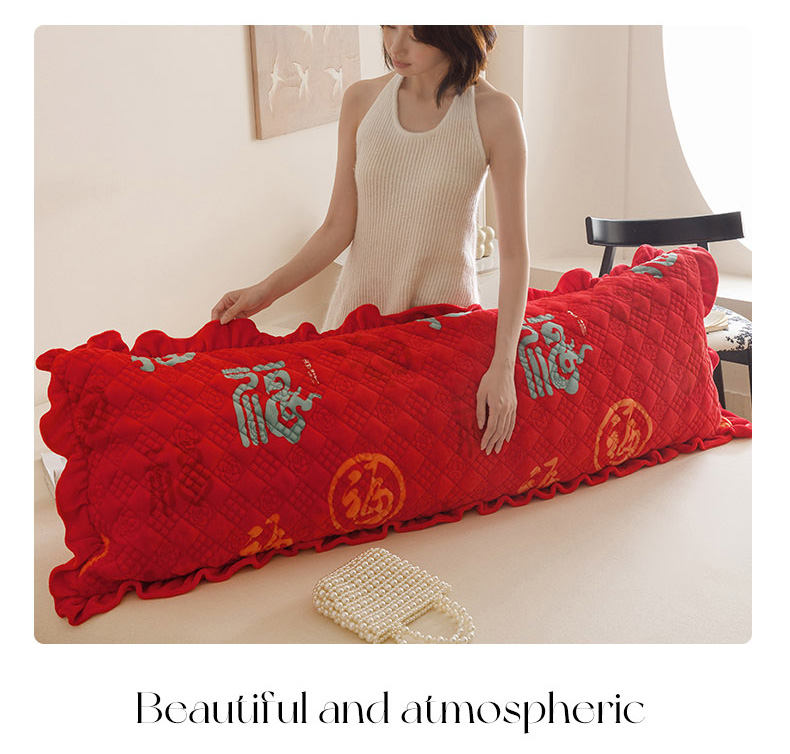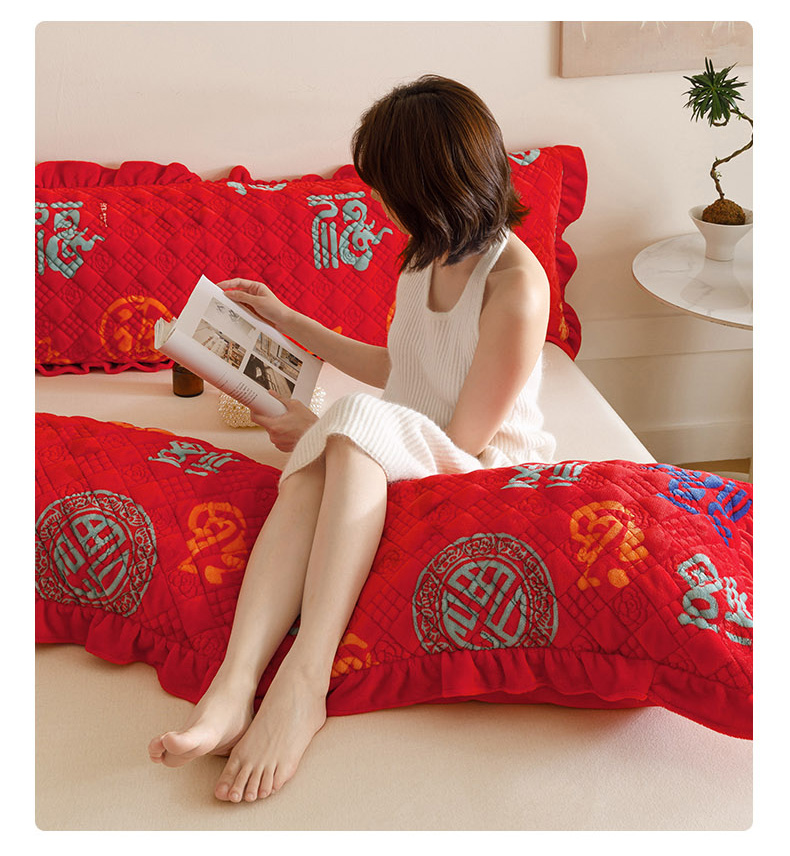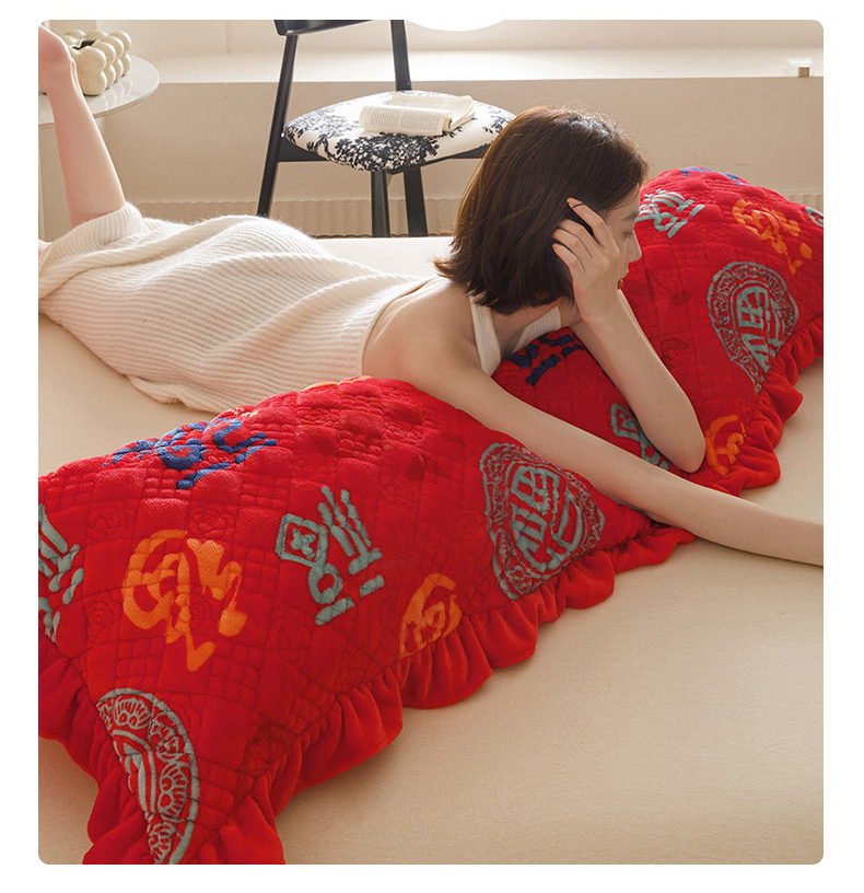 爱港家纺 2025新款牛奶绒夹棉衍缝长枕套 红满福