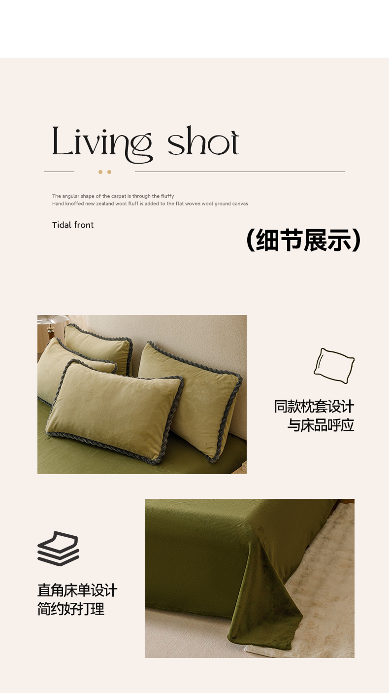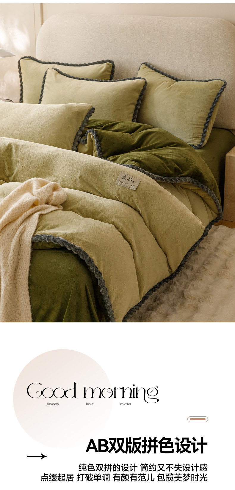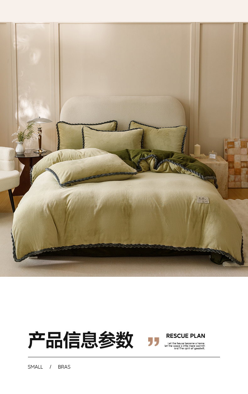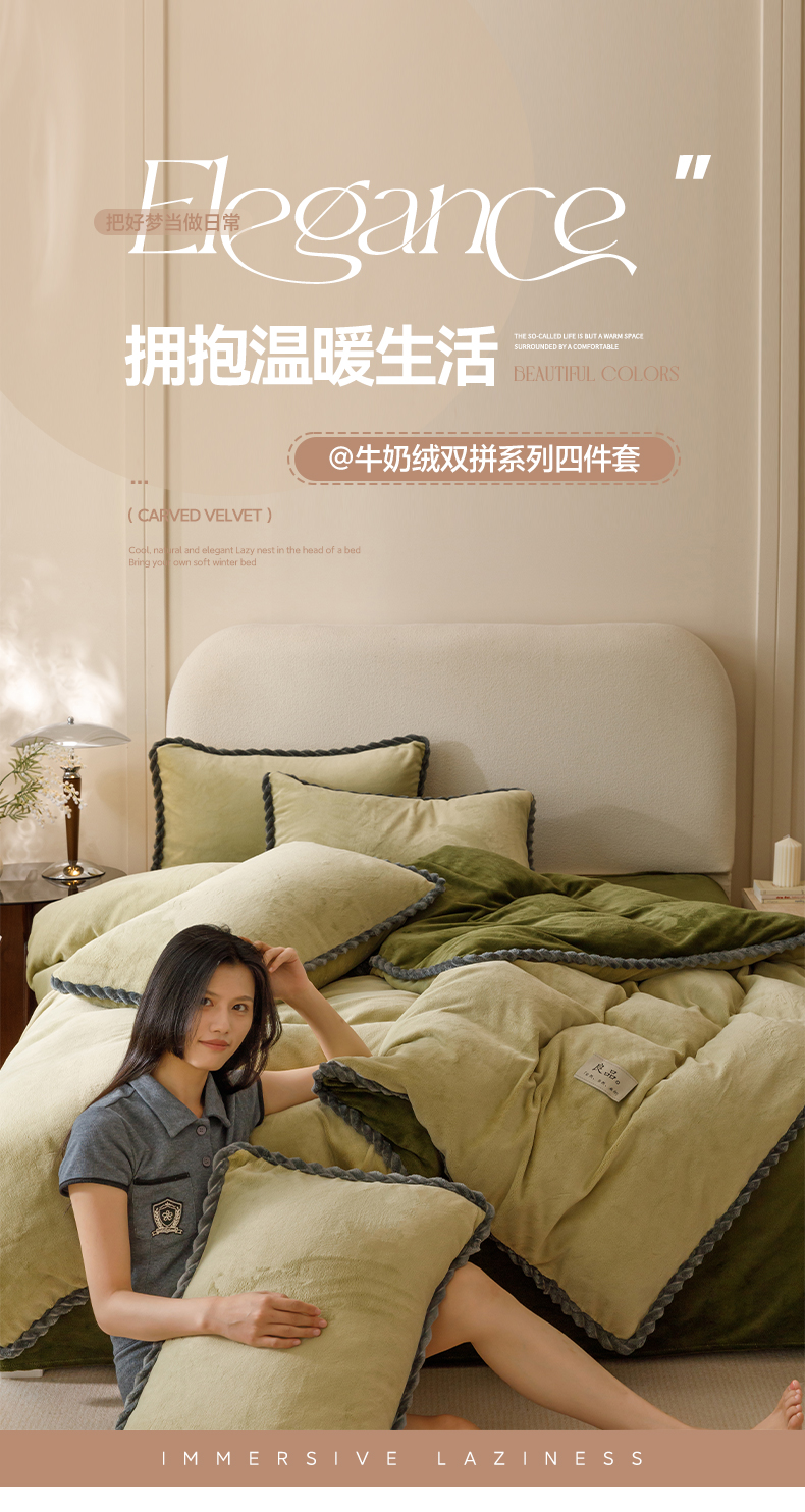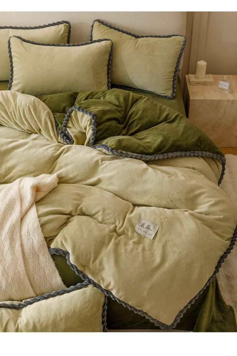 商品名称:早晨家纺 2025新款牛奶绒双拼四件套 双拼浅水绿+橄榄绿